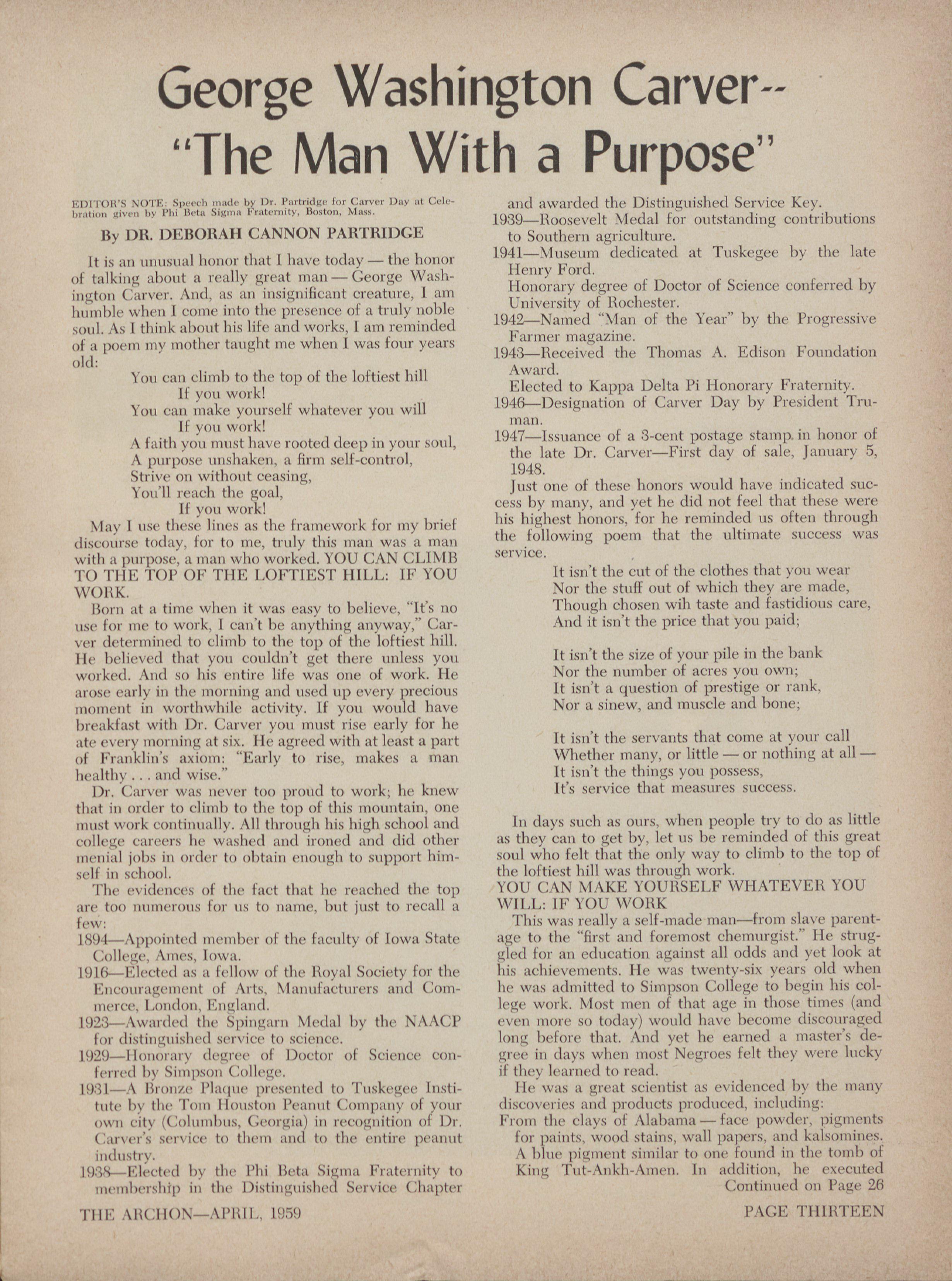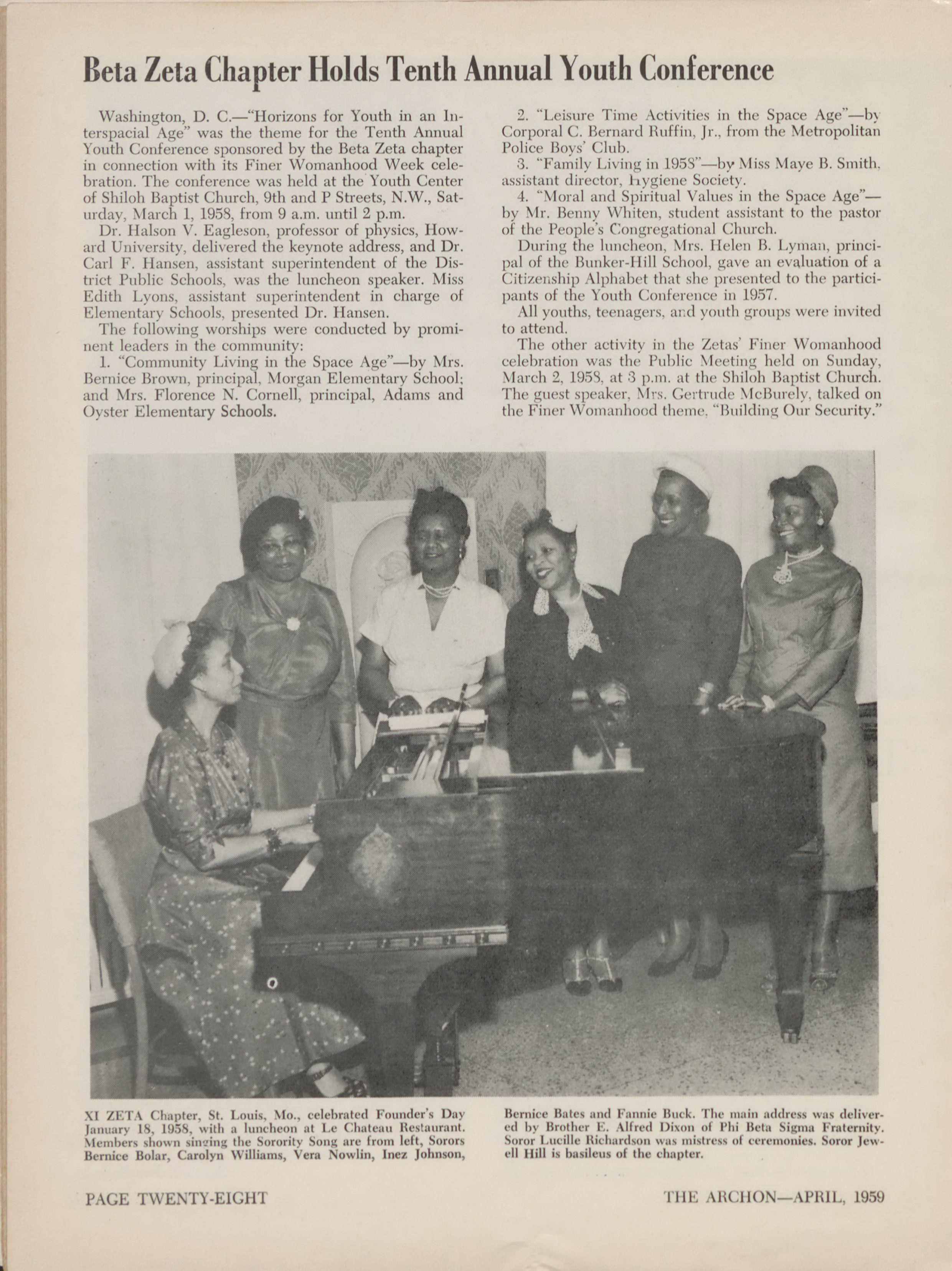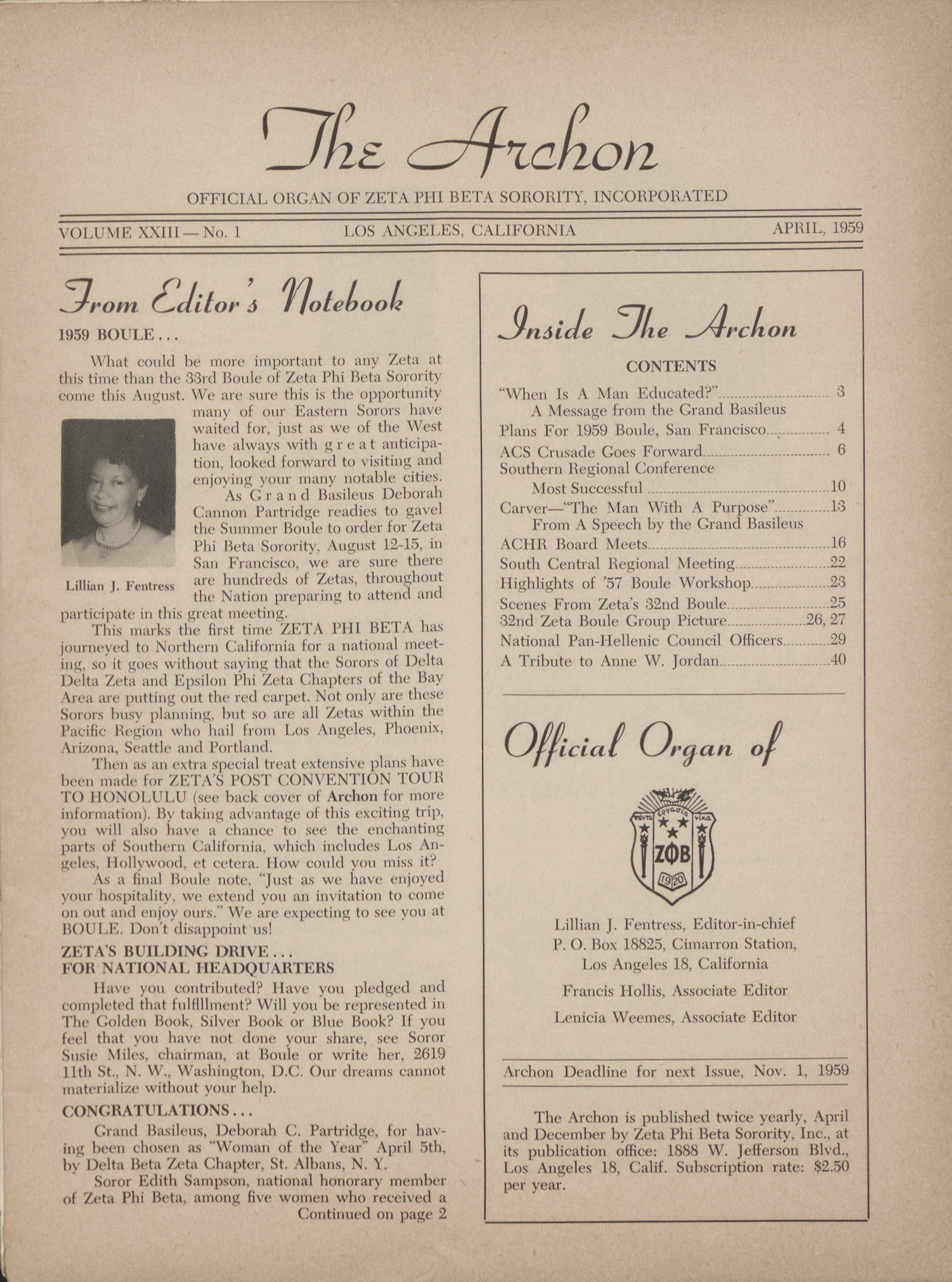 The Archon is published twice yearly. April Crand Basileus, 1)(4)(11'ah C. Parb·idge, toi htiv- and December by Zita Phi Bita Sorority, Inc., at •tff ing bren chosen as "\Voman of the Year" April F,th, its publication office: 1888 W. Jefferson Blvd.. by Delta lic·ta Zeta ( 1,1~1)ter. St. Alhani N. Y. Los Angeles 18, Calif. Subsci-iption rate: 82.50 Soror Edith Sampson, mitional 11(,11(,1-:11-y member per year.