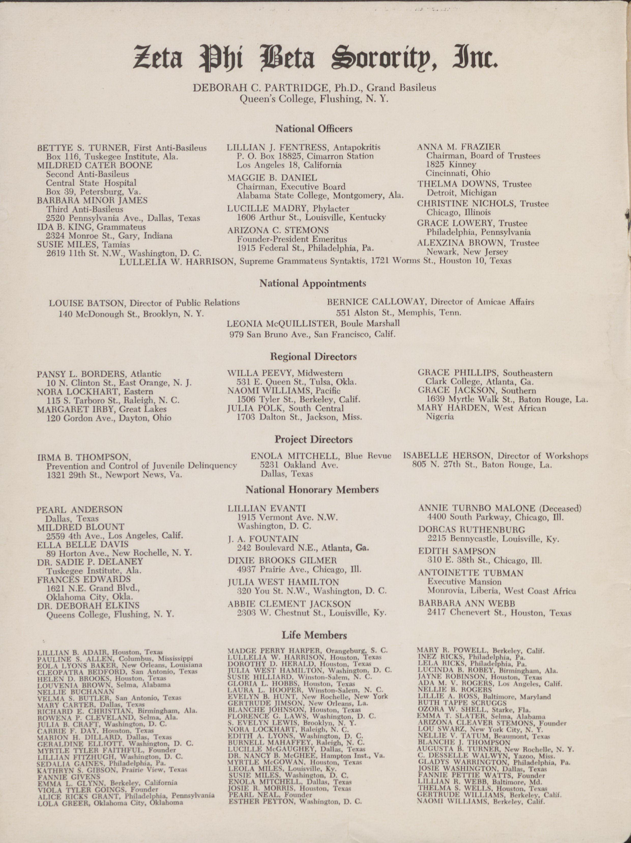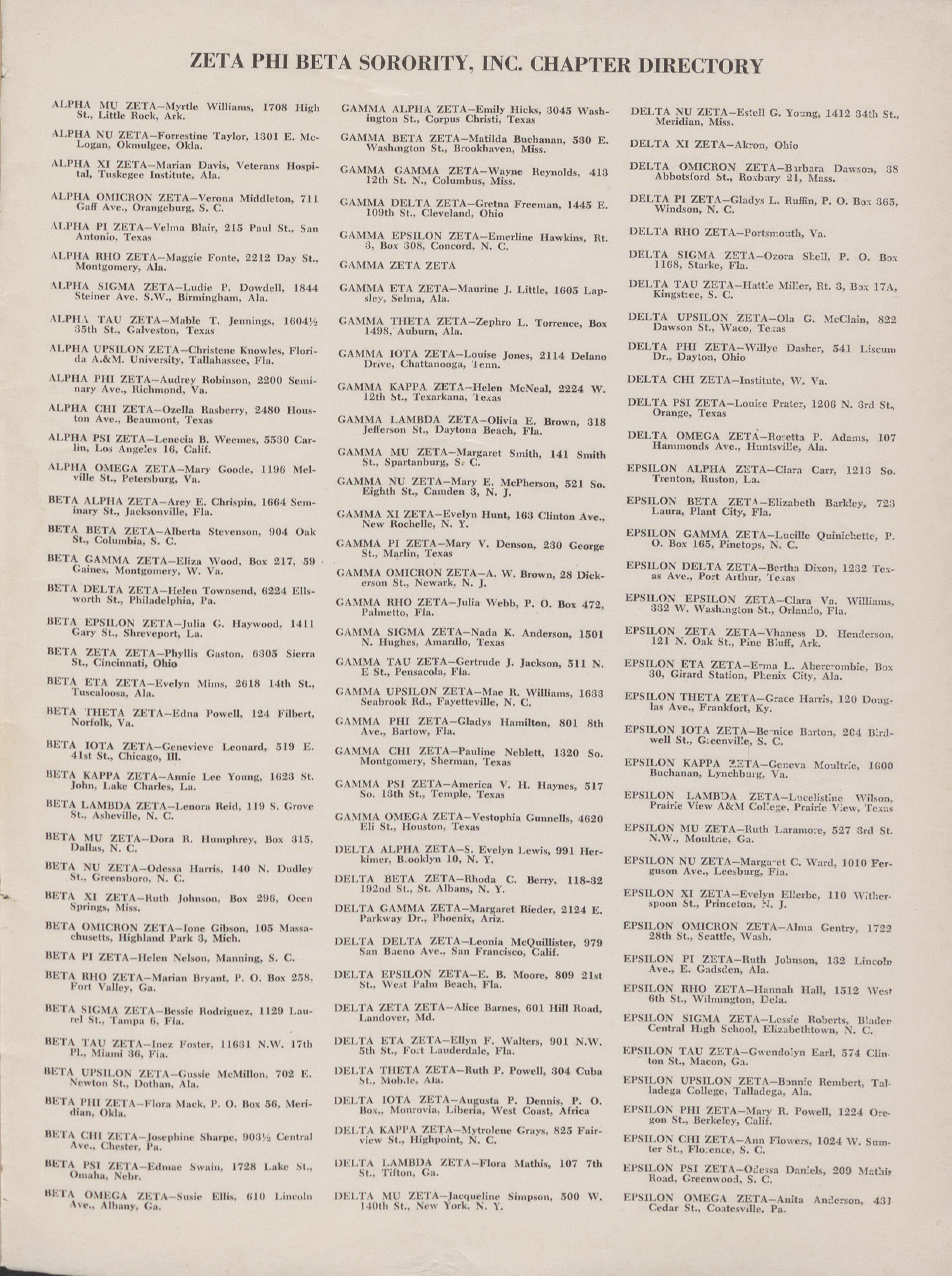 EPS[l.ON KAI>PA ZETA-(:cr.eva \10:,IN<e, 1600 111.1'A k \15],A /1('1'A- Annic· 1.ci· 3"ing. 1623 St. Buch:inan. Ly„ch!):ng, Va. John. Lake (h,trl„. I.:i. G \ Al\! \ 1>Al ZE'fA-America i. 11. 11,ayncs, 517 50. 1:;Ih >1.. Templi·. '1'c·,11' 1'1'Al[.ON LAMIE)\ ZETA-Lucelist;ne 1/'ikon. 111<'1'\ I.ANIHI) \ /,ETA-] en,ra ItchL 119 S. Grove Prairh· \New AN \1 ('i]I<·Ce. Prairie 1.t·.. '1, ...4 Sl., As]~eville. N. C. (,A'IN!\ 011](GA ZE'ILA--1'<·.tophia (.mmells, ·162/1 Eli St., Houstoli· lexah EPS)LON MU ZE'['A-Ruth Laraine:e, 527 Sn] St 111(01-A MU ZE'11-1)„ra R. Humphro'. 110\ 11.3. N.W., Moultric. G.i. 1).111.h, N. C