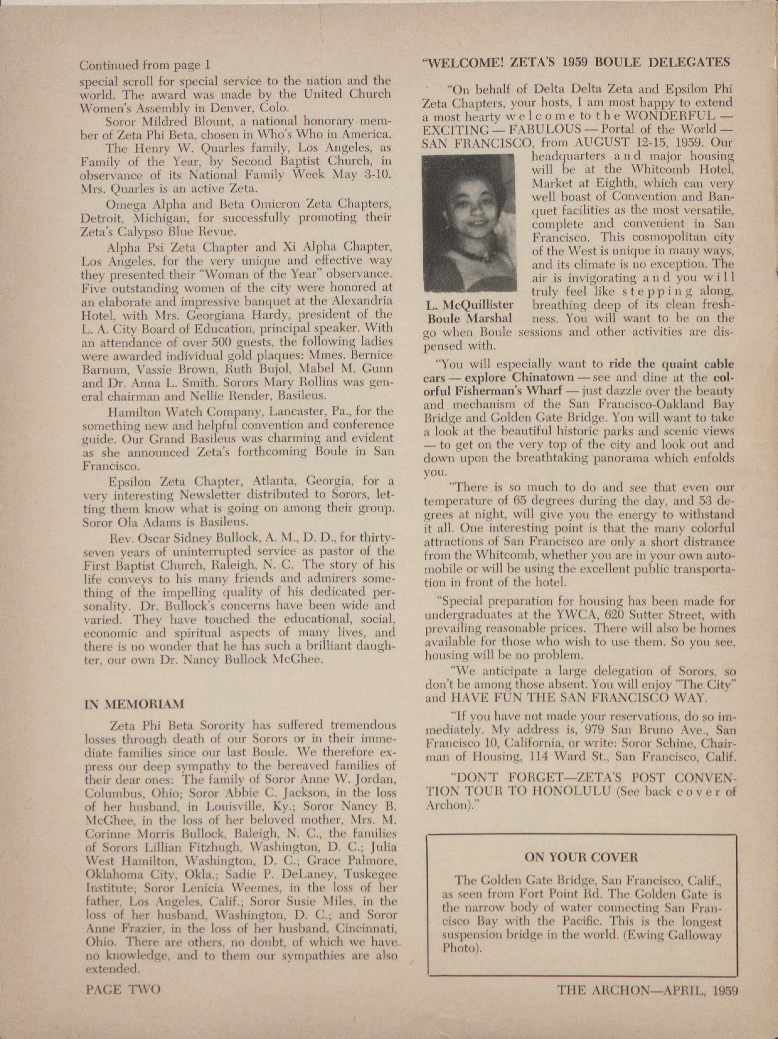 Continued from page 1 "WELCOME! ZETA'S 1959 HOULE DELEGATES special scrc,11 for special service to the nation and the world. The award was made bv the United ('11,irch 7),1 behall- of Delta Delta Zeta and Epsilon Phi Women's Assembly ii, Denver, Colo. Zeta Chapters, your hosts, I am most happy to extend Soror Nlildred 111(,tint, a national 11()11()1'iti+y mem- a inost hearty w c 1 cometi) the \VC)N1)EllI''tj Lber ot Zeta Phi 13<ta, chosen in Who's Who in Amet-ie,1. EXC]TING-FABULOUS -Portai of the WorIclThe Henry \V. C):iarles family, Los Angeles, as SAN Fit.ANCISCO, from AUGUST 1:2-1,3, 1959. (hu· Family of the Year. by Second Baptist Church, in headquarters .1 1 1 d majar housillg observance of its National Family Week \lay 3-1(). will be ut the \Vhitcomb I lotel, \li s. (hailes is an actiu· Zeta. \[arket at Eighth, which can very wcH boast ()1 tionvention alld li,111- C)inega Alpha and Beta ()illier<)11 Zeta (.'hapters, quet fiwilities as the inost versatile, Detroit, NlichigaH, fc,r successfully promoting their gmq)lete and convenient ill San Zeta's Calypso Blite Revue. tr:,lic·isco. This cosmopolitan city Alpha Psi Zeta (lapter und Xi Alpha Chapter. 11 the West is unique ill many ways, Los Angeles, for the very illii(111(. and ellective way 11(1 its Clihinte is I:(} c\(pi)tion. The they presented their "Woman of the Year" obsen'unce. Hil' iN ill\'itic)l atilig 11 11 d >*(HI Wili Five outstanding women 01 the City were honored at b Iily fi·el like stepping along. 1111 4,11,1,(,rate :111(1 ilii[)ressive balicluct at tlic• f\1('xaliclria L,. N·Ic(,),]illister !,reathing (1(·(,1, (11 it+ c·!can freshHotel with Mrs. (:Corgiana Hardy. 1,1-(sident of the Bolile Marshal ness. Yon will waitt to be on the L. A. City Board of Ed,icatio~, principal speaker. \Vith go when Hoole wisions mid other activities are (liNan attendaiice of over 500 guests, the 1(111(iwing ladies pensed with. were uwarded indivicliml gokl plaques: Milics, Bernice Barmim, Vassic Brown, litith Biljol, Mabel 11. C ilim "3(11: will (·speci,113>' want to ride the quaint cable and Dr. Anna [.. Smith. Sorors Nlary Rollins was gen- cars - explore (:hiliatown --we and dine at the colcral chairman and Ni·Ilic licmder. Itilsilcus. 01-ful Fisherman'% Wharf - Dist (lazzle over the brant> ,21,(1 11Irch:,1Ii.Am of Ilic· Sail 141-iwicisco-():ikland Imy Hamilton Watch Compativ, 1.:Ii,caster, Pa„ fc)1- the Bridge mic| Gc)1(1(ii (iate Bridge. You will watit to tai«· sonwthing new and helpful conventic )11 and Conference a look at the beautiful historic parks mid scenic views tillide. ()111 Cit-and Basilt•ils was channing and trident - to get on the very top (,1 the city mid look (}tit and as she announced Zeta's ft,1-theoming lic,ttle in San down upon the breatlitakitig 1):111(,1 :lina which i'llf(,Ids PrallciSCH). V()11.