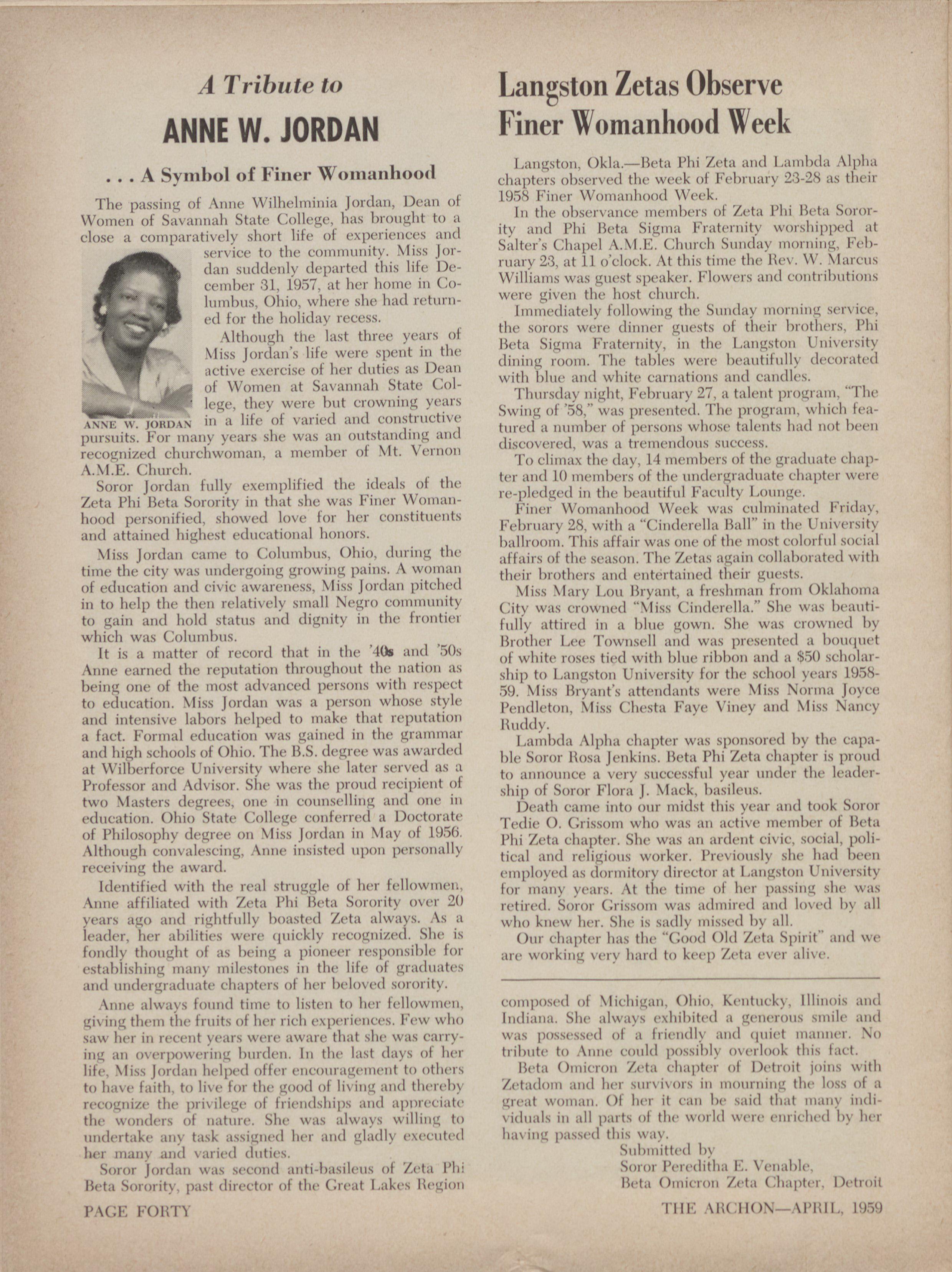 1.(ist Rites jor Anne \F Jordan -Atic)]tic>' 1'7m~ii(·c I .ticits (second firom left). 1,1 .lamitica. New York, iia. recipient of the If).38 Woman of the Year Award. C 'c,ittimied from Page 43 prewented b> t|w |)cha licta Zet.1 (:11,11)(ter of Zel,1 Phi Beta Sororit' St. All),:,1+, N. Y. This ('IMI)ter uns added to Zetadoin t(11(littice. the section reserved for Zetas was filk·d. lii,w 01 1$)57. Sllown Ilanking Miss Li,cas, from left. are Mis. Bishop I laitcher of the A.M.E. Church of which 1 <innic Pellic \\':lits, one 01' tile h,under. 01' (he 401·Ority; Dr. 1)(·11(bral, 1'.Il·tndge, (haild Basilcir,; Airs. Hhodii lierry, b.,sileus; Anne was a member. conducted the service. \Ir. titid Ali., .,\11,i·rlit Alslim, anli-|,aNile·„s. A most inspiring address (:corge Valentine, secretary of \Vilberforce University. u·,1% glicil M 1)1·. 11,11-tr+idge alitl mlisical selections %5'cre ren- spoke of :\mic first as a shident at Wilberforce, then (Ic·red b>' talcitted youths 01 Jainaica. as a teacher. Dr. AriNman of ()hio State University. Memphis Zet:is who was Antic's advisor for her Ph.D. degree, spoke of .Anne as a sincere imd oulstandi.g student at Ohio (:c,litililic·(l h'om ]':ilic' 18 State Unhrisitv. 1)1·. Andrew I. Hargetty spoke of al -1 1).in. There were 19 happy patimilA cHic,>il'g the Amie as a Kincere and kning Dcan of Women ·it xii,gitig and st(,i·y-telling of Sorors \lanae Stanback. Savannal, State (1)!lege. llc called her a good Chris- Al:Ngic' .b)1'(lan. (:elia (71:tplin, 11:lzel 14'les. Sal'u 1 )i,(11I .iticl lici iiicy· ( :allawav. ,,\ 1,(1, (,1 storv-hooks mid t,imi womai, whose light will alwilys be shining at 4,11 :kim:di State C 'c)11('LIC. loys were presented \11's. (). C. Kiii,®t of the hospital staH. Ze[.1 sorors (,xi)1-(·sAC'(1 their fecling for .Anne with Satilida> \|arch 8, 1)iliner Party, (i p.111.. al '|'(111>''S beautilit| expressicms of flowers. trkgrams and cards. 11111, \11'h. 111,iltita I ,(wis. (•|1:lirinan. The clial)ter had '1\7,(,1ity-11,1-re states \vere heard froin inost of thein (1])('(·ted to 11(mor ()111-01-lown sorors which inchided, Scil(lillg 1,1 lic and white florals. I'lowers W(1/-(' sent by Soror lic.11\'c· Stech· Turner, firs) anti-1),isilcus of Tus- the Natiotial Office, (:reat Lakes Regic)11. many liaketwe. atid Soror \44,gic B. Daniel, chairman of tlic tional officers, and nunwrous chapters througholit the Executive Board froin \1()11[goment We regrened their couiitry. 7'hus <,ii Dumarv 7, ]938, Soror Aime W. lor- hmbility to attend. litit had quite· an enic,yable allitil. (lan was laid to rest in \Voodlawn Cenwtery in (:olumThe sorors on the \:11·ious conIitiitters worked Im- 1)tis, ()hio. tirint.d> for the success 01 the week's acti,ities :,long with hoth chapter basilri, Sorors \Iildred Horne mid \Ve will luiss her ever \Ian-(41(· 1,731*onle. \\'e wish We (7)111(1 Allare with the 14,it fin'get her never, \1'clic)11 the lilli page of pichum of activities as uppeared iii the Tri-State Defender. It was indeed a \Ve'11 11liss her sc). nwmorable werk in the minds of the public. Iler 1,1,10(, among lis will ;divays glow. 7'Ill<\1{('11()N-.\Plill.* 1959 PAGE FORTY-NINE