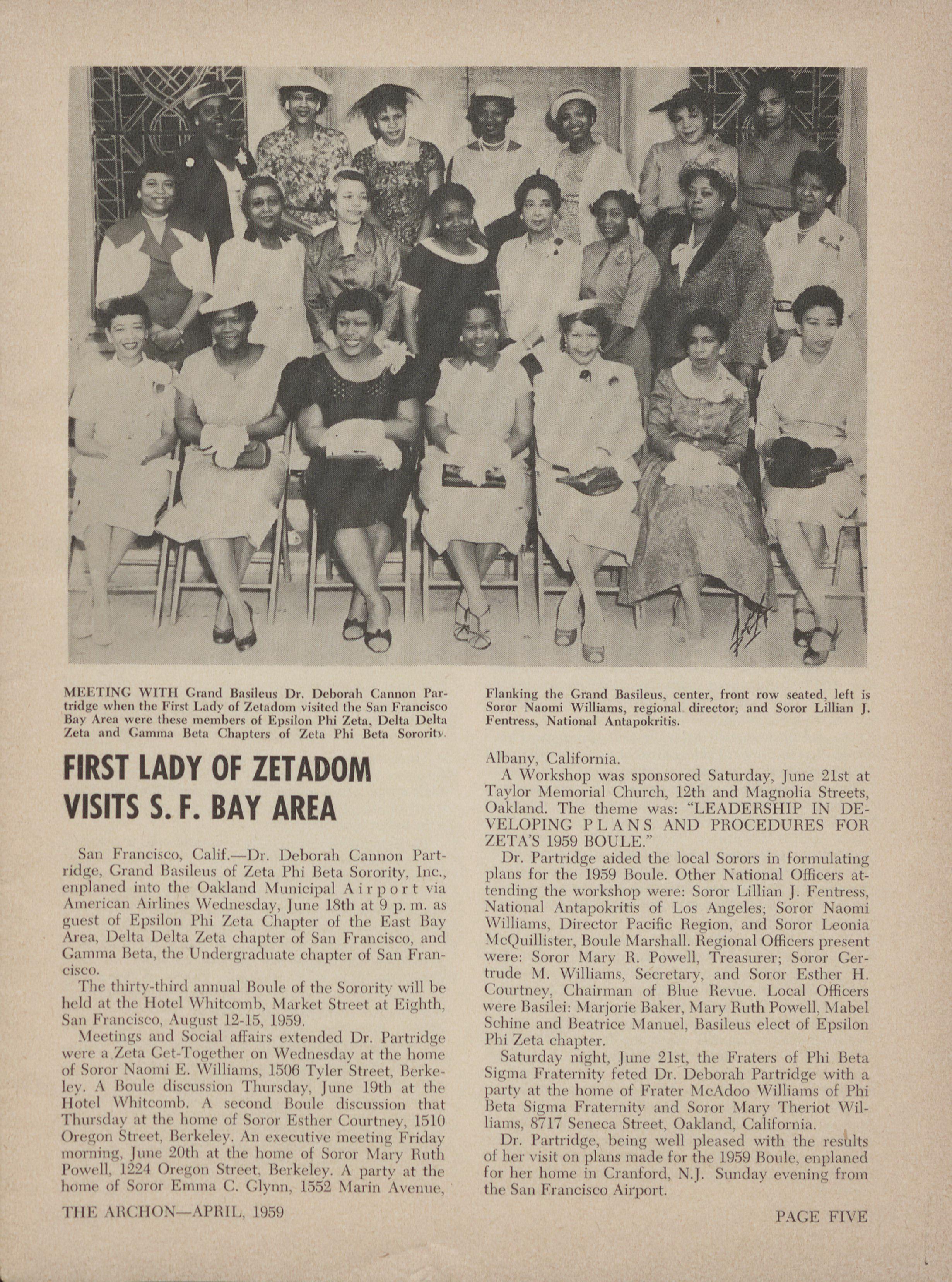 Flanking the (.rand Basilens, center, fi·ont row seated, left is tridge „ hel, !he Fir,1 1.1(1>' 01 Zet:kclon] „sited the San Francisco S()r~>r Nmmd Williams, regional director. and Soror Lillian J. 11,1,+ Area ,%'err tht. i,ie,idns 01 1<pq'lon Phi Zeta, 1),·11,1 Dcha 1''entress, National Ankq,okritis. A·ta 'ind (;4111"111,1 11(·111 ( 6:11)ti·r' 01 Zeta Phi Bet,1 S<iri,1-il' \11).iliv, ('41]il<,rnia.