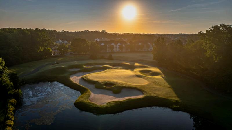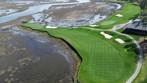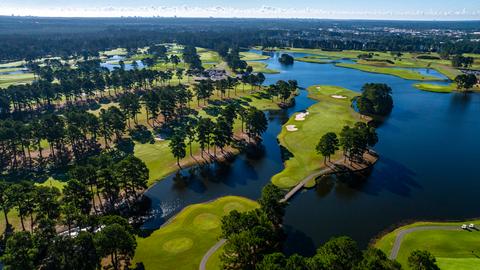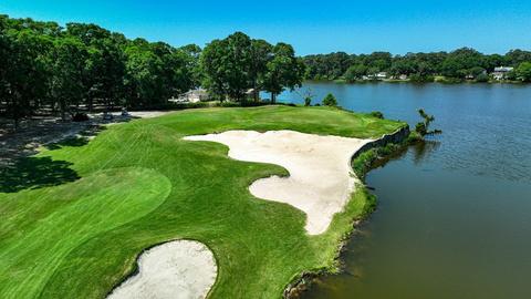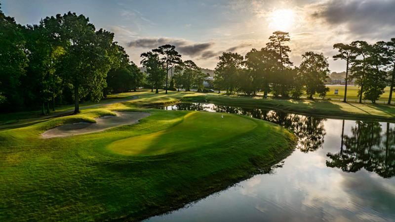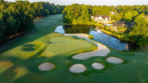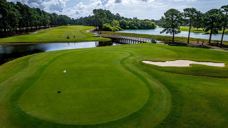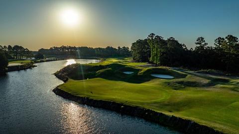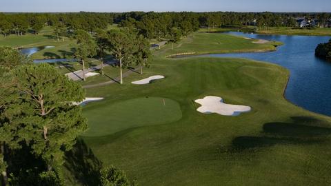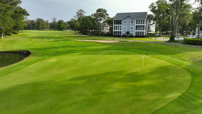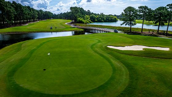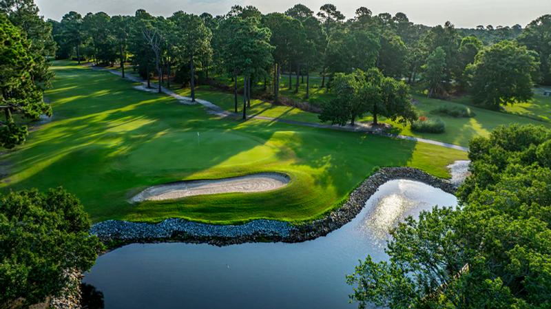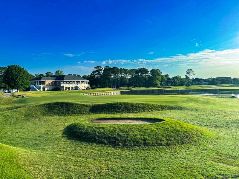 The round concludes with one of the most memorable finishing holes on the Grand Strand. The par-5 18th features water running along the fairway before leading to an island green, requiring precise execution under pressure. With the stately clubhouse overlooking the final approach, The Heritage Club provides a dramatic and fitting finish to a course that consistently ranks among the Carolinas’ finest public golf experiences.