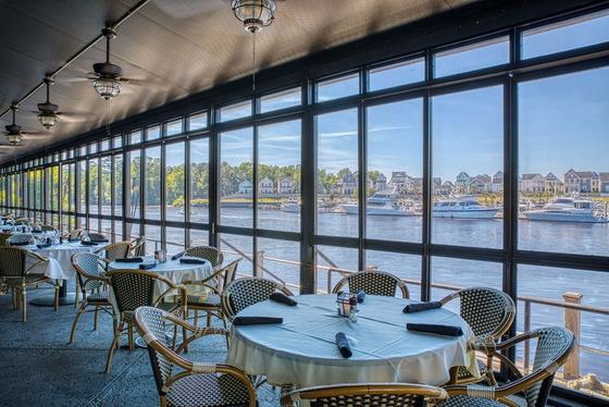 Inside, the atmosphere is warm and sophisticated, with rich wood accents, ambient lighting, and panoramic views of the waterway Outdoor seating provides an added draw, especially in the evening when the setting sun casts a golden glow across the water The combination of scenery and design creates a space that feels both relaxed and refined