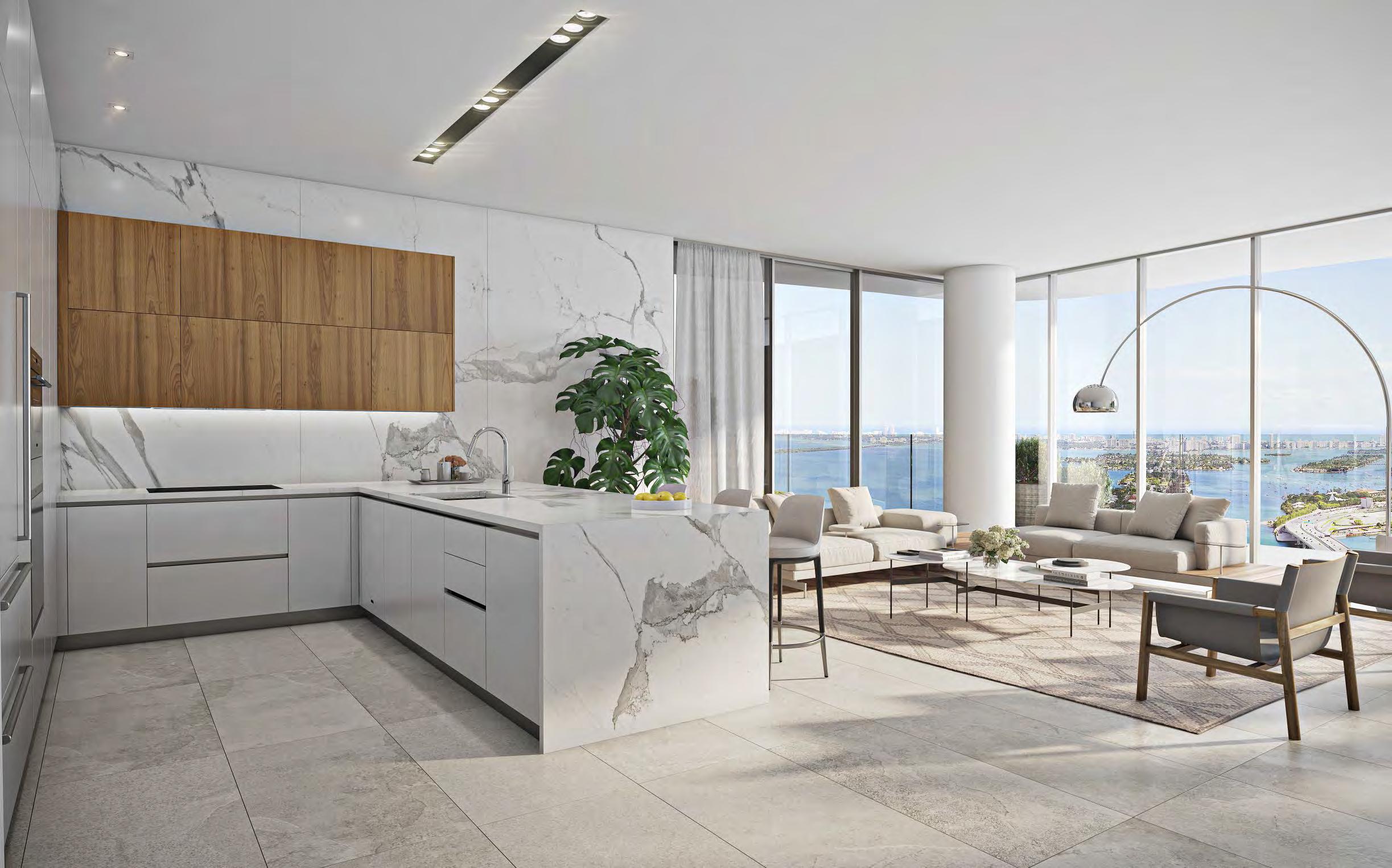 With dramatic floor-to-ceiling window walls, residents are poised within the glamorous panorama of the Miami skyline.