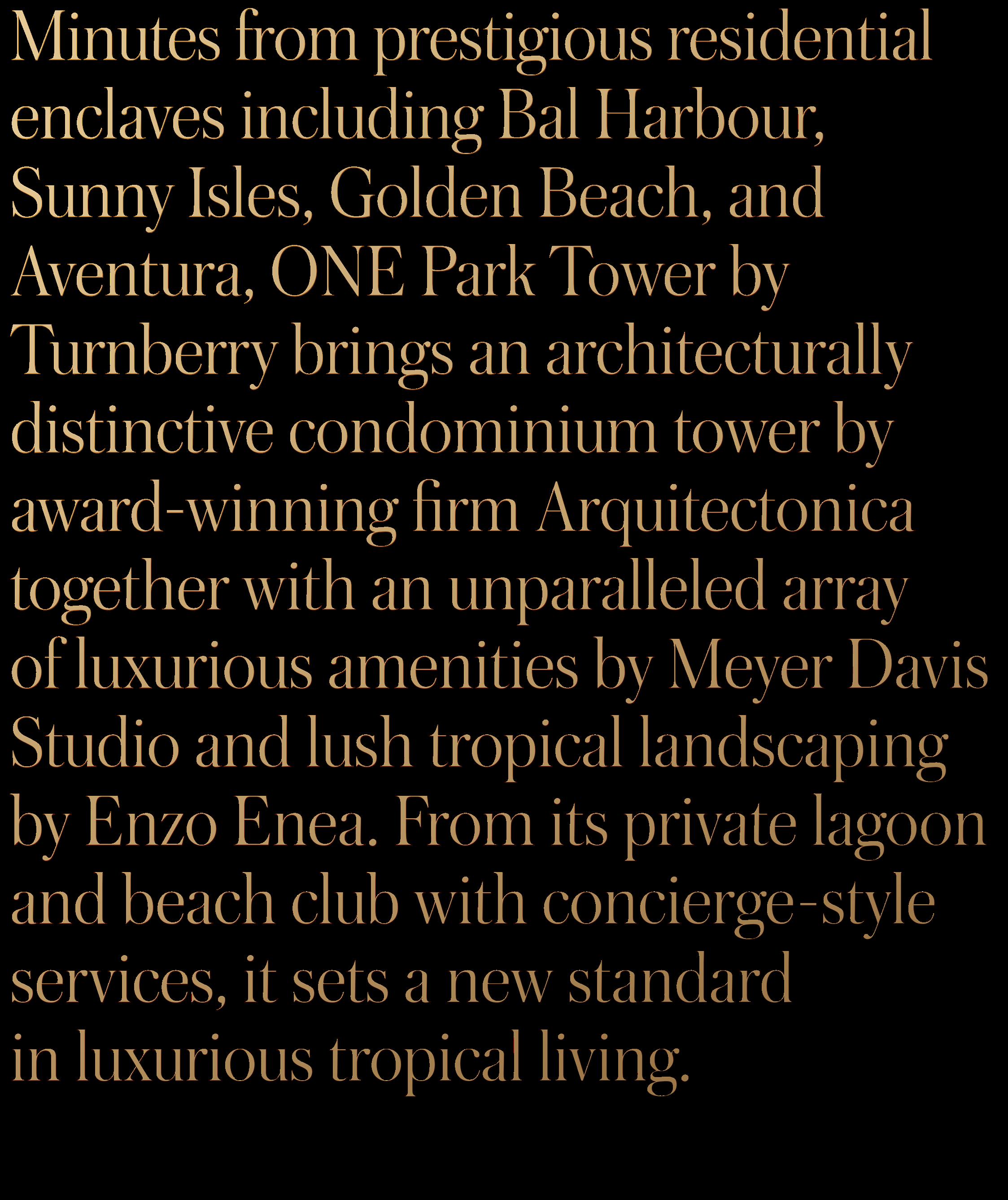 ONE Park Tower by Turnberry is the newest addition to SoLé Mia, a 184-acre city-within-a-city. This luxurious condominium experience is being brought to life by two of South Florida’s most accomplished real estate visionaries –Turnberry Development and Rosso Development. A uniquely elegant community, ONE Park Tower is lushly landscaped and features an unparalleled collection of indoor and outdoor amenities as well as five-star hospitality-style services. From sophisticated architecture by Arquitectonica and interiors by Meyer Davis Studio to exquisitely imagined gardens by Enzo Enea, every element of ONE Park Tower has been thoughtfully conceived.