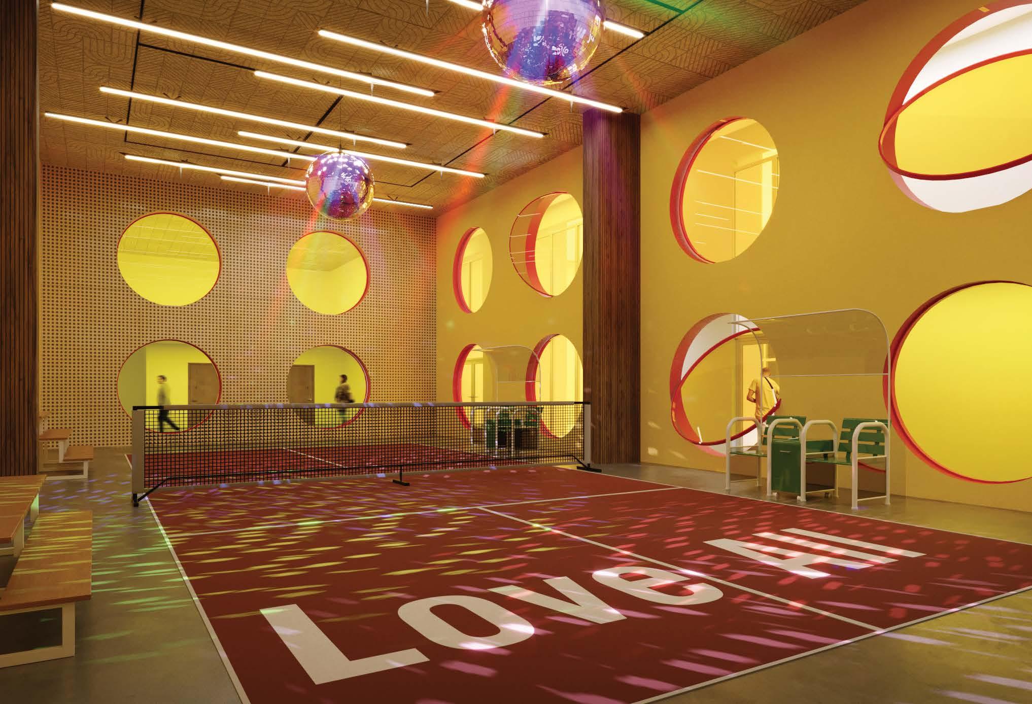 Wellness offerings from a state-of-the-art sweat room to an indoor pickleball court offer peace or play, while the social floor features a karaoke bar and coworking spaces include a private boardroom and zoom rooms.