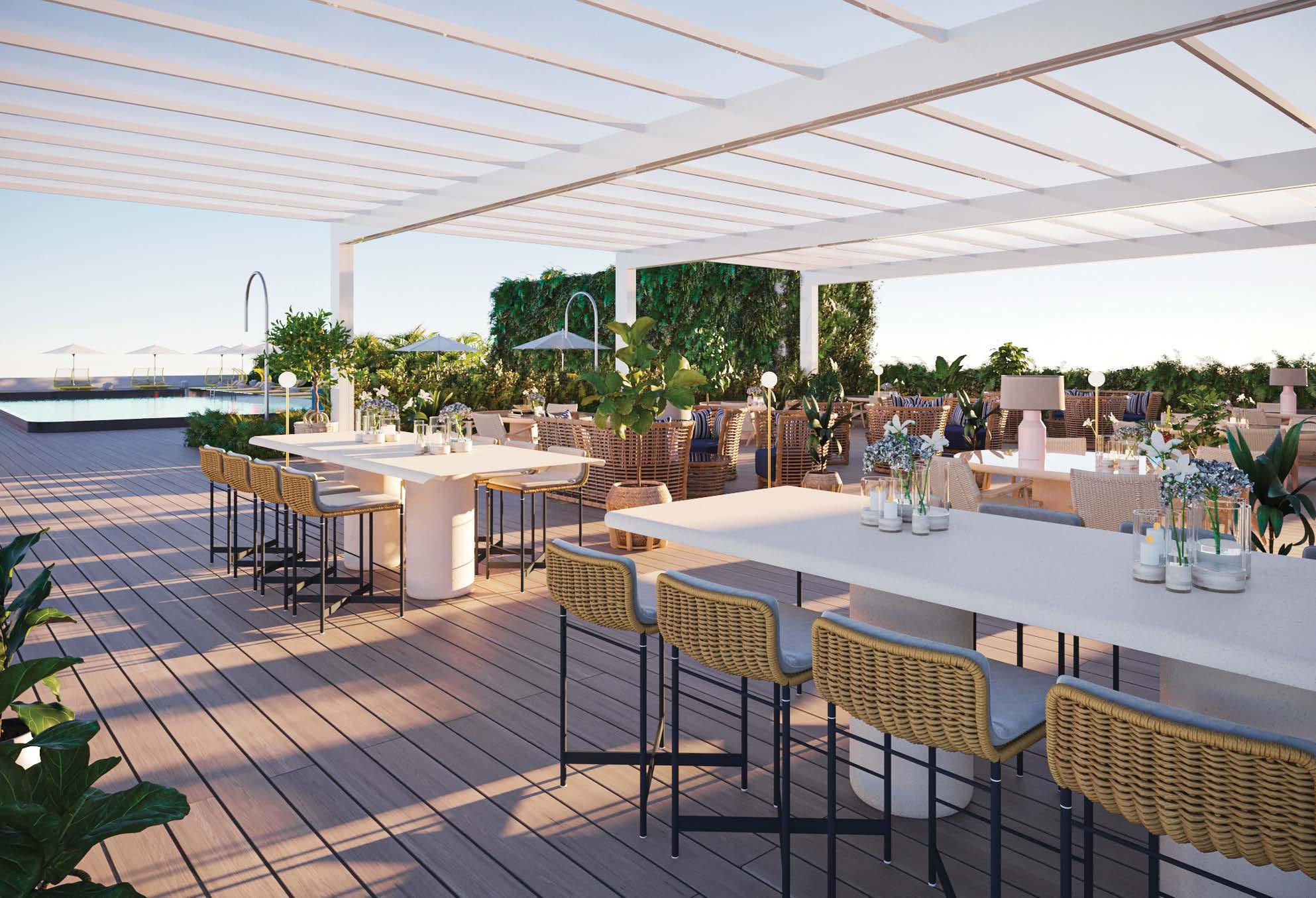Residents will enjoy thoughtfully designed social spaces and amenities spanning across five floors. At the apex is a vibrant rooftop deck with a 60-foot, resort-style sunset pool, and signature rooftop restaurant and bar.