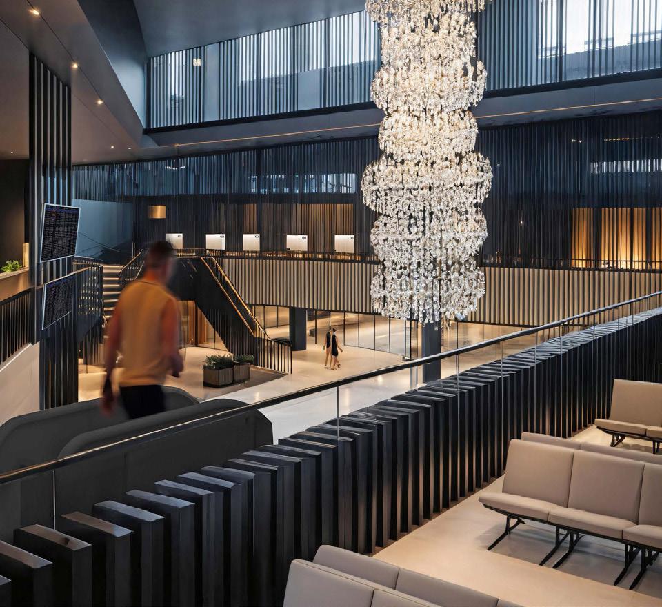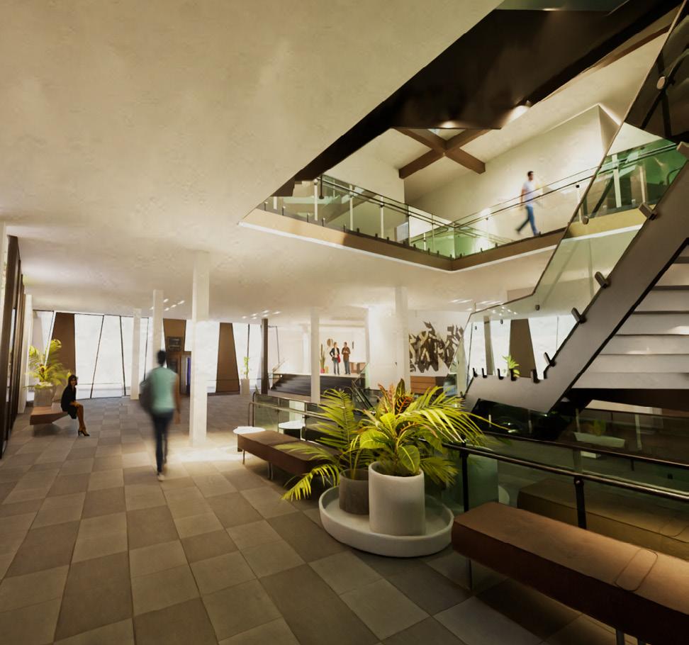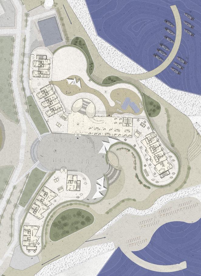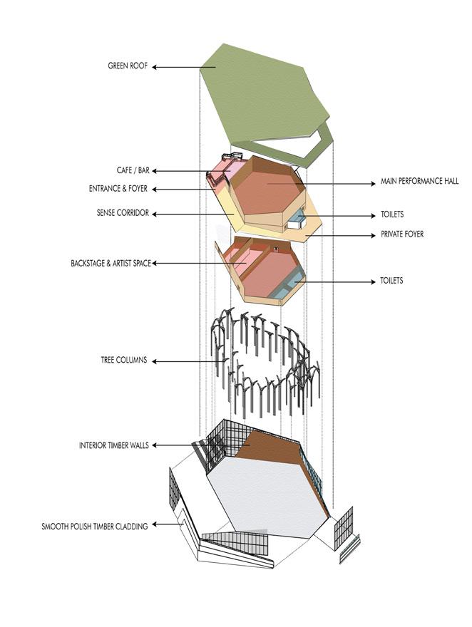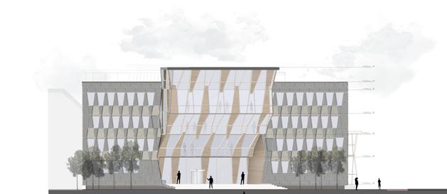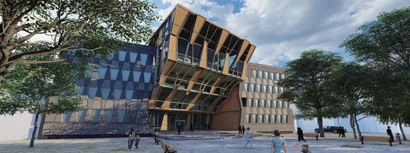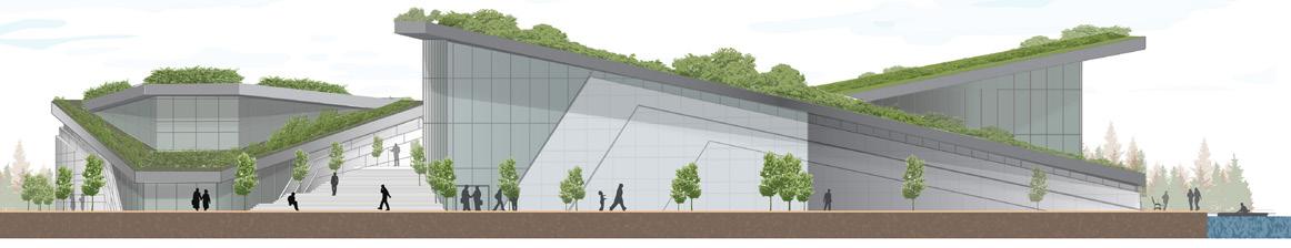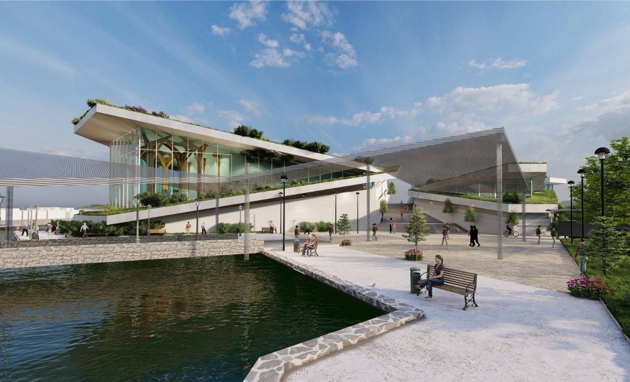 a modern, revitalized image of the town, while the interior embraces warmth and comfort with inviting timber finishes. Monumentality plays a significant role in the project, with performance halls, schools, and studios featuring bold, unique shapes that leave a lasting impression. The iconic treeshaped columns, which effortlessly lift the heavy structures off the ground, extend the greenery theme indoors, creating a harmonious blend between architecture and nature.