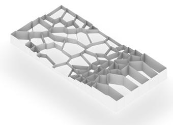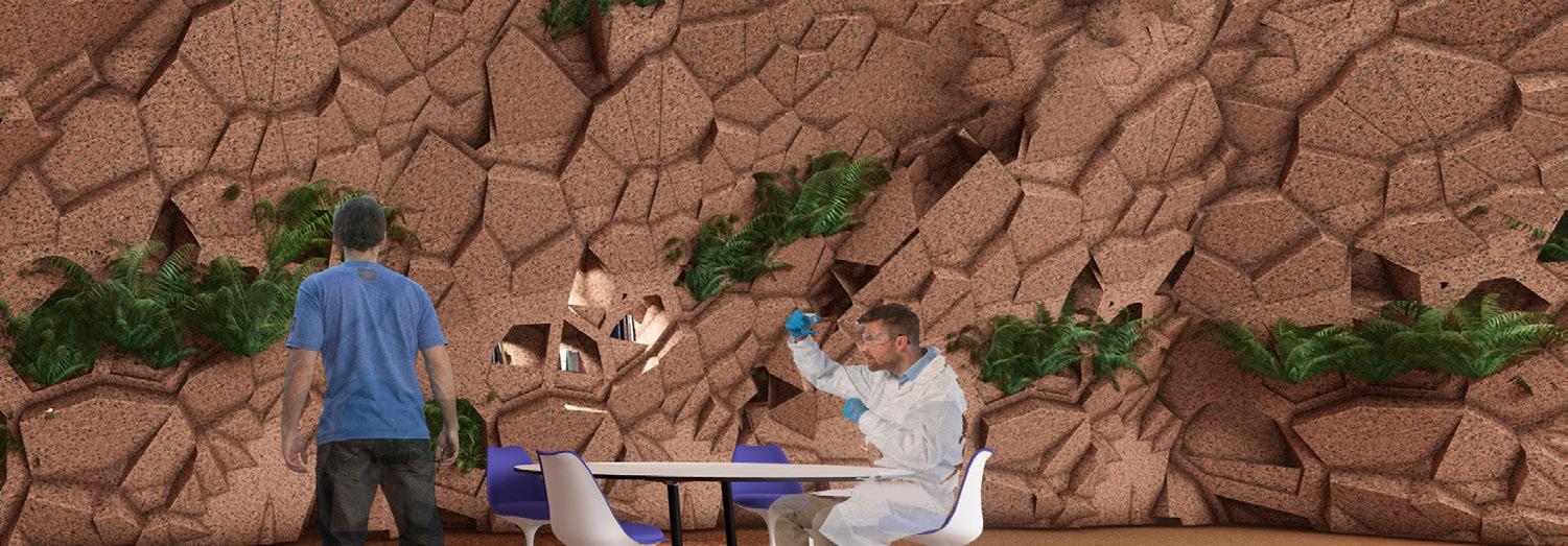 In collaboration with the European Space Agency, this research focuses on achieving design-to-robotic production, optimization, and operation, aiming to link performancedriven design with robotic production and user-driven building operation. Utilizing Voronoi points, the structural stress lines are reinforced, ensuring solidity in critical zones during 3D printing while allowing in-between spaces to serve purposes like aquaponics, acoustics, and furniture. The exploration of zoning and pattern implementations demonstrates significant potential for 3D artwork, enhancing