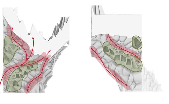 • Externally, strong, angular masses blend with the landscape through green roofs and rock-inspired facades, echoing geological tectonics with a modern, industrial aesthetic.
