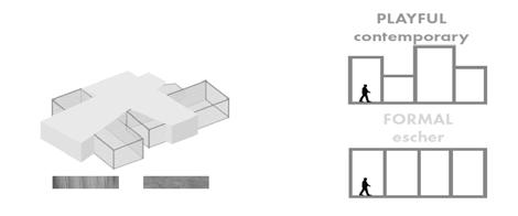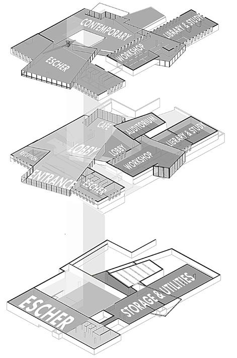 embassy’s defensive and austere facade. The existing structure, designed by Marcel Breuer, will remain dedicated to showcasing Escher’s works, reinforcing the connection between the building’s geometric, brutalist style and Escher’s intricate, mathematical art. In contrast, a contemporary addition slices through the guarded facade, symbolically and physically opening the building to the public.
