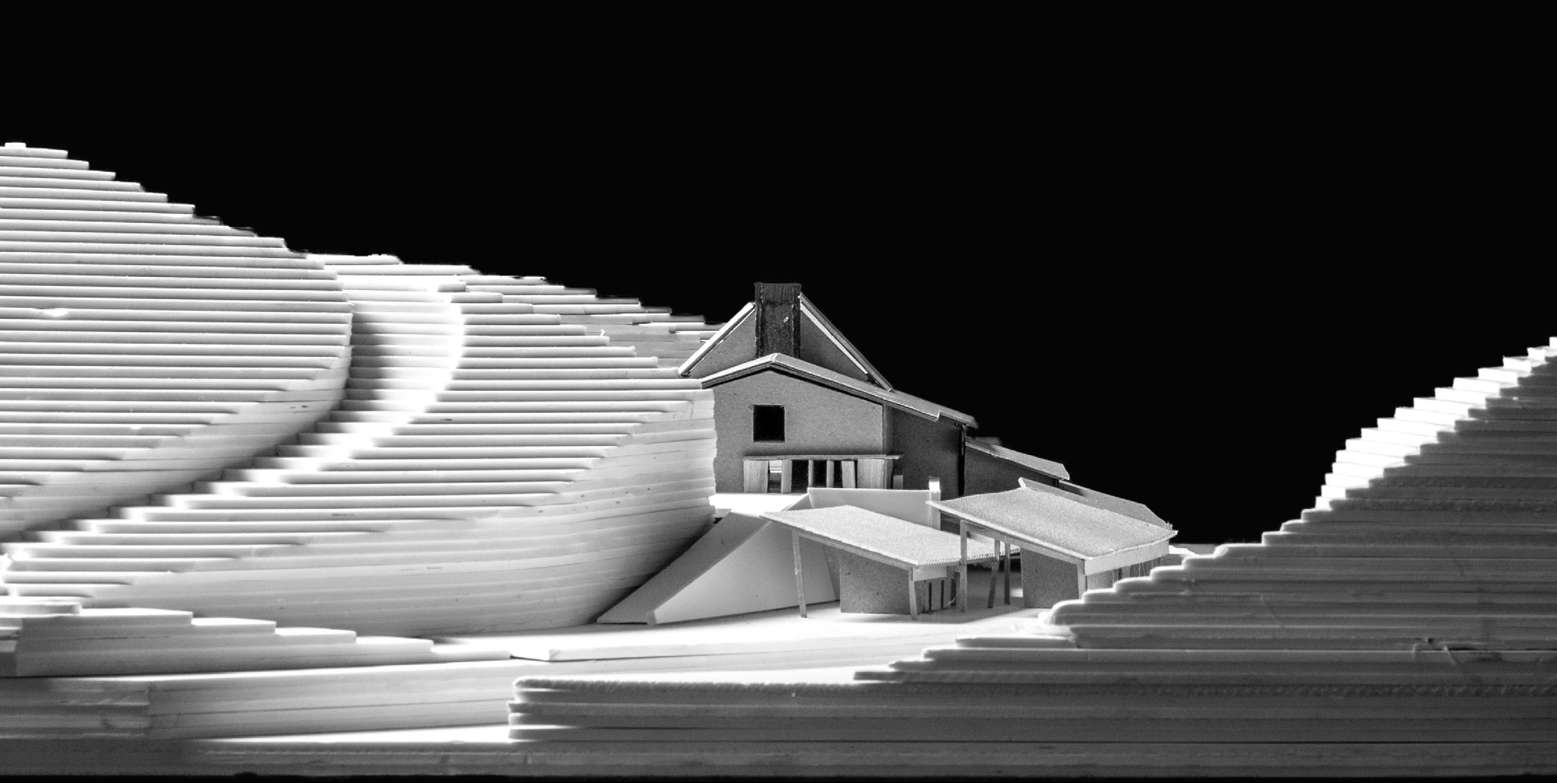 From the opposite bank, the new complex looks like 3 pitched-roof houses that respond to the surrounding industrial context and become an icon for the site. The south side is much lower which makes it more intimate to visitors. Three gardens are set for different purposes: the entrance garden on the platform provides a view of the canal; the central one introduces water into the complex; the east side garden can work as an exterior exhibition place for the adjacent studios.