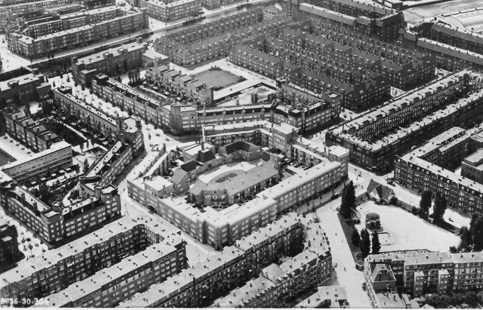 Between 1919 and 1923, the housing district was built to the north of Amstelkanaal, where originally planned was an area for an academic hospital. Six different housing associations built 1600 dwellings on a 30-acre site, and De Dageraad was one of those associations. They commissioned Klerk and Kramer to design 294 houses and 6 shops. The construction finished between 1926 and 1931. (Casciato, 1996) The housing complex consists of two linear buildings on the two sides of the Y-shaped main street. At the end parts of each building are
