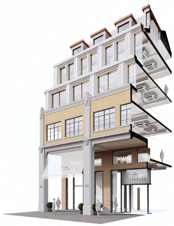 The renovation of Jingling Lu elevations includes three types: new building, addition, and restoration. All newly built constructions on the top floor are set back to minimize oppression for pedestrians on the street. This setback is also based on the historic building code of Jingling Lu. All interior structures of existing buildings are demolished since the original floor-to-floor heights do not meet today’s commercial demands. New floor slabs and steel structures are applied for the best clearance.