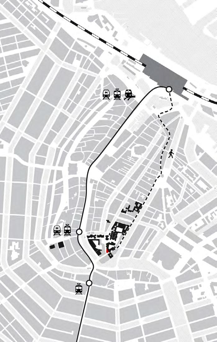 The site is located at the south end of De Wallen district, which is full of stores, residences, and UvA buildings. Besides common sidewalks, there is also a pathway within the blocks that connects various public spaces. My design uses a rotunda as a public interior to extend this existing route. It brings more accessibility and spatial quality to the local streets.