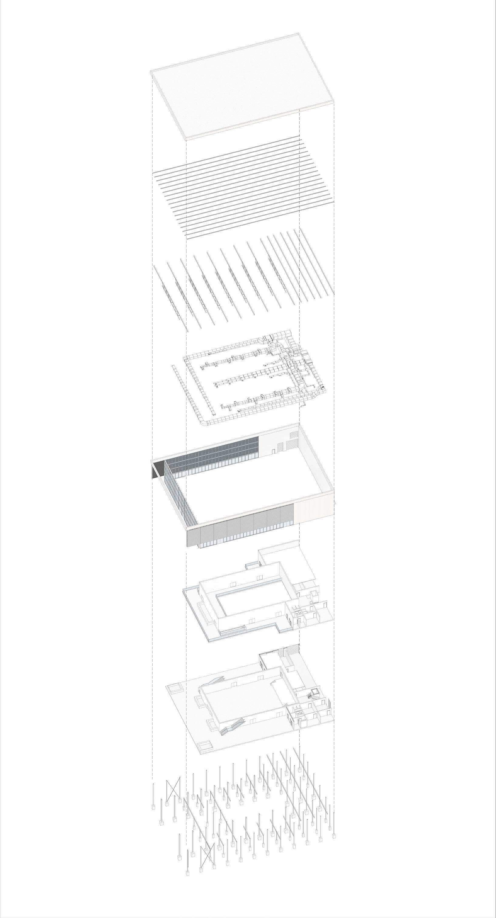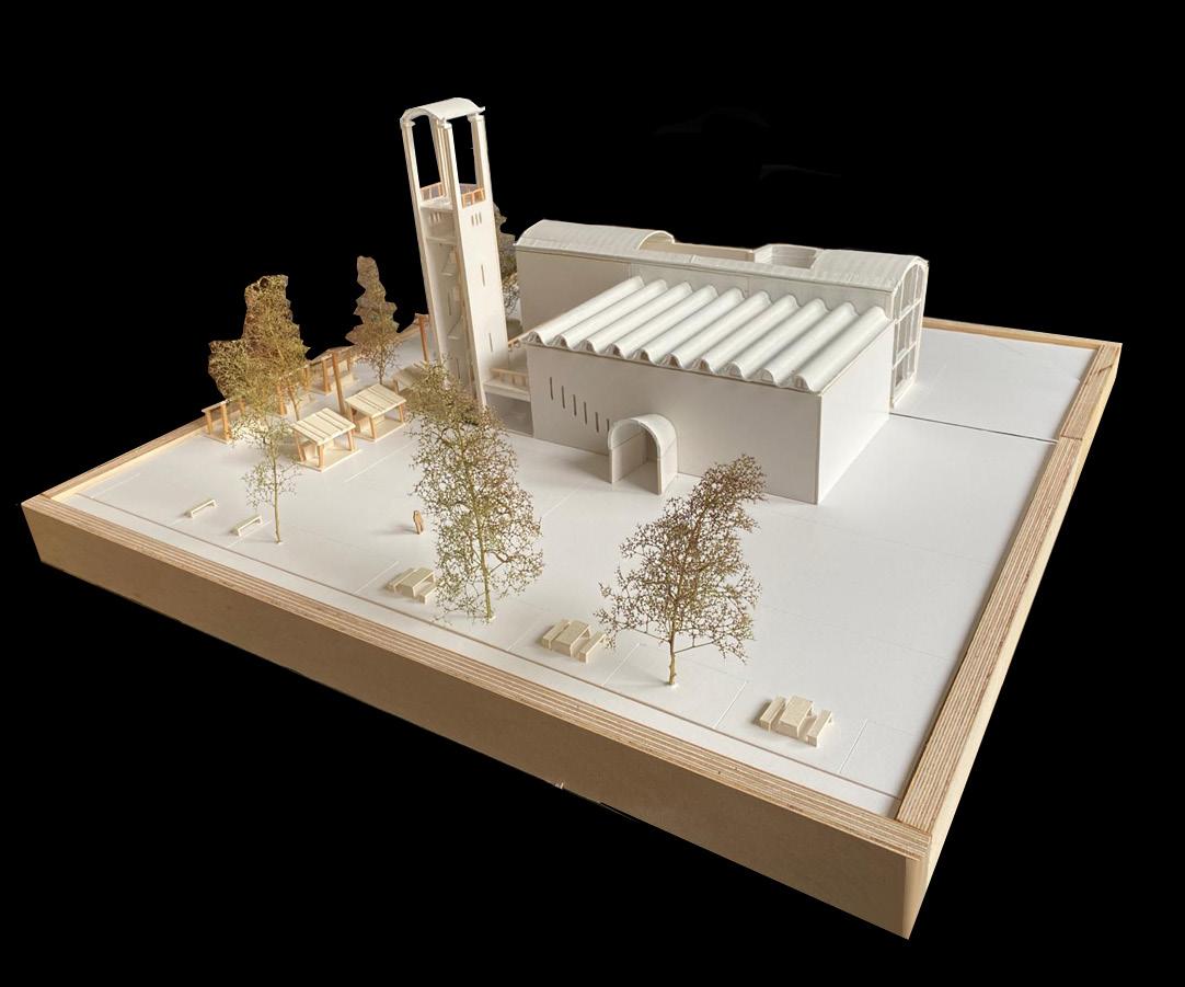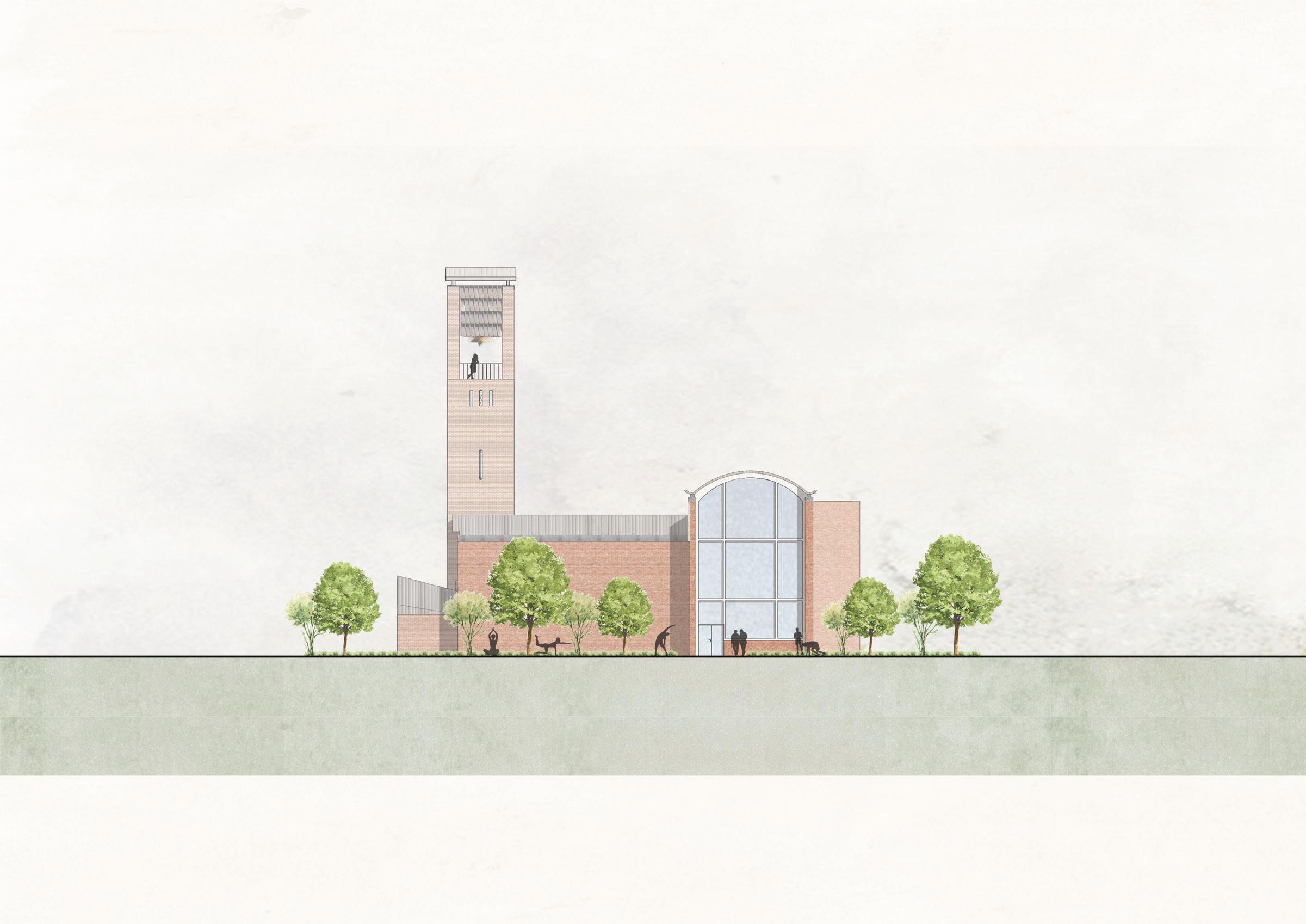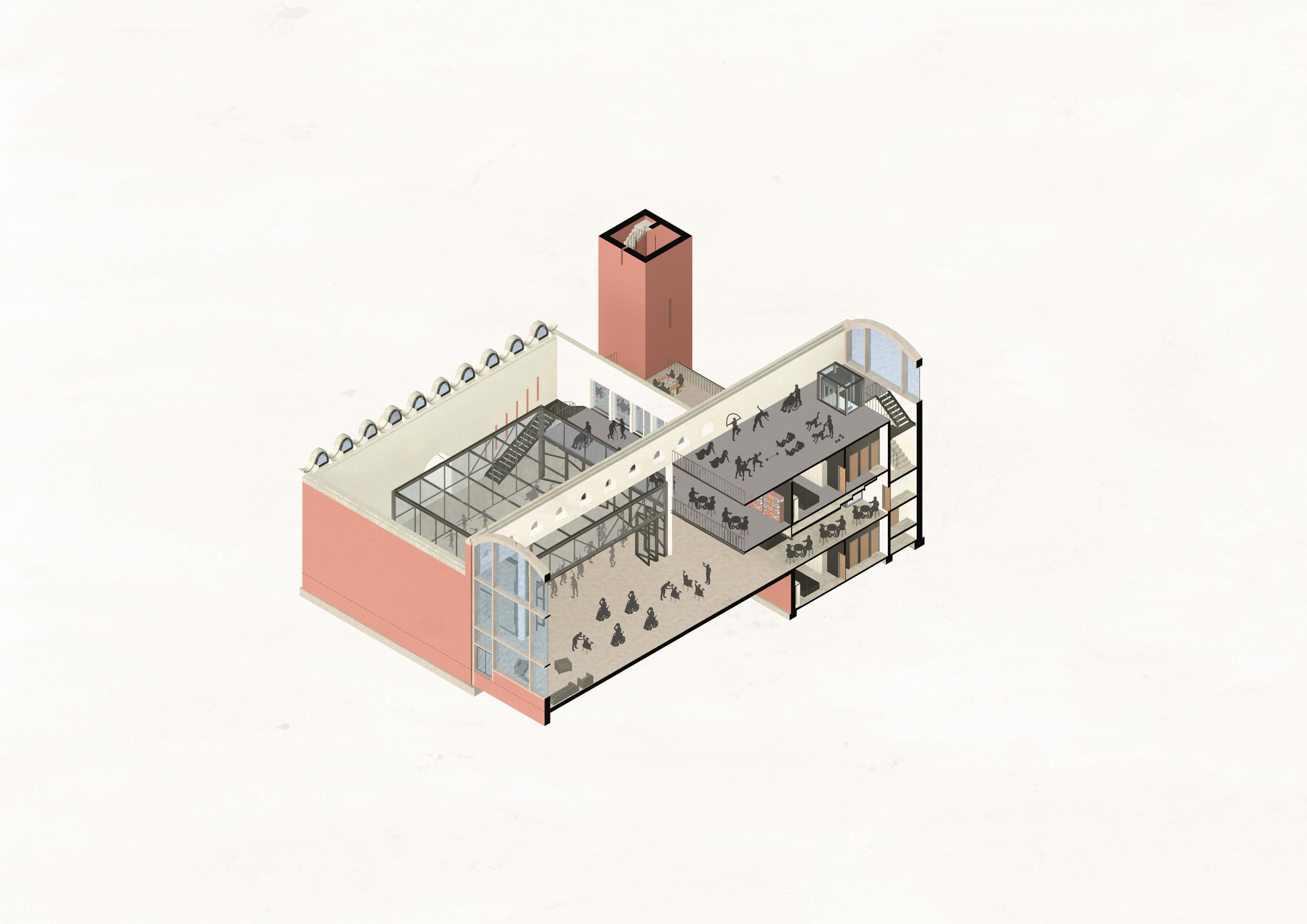 Die Umgestaltung der Kirche schafft einen Treffpunkt für alle Generationen, indem sie den sozialen Charakter eines Gemeindezentrums mit körperlicher Bewegung verbindet. Daraus entstand die Idee, die Kirche St. Sebastian als Zentrum des Viertels neu zu nutzen und die Kapelle für die katholische Gemeinde zu erhalten, während gleichzeitig Angebote für alle Altersgruppen geschaffen wurden. Aktivitäten wie Seniorenfitness, Yogastunden, Kinderbetreuung und Gemeindeversammlungen können parallel stattfinden. Die Einbauten sind so gestaltet, dass ein flexibles Raumsystem entsteht, dessen Mittelpunkt ein ca. 12 x 13,5 Meter großer Kubus bildet. Dieser kann in zwei separate Räume unterteilt oder bei Bedarf zur Apsis und zur Kapelle hin geöffnet werden, um Platz für größere Veranstaltungen wie Konzerte, Messen oder Kinderspieltage zu schaffen. Das Querschiff wurde neu strukturiert und beherbergt nun zentrale Funktionen wie Sanitäranlagen, Umkleiden und einen barrierefreien Zugang über einen neuen Aufzug. Im Erdgeschoss entstand zudem ein Café, das an die Tradition des „Kaffee und Kuchen“ nach dem Gottesdienst anknüpft. Die obere Plattform des Glockenturms wurde zu einer Aussichtsplattform umgestaltet, von der aus Besucher durch Schlitze im massiven Mauerwerk die Weitsicht genießen können. Der Aufstieg zum Turm wurde als Erlebnispfad gestaltet, der verschiedene Ausstellungsstücke aus dem ehemaligen Kirchenraum und der Gemeinde zeigt.