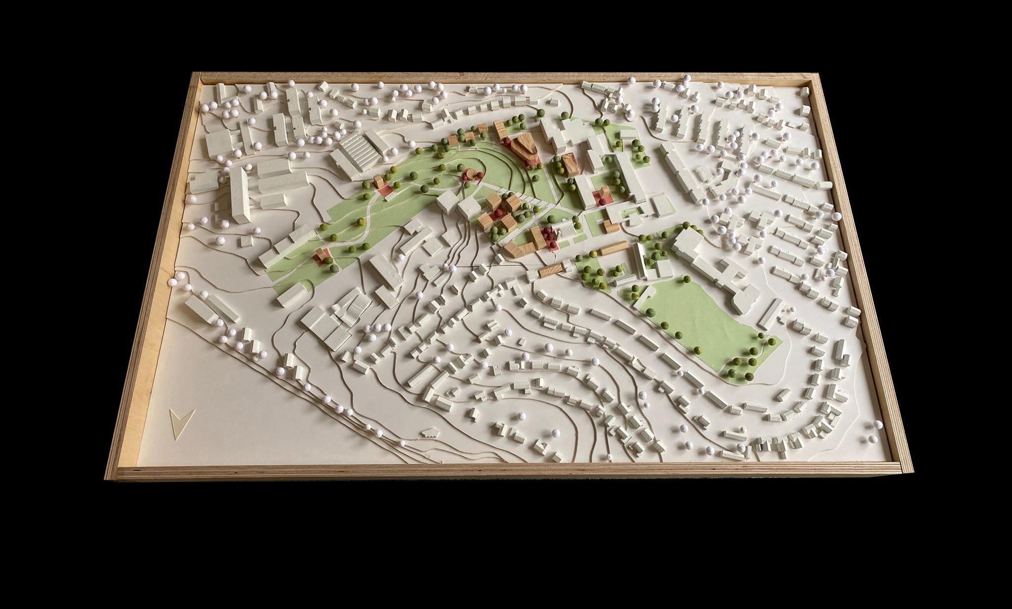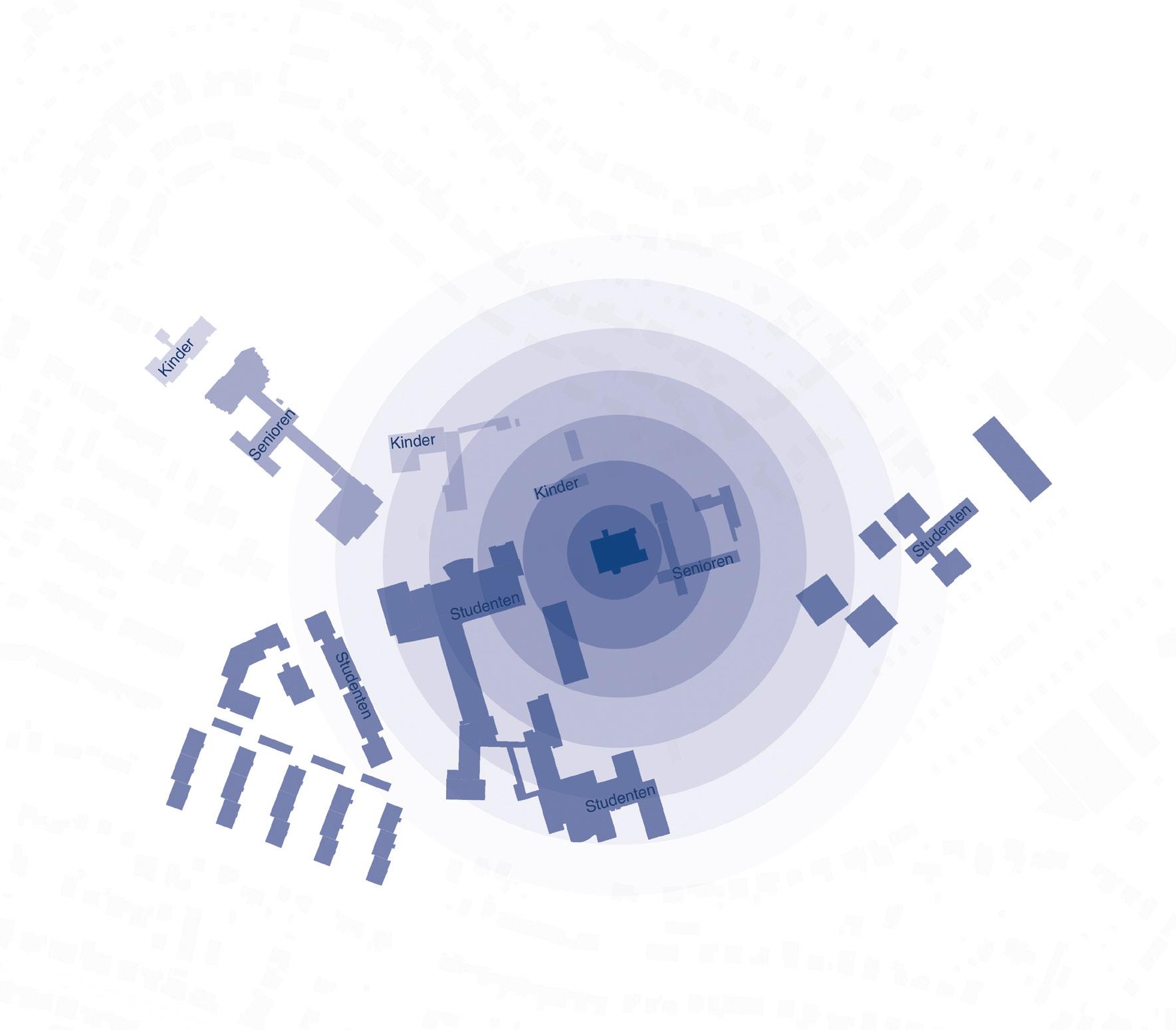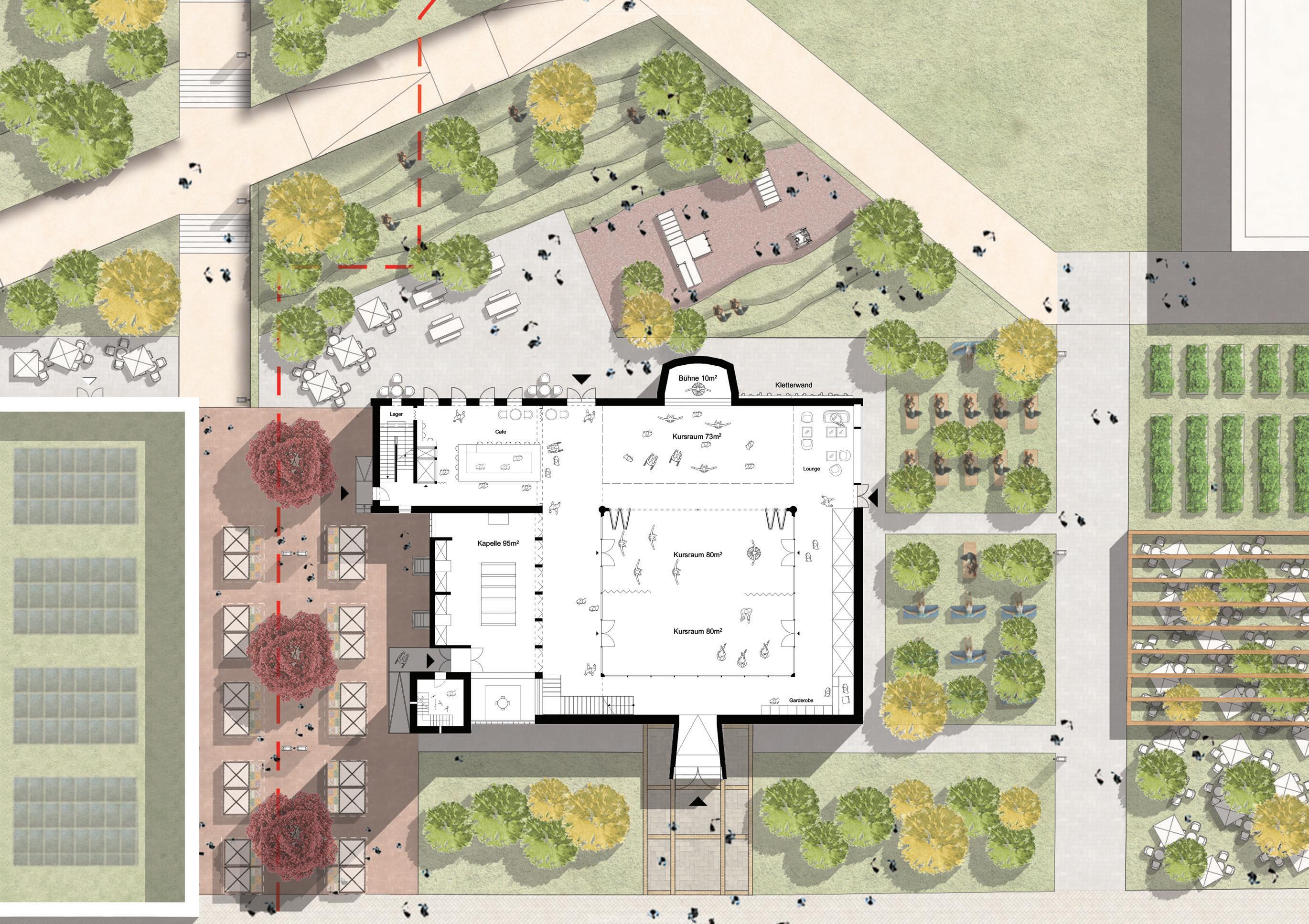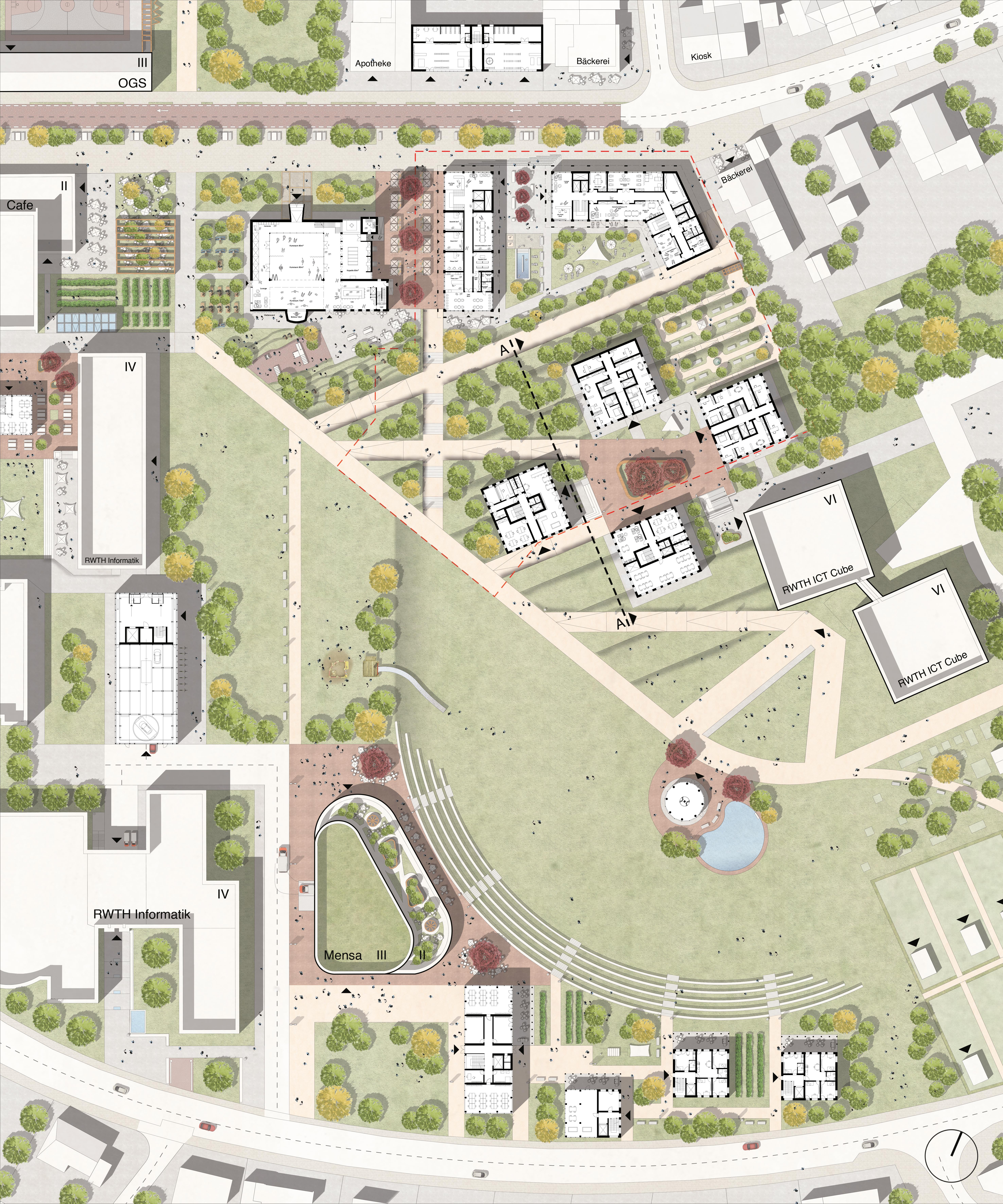 Dieses ungebrauchte Potenzial wird im städtebaulichen Entwurf aktiviert und einen neuen durchgehenden „Grünfinger“ (1. Leitidee) entstehen lassen. Diese verbinden Aachens grünes Umland mit der in einem „Kessel“ gelegenen Innenstadt und helfen bei der Durchlüftung und dem Kaltluftzustro. Ein frei begehbares und grünes Quartier erhöht die Lebensqualität gleichermaßen für Bewohner und Besucher. Neben dem Fokus des Entwurfs auf die Sicherung von Grünflächen, ist eine Vernetzung (2. Leitidee) der umliegenden Nutzungsstrukturen (z.B. RWTH, Wohnen und Kleingartenvereine) und Bautypologien (Einfamilienhaus, Cluster-Bauten, Kubus und Riegel) wichtig. Vorhandenen Grenzen, welche die Fußgänger und Fahrradfahrerfreundlichkeit eingrenzen und somit auch die Verbindung des Quartiers mit der Aachener Innenstadt, werden somit entfernt und es entstehen fließende Übergänge. Eine barrierefreie Durchmischung der unterschiedlichen Demografien des Stadtteils fördert den Austausch und trägt zu einer gesunden Gemeinschaft bei (3. Leitidee). Im Zentrum des Plangebiets befindet sich die denkmalgeschützte Kirche St. Sebastian. Da sich der Bedarf der vorhandenen katholischen Gemeinde verringert hat, wird diese zum Teil umgenutzt. Eine flexible Zukunftsstrategie, welche bei Bedarf und in Etappen die verbliebenen religiösen Räume in Abstimmung mit der bestehenden Gemeinde in ein noch offeneres interreligiöses und spirituelles Zentrum umwandelt, ist angedacht (4. Leitidee). Um eine durchgängige Zugänglichkeit zu gewährleisten, wurden die Schrebergärten neu strukturiert und im Rahmen von Urban Gardening und Urban Farming systematisch in die Parkgestaltung integriert. Die Ahornstraße wird deutlich fußgängerfreundlicher gestaltet, indem der reguläre Fahrzeugverkehr sowie die meisten Parkplätze entfernt. Als Ausgleich entsteht in Erweiterung des RWTH-Informatikzentrums ein Mobility Hub, der neben einer automatisierten Autoparkanlage auch weitere Mobilitätsdienste umfasst.