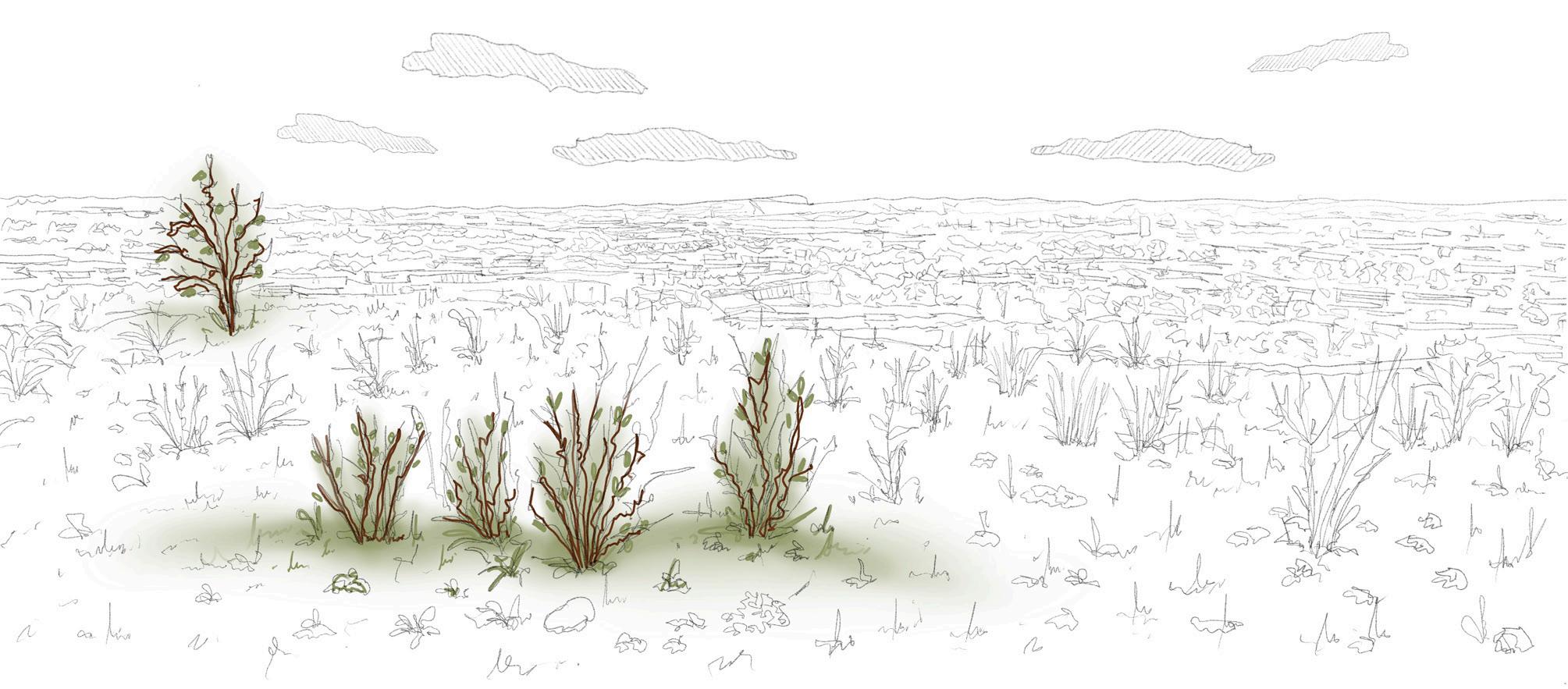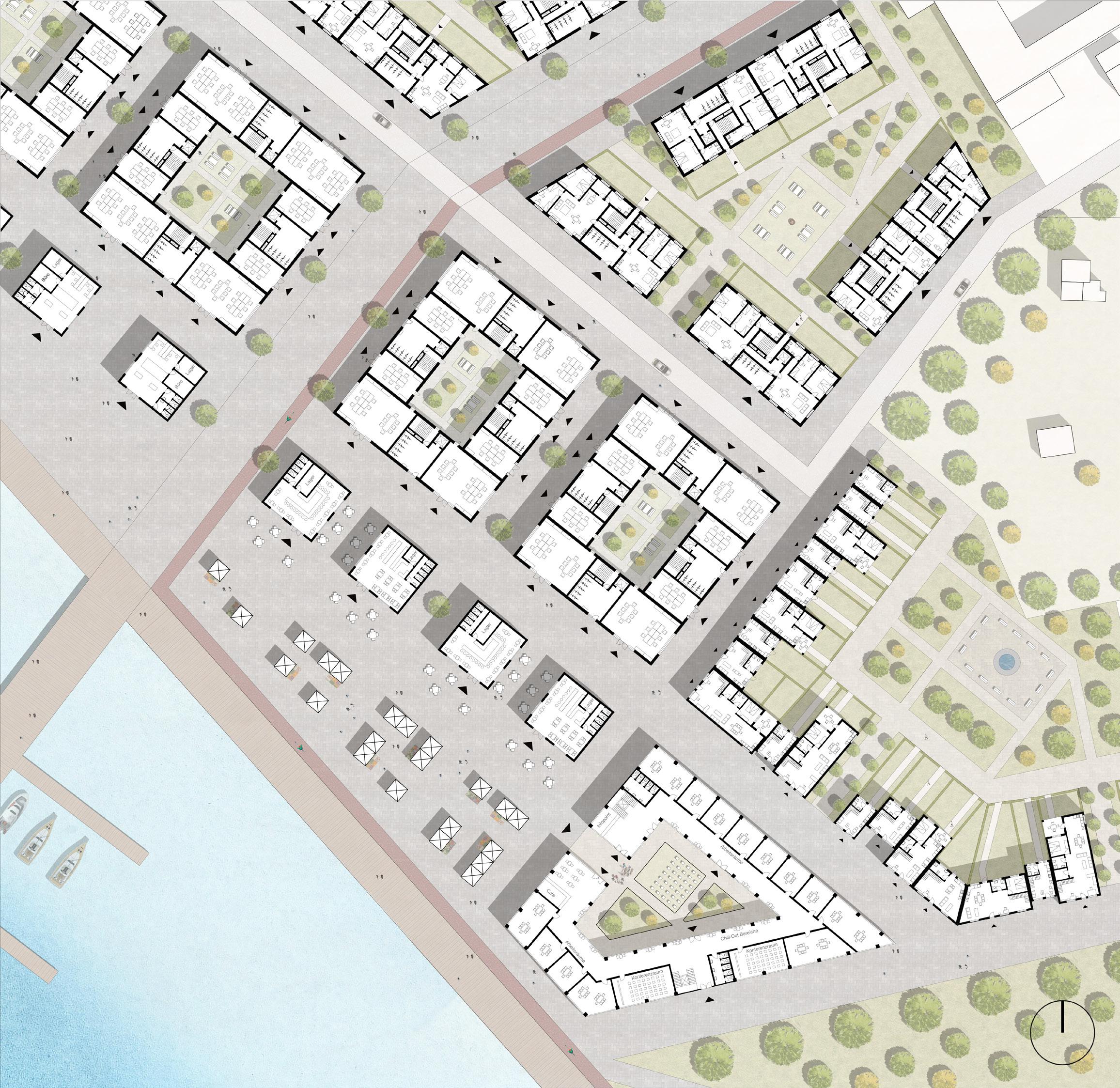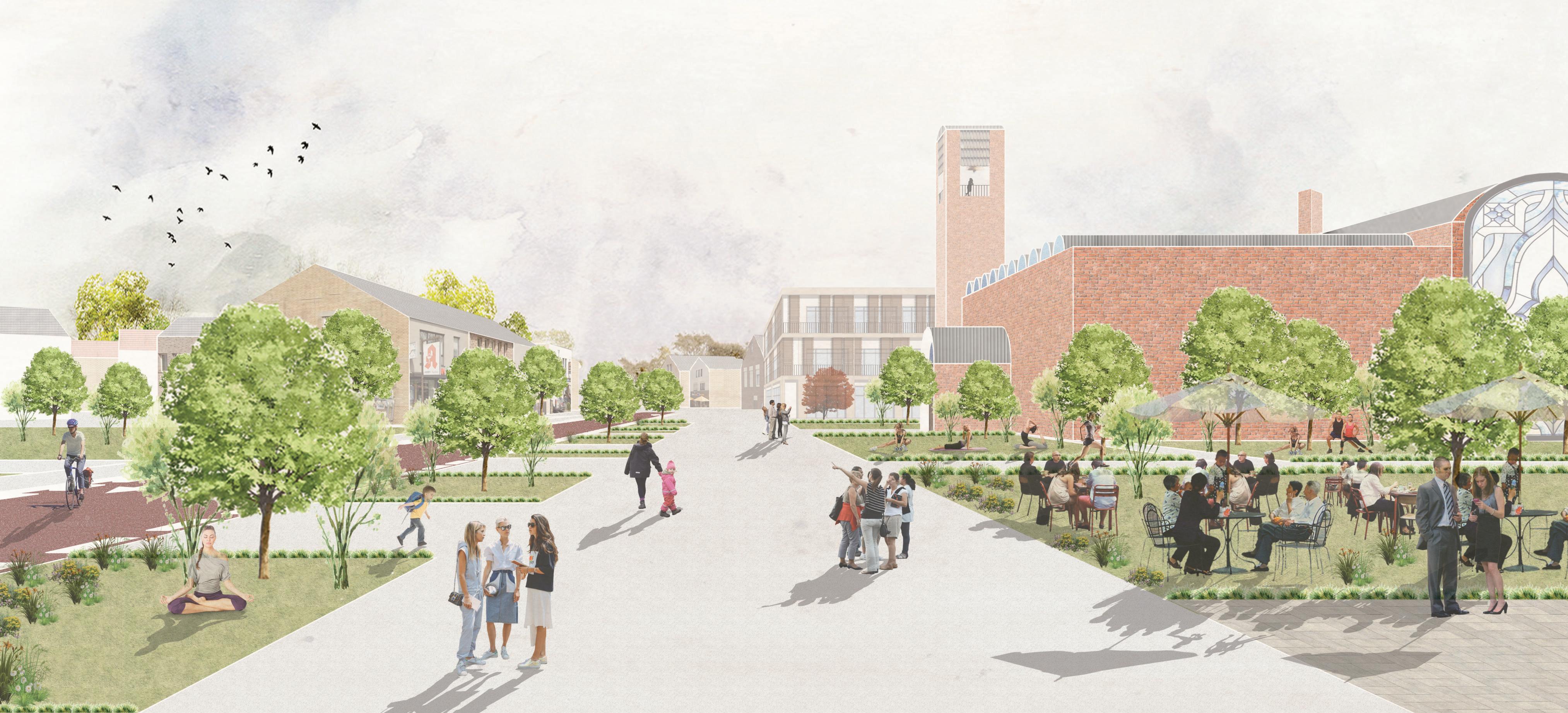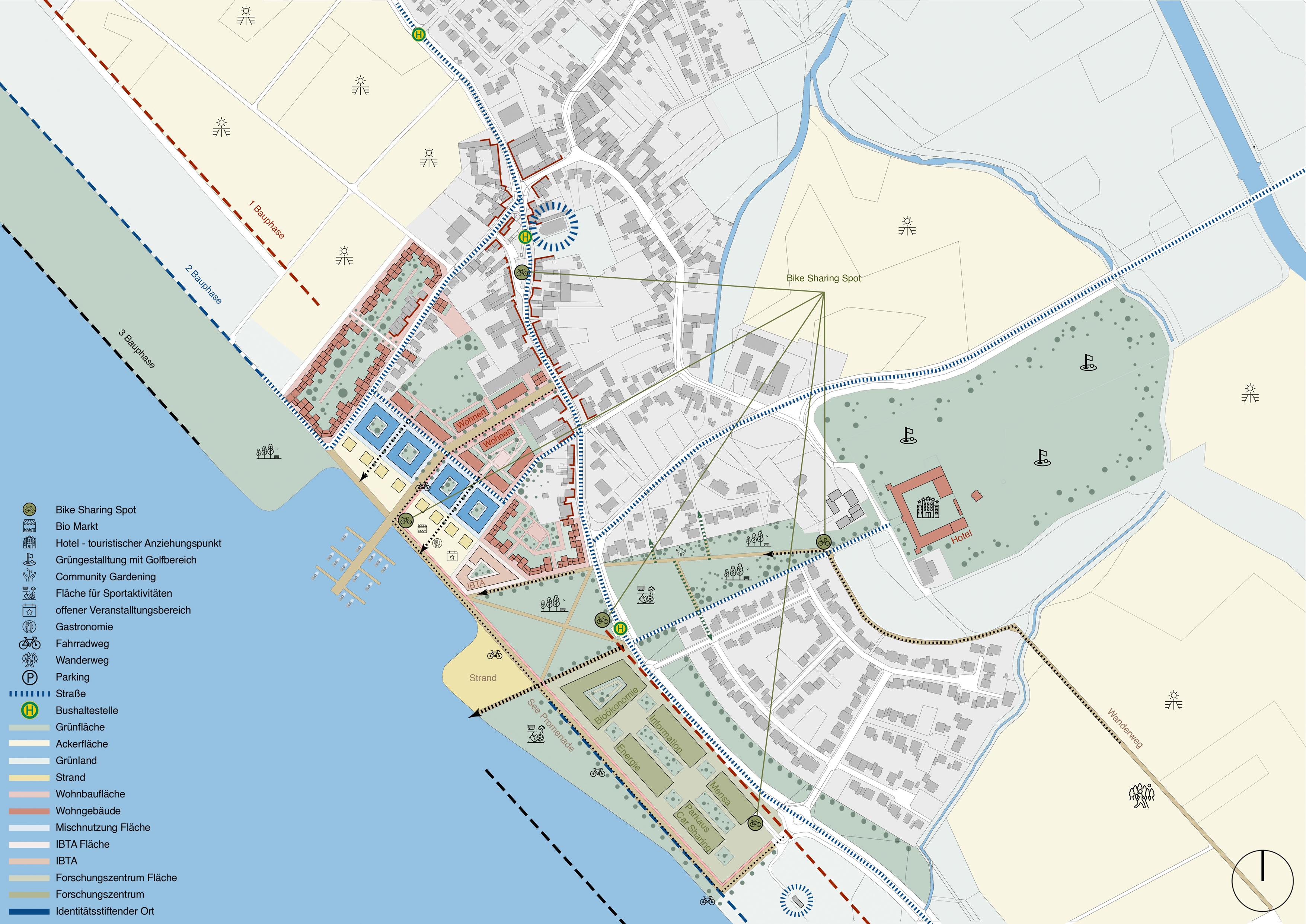 Dieses ungebrauchte Potenzial wird im städtebaulichen Entwurf aktiviert und einen neuen durchgehenden „Grünfinger“ (1. Leitidee) entstehen lassen. Diese verbinden Aachens grünes Umland mit der in einem „Kessel“ gelegenen Innenstadt und helfen bei der Durchlüftung und dem Kaltluftzustro. Ein frei begehbares und grünes Quartier erhöht die Lebensqualität gleichermaßen für Bewohner und Besucher. Neben dem Fokus des Entwurfs auf die Sicherung von Grünflächen, ist eine Vernetzung (2. Leitidee) der umliegenden Nutzungsstrukturen (z.B. RWTH, Wohnen und Kleingartenvereine) und Bautypologien (Einfamilienhaus, Cluster-Bauten, Kubus und Riegel) wichtig. Vorhandenen Grenzen, welche die Fußgänger und Fahrradfahrerfreundlichkeit eingrenzen und somit auch die Verbindung des Quartiers mit der Aachener Innenstadt, werden somit entfernt und es entstehen fließende Übergänge. Eine barrierefreie Durchmischung der unterschiedlichen Demografien des Stadtteils fördert den Austausch und trägt zu einer gesunden Gemeinschaft bei (3. Leitidee). Im Zentrum des Plangebiets befindet sich die denkmalgeschützte Kirche St. Sebastian. Da sich der Bedarf der vorhandenen katholischen Gemeinde verringert hat, wird diese zum Teil umgenutzt. Eine flexible Zukunftsstrategie, welche bei Bedarf und in Etappen die verbliebenen religiösen Räume in Abstimmung mit der bestehenden Gemeinde in ein noch offeneres interreligiöses und spirituelles Zentrum umwandelt, ist angedacht (4. Leitidee). Um eine durchgängige Zugänglichkeit zu gewährleisten, wurden die Schrebergärten neu strukturiert und im Rahmen von Urban Gardening und Urban Farming systematisch in die Parkgestaltung integriert. Die Ahornstraße wird deutlich fußgängerfreundlicher gestaltet, indem der reguläre Fahrzeugverkehr sowie die meisten Parkplätze entfernt. Als Ausgleich entsteht in Erweiterung des RWTH-Informatikzentrums ein Mobility Hub, der neben einer automatisierten Autoparkanlage auch weitere Mobilitätsdienste umfasst.