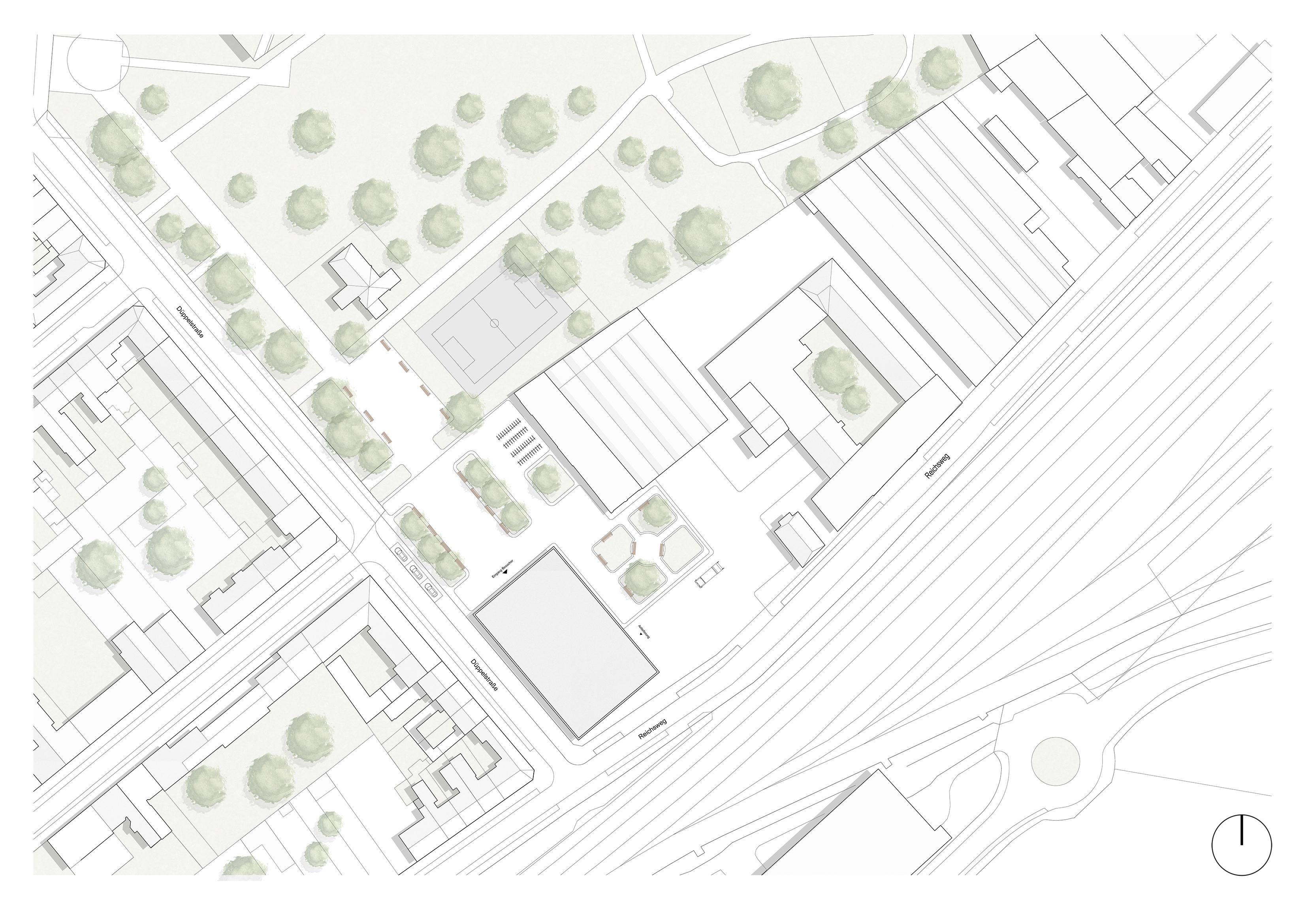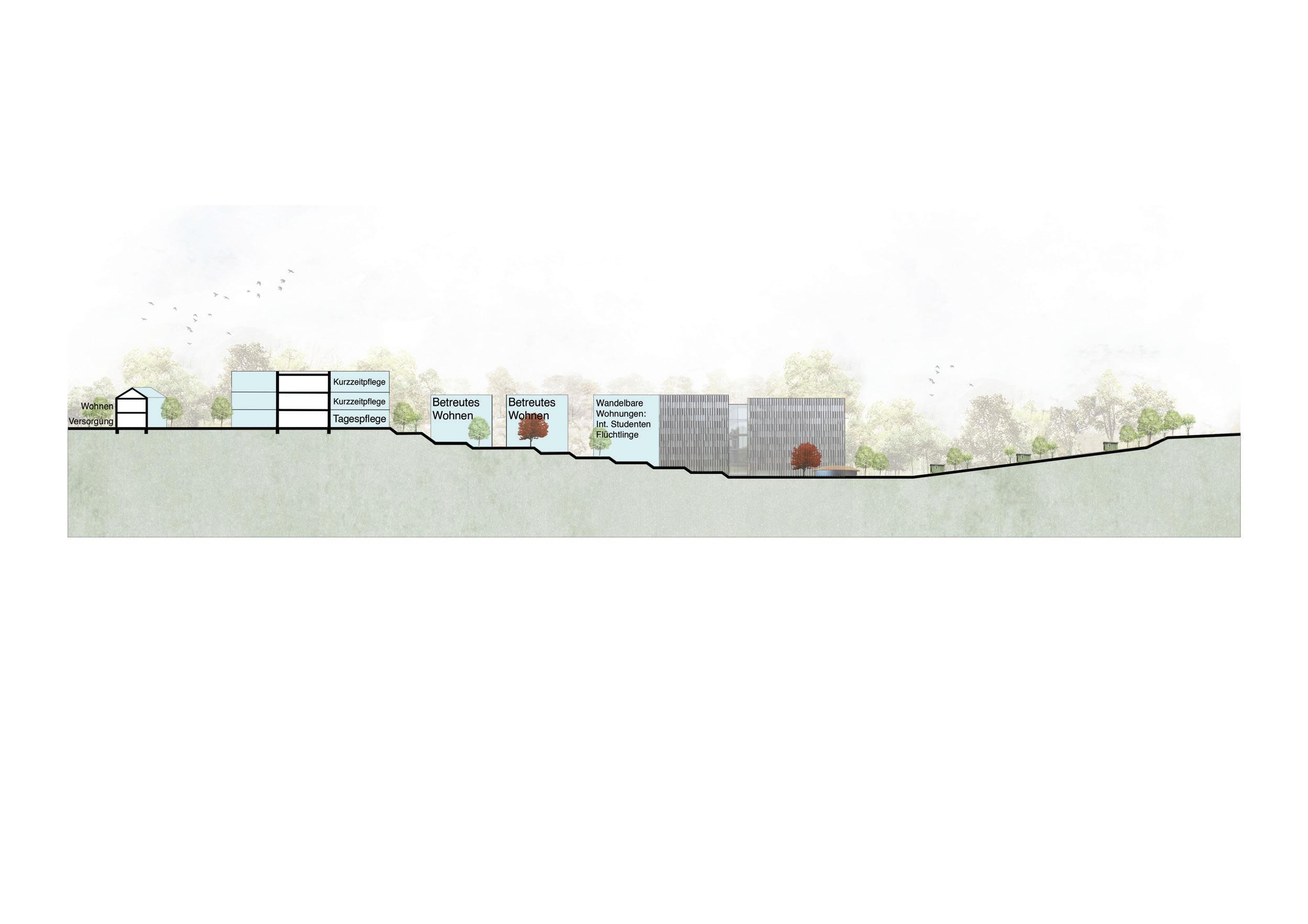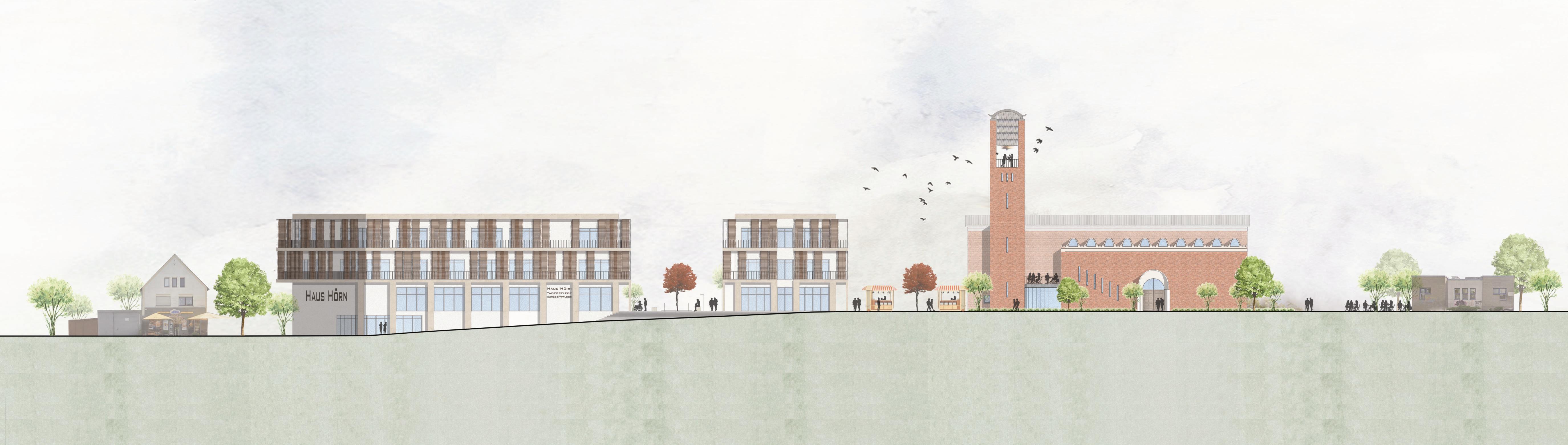 In dem städtebaulichen Konzept werden die Baukörper der Erweiterung des Haus Hörns, sowie das neue Oratorium, an der Ecke St. Sebastian - Ahornstraße angesiedelt. Diese entwickeln sich dann den Hang Richtung Süden herunter und vernetzen, zusammen mit der Landschaftsplanung, mehrere Nutzungsstrukturen. Die einzelnen Funktionen des Haus Hörns sind auf verschiedene Gebäude aufgeteilt. Das neue Oratorium hat eine öfft. zugängliches Erdgeschoss, sowie Angebote für die BeAnsicht Nord “Erweiterung Haus Hörn”