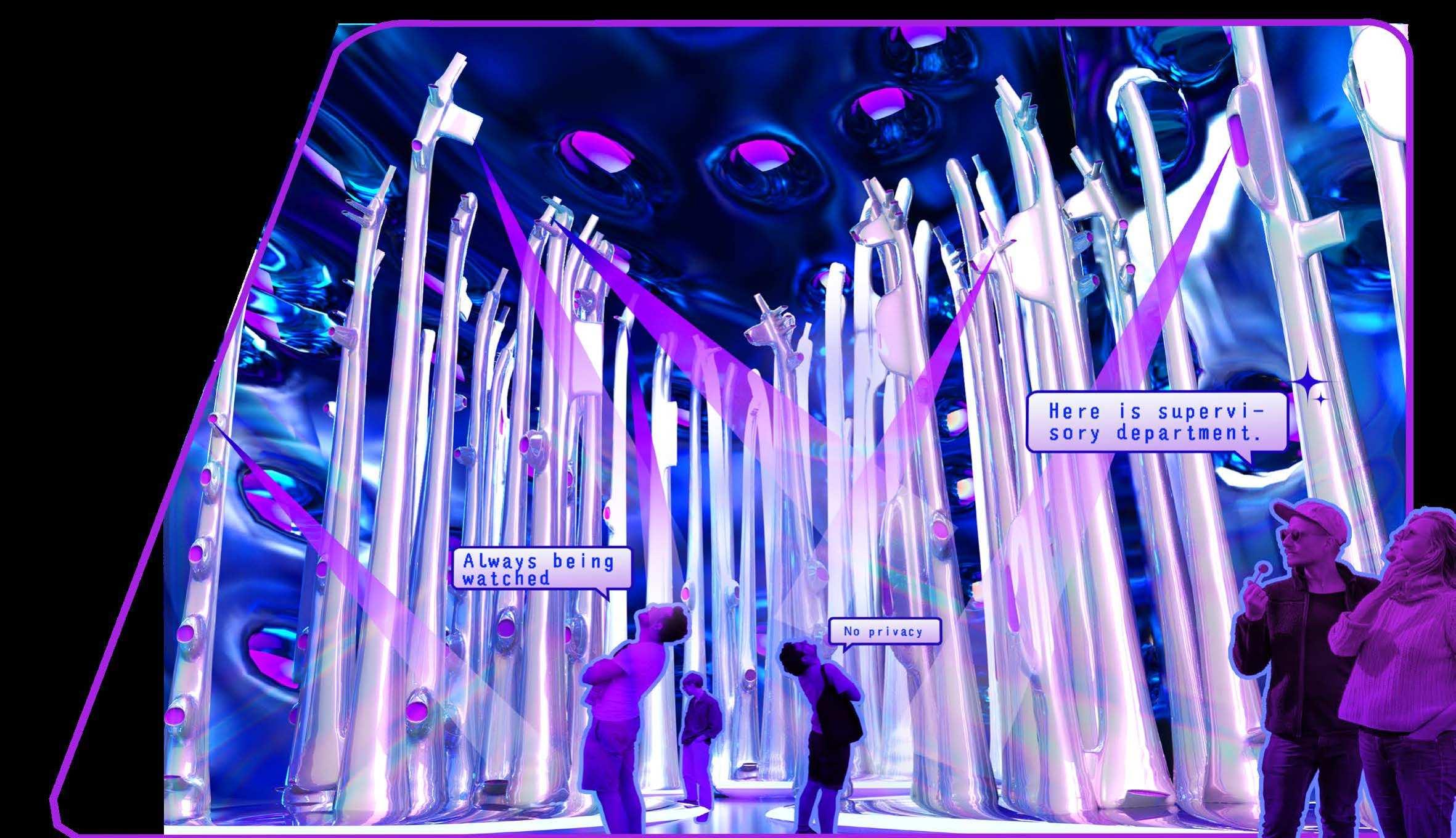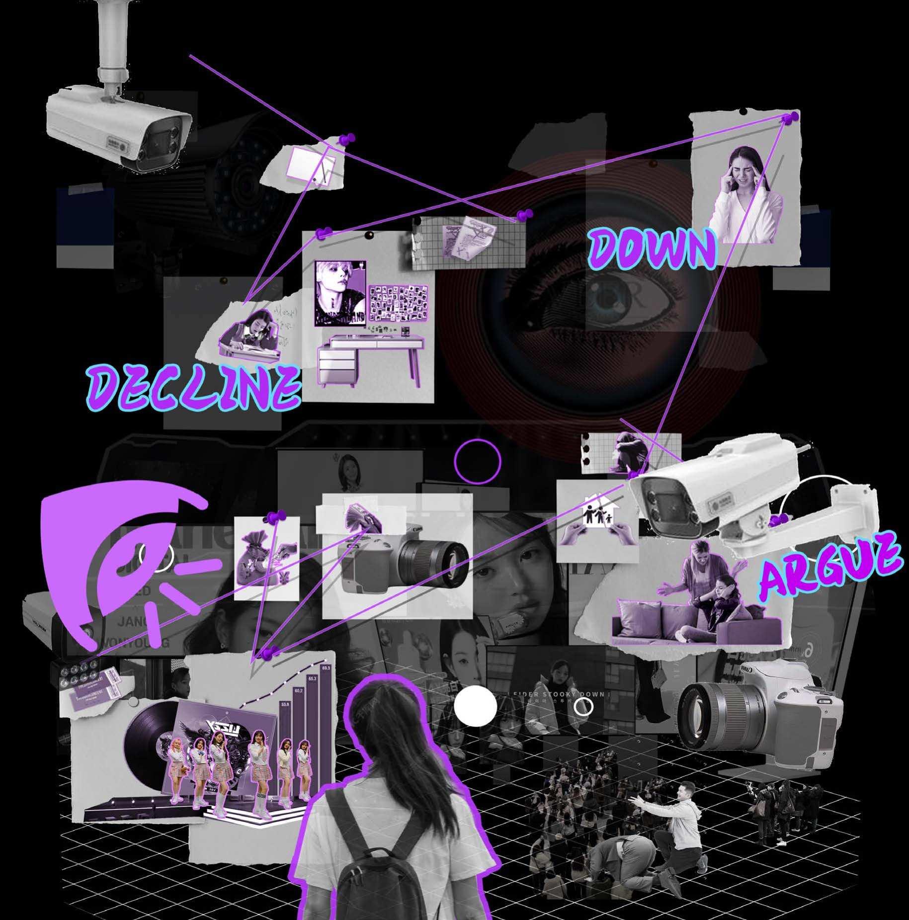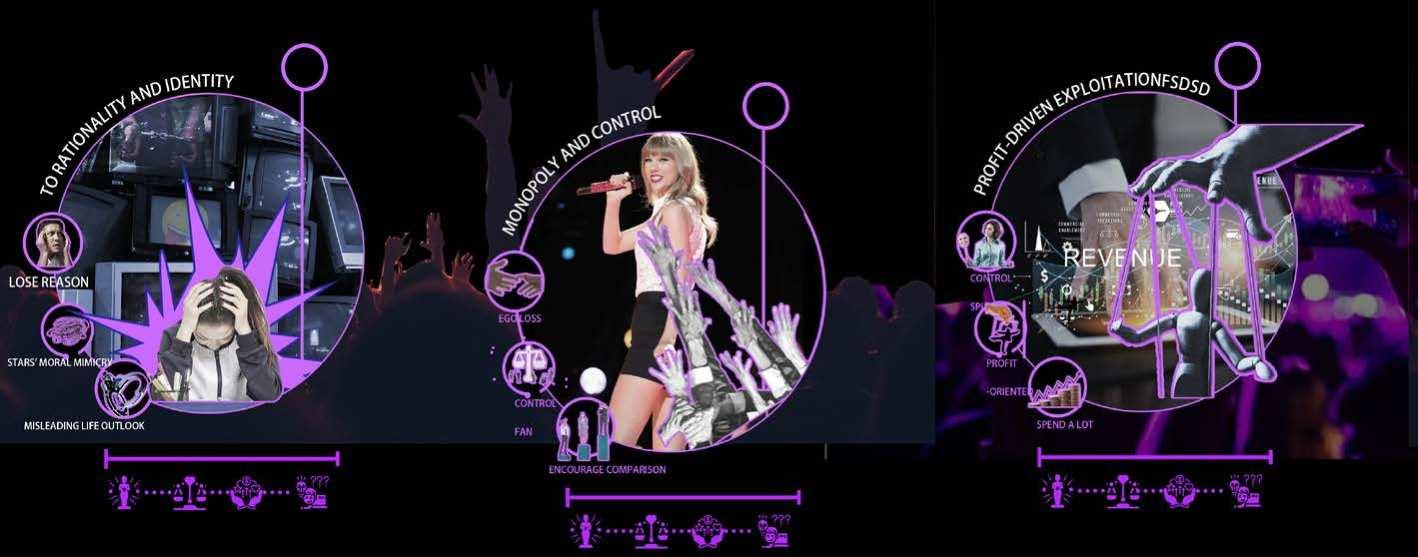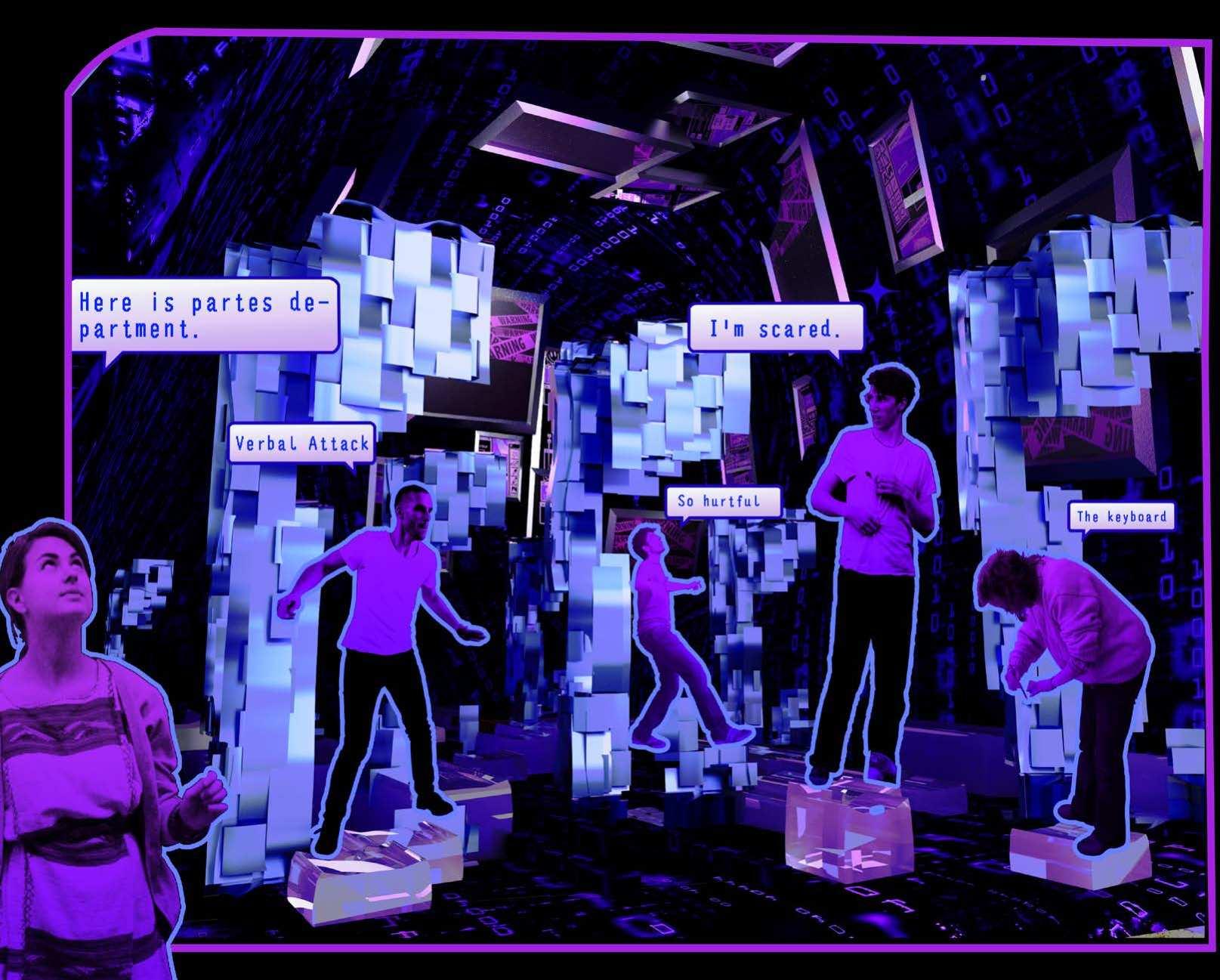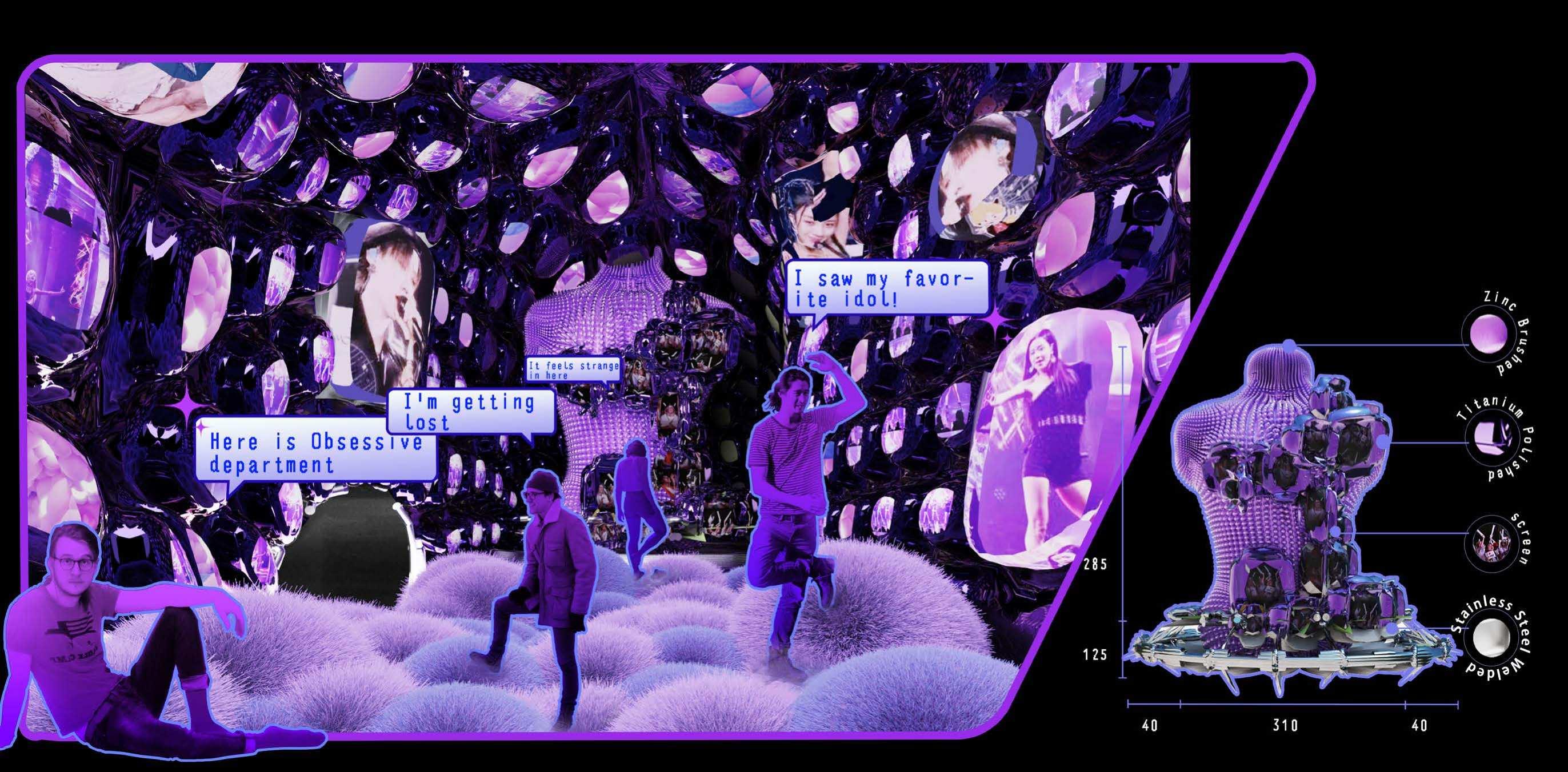 For the combination of five small Spaces, repeated and distorted methods are mainly used to carry out spatial deliberation. This space explores the online violence fans inflict on others in order to protect their idols. It can investigate how some fans engage in online harassment, bullying, or other forms of online violence against people who criticize or express different opinions about their favorite celebrities. Through pixelated cubicles and cyberbullying rhetoric.