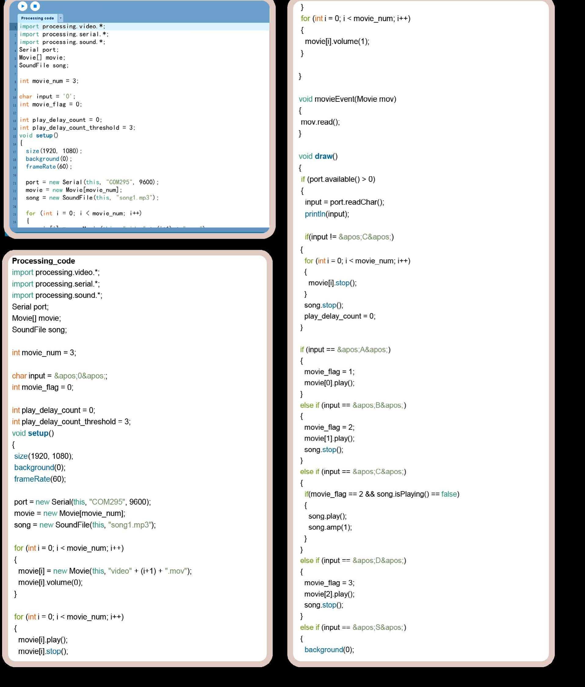 The main logic is to detect the status of various sensors through Arduino, and then send character data to the ensors Arduino, and then send character data to the Processing end through serial port communication. The Processing end controls which video or audio is played or stopped according to the received data.
