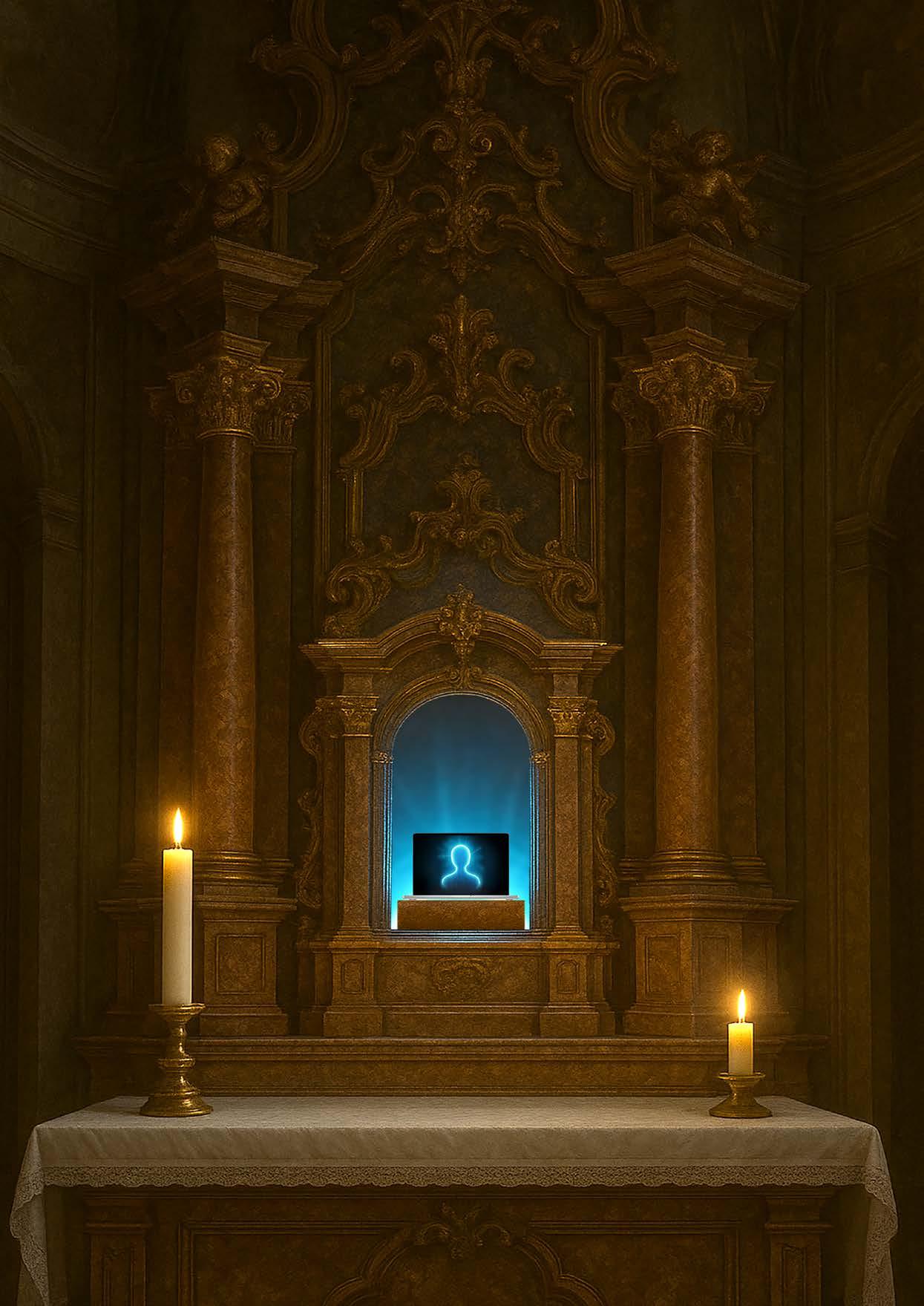 Ersetzt KI bald auch Kelch und Hostie im Tabernakel? Wenn Tech-Milliardäre und KI-Philosophen aus Silcon Valley über die künftige KI-Welt schwärmen, nimmt der Glaube an die erlösende Kraft des Algorithmus tatsächlich religiöse Formen an. Lassen wir uns von diesem Götzendienst nicht verführen. KI kann weder trösten, Schuld vergeben, noch lieben. Zum Segen wird KI nur, wenn wir sie als das nutzen, was sie ist: ein Werkzeug, das weder unser eigenes Denken ersetzt noch unseren Glauben. Das «Allerheiligste» im Tabernakel bleibt uns weiter unverfügbar, das Geheimnis Gottes wird nicht durch KI entschlüsselt. Das Bild wurde mit der KI-Software ChatGPT erstellt.
