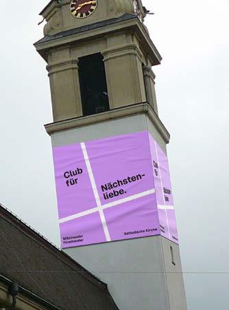 Dazu stellen wir grossformatige Blachen zur Verfügung, die an Kirchtürmen (natürlich auch an anderen kirchlichen Gebäuden) angebracht werden können. Bezüglich Grösse stimmen wir die Bedürfnisse mit den einzelnen Pfarreien ab, auch kann aus verschiedenen Werbebotschaften ausgewählt werden.