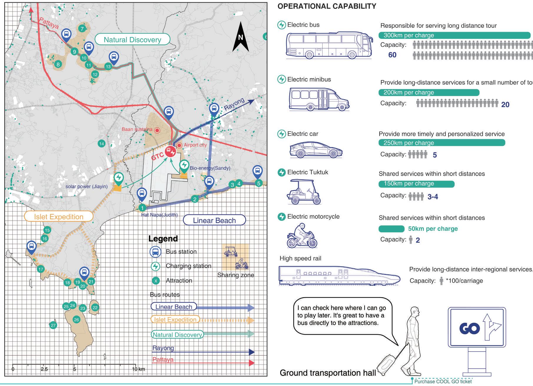 In our vision for the future transportation network near utapao airport, our goal is to establish efficient connections to surrounding unexplored attractions, enhancing the tourist experience through sustainable travel options. Thailand is currently promoting the development of electric vehicles, the EEC can offer support for usage of electric vehicles in the region. And by establishing a public EV transportation network It will significantly reducing carbon emissions from road traffic.Furthermore, due to climate change, the eastern region is forecasted to experience particularly hot and dry conditions. To enhance tourists’ outdoor experience, we will explore passive cooling designs that reduce temperatures without significant energy consumption.