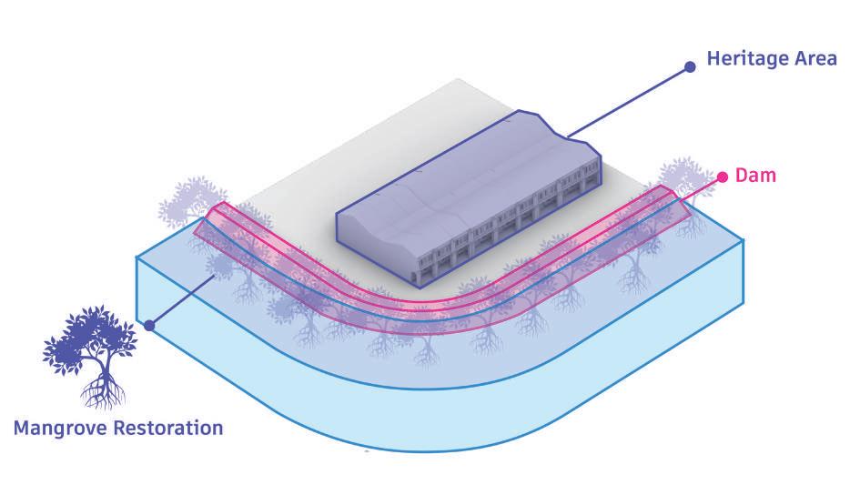 Build a dam to protect the heritage area, incorporating stone piles constructed from recycled bricks on both sides. These piles create a suitable habitat for mangrove growth, enhancing natural coastal defenses while promoting biodiversity.