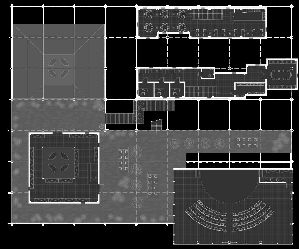 On the second level, two volumes—housing a theater and surrounding retail spaces—are clad in a semi-translucent material for their facades. These are linked by a central staircase atrium.