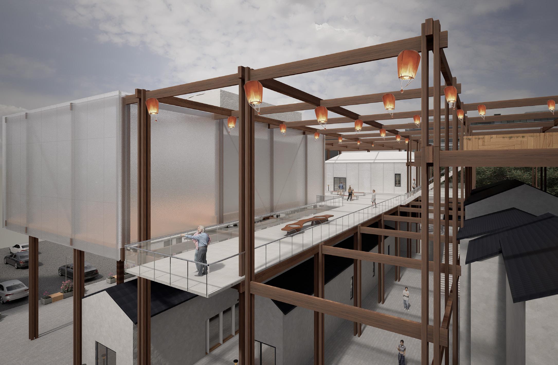 This aerial view illustrates the project’s holistic stance. The semi-transparent theater on the second level draws visitors from the urban plaza. The building’s timber framework aligns with the scale of the ancient town, seamlessly integrating into the fabric of the streets and alleys.