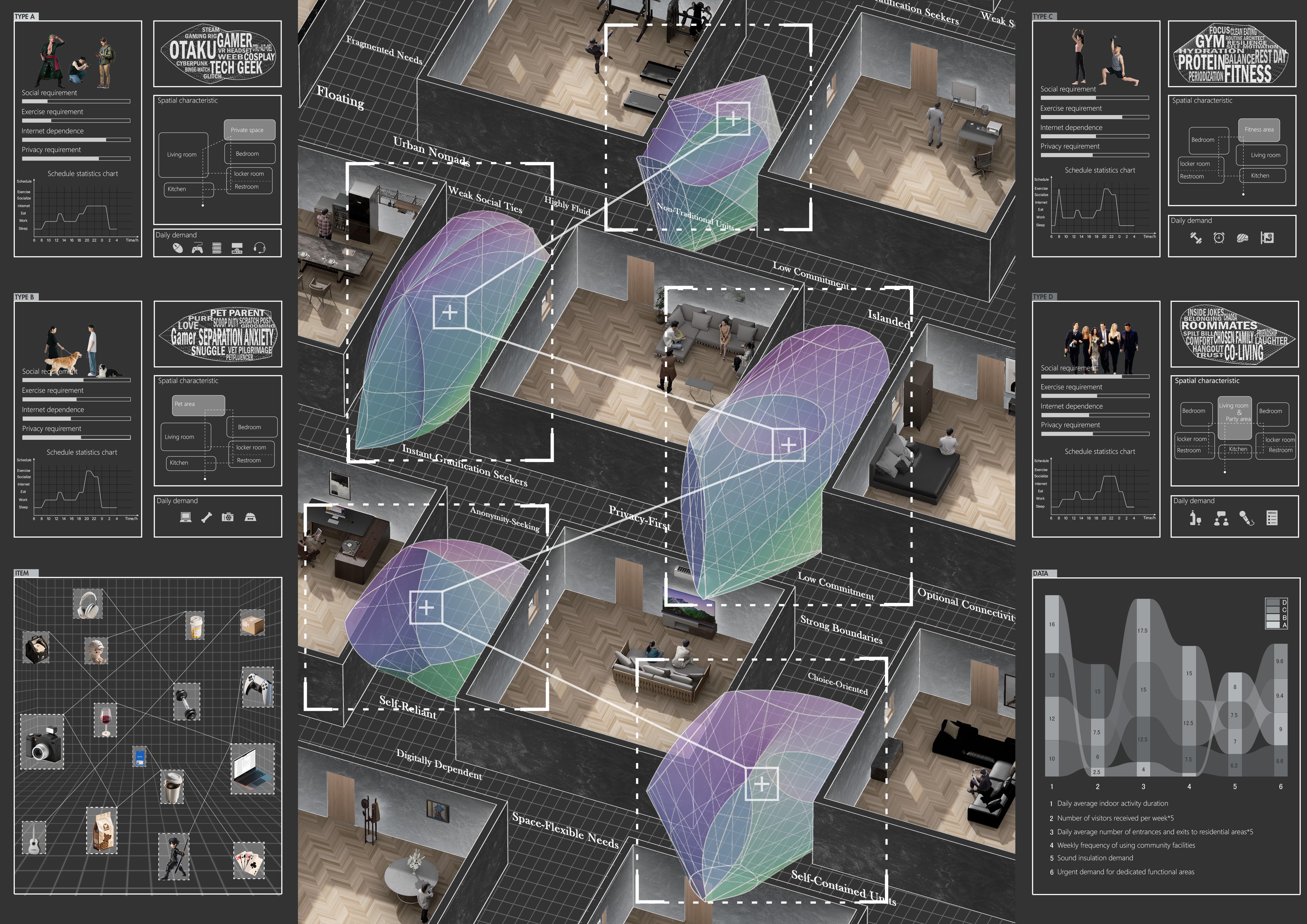 This project is an architectural response to this social condition. Through an indepth analysis of atomized individuals, meticulous site research, and rigorous optimization of apartment functions and circulation, unique “surreal inserted volumes” are introduced to shape the communal spaces. This design breaks through physical and psychological boundaries, aiming to provide a spiritual “second home” for modern individuals who find themselves detached from traditional clan relationships.