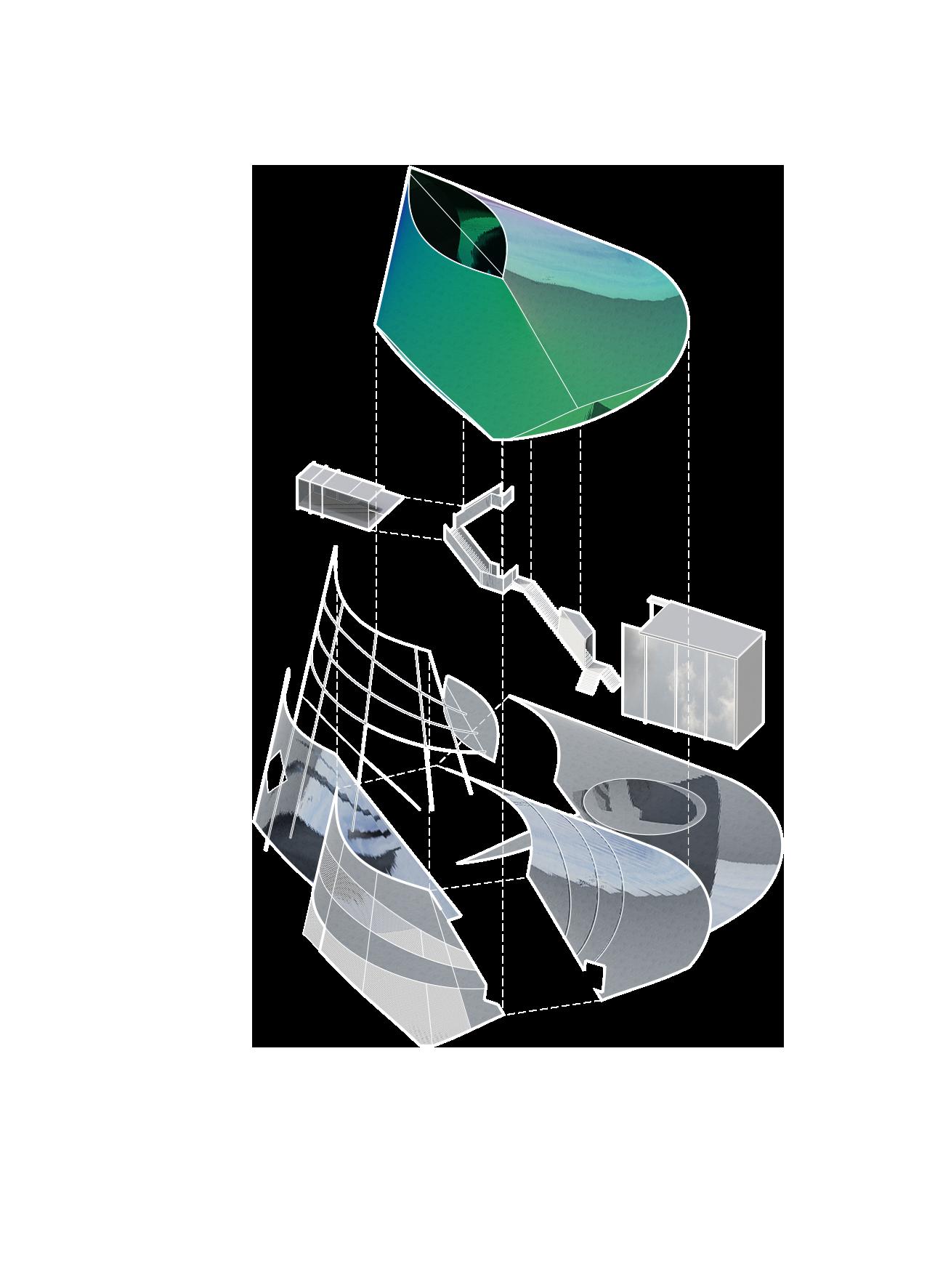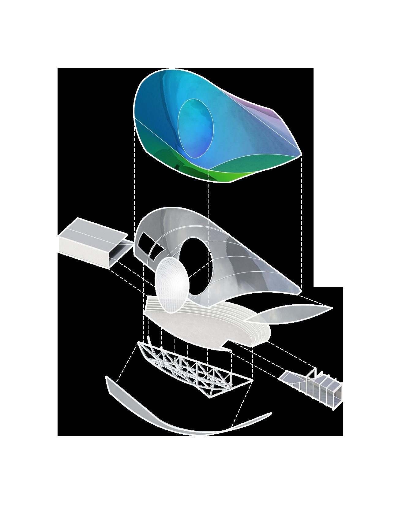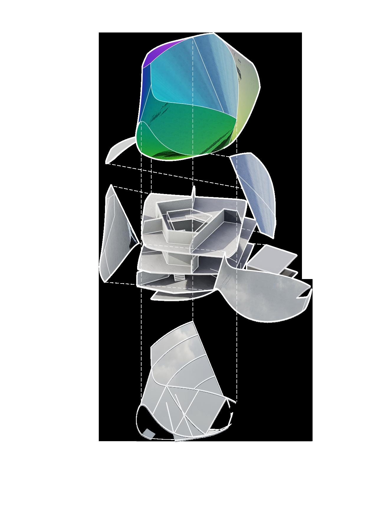 From the exploded axonometric diagram, it is clear that the building is organized into three interconnected levels.