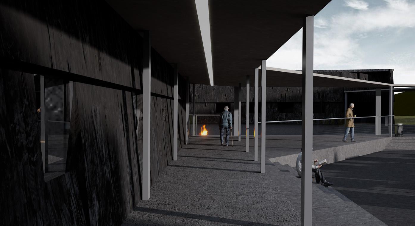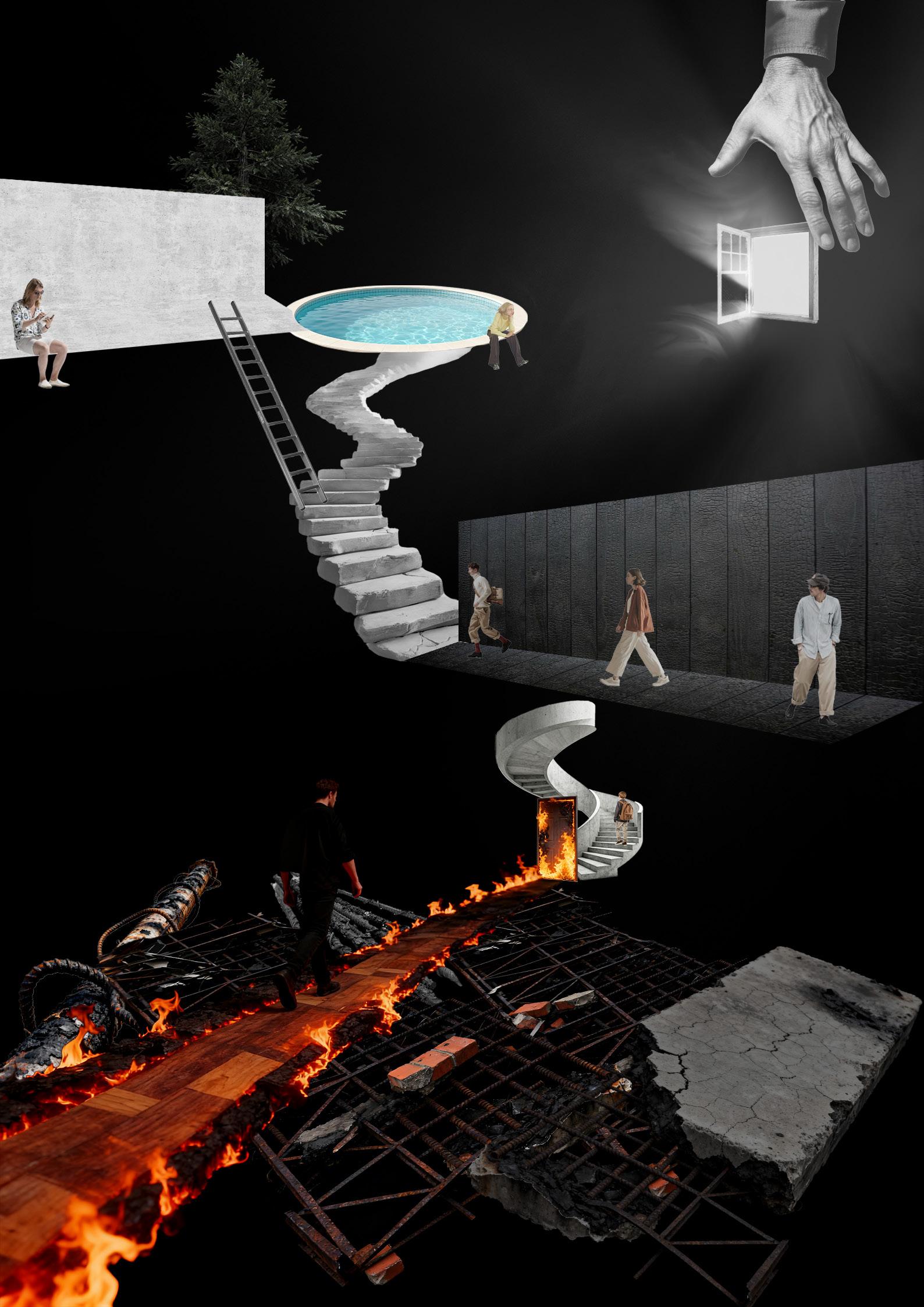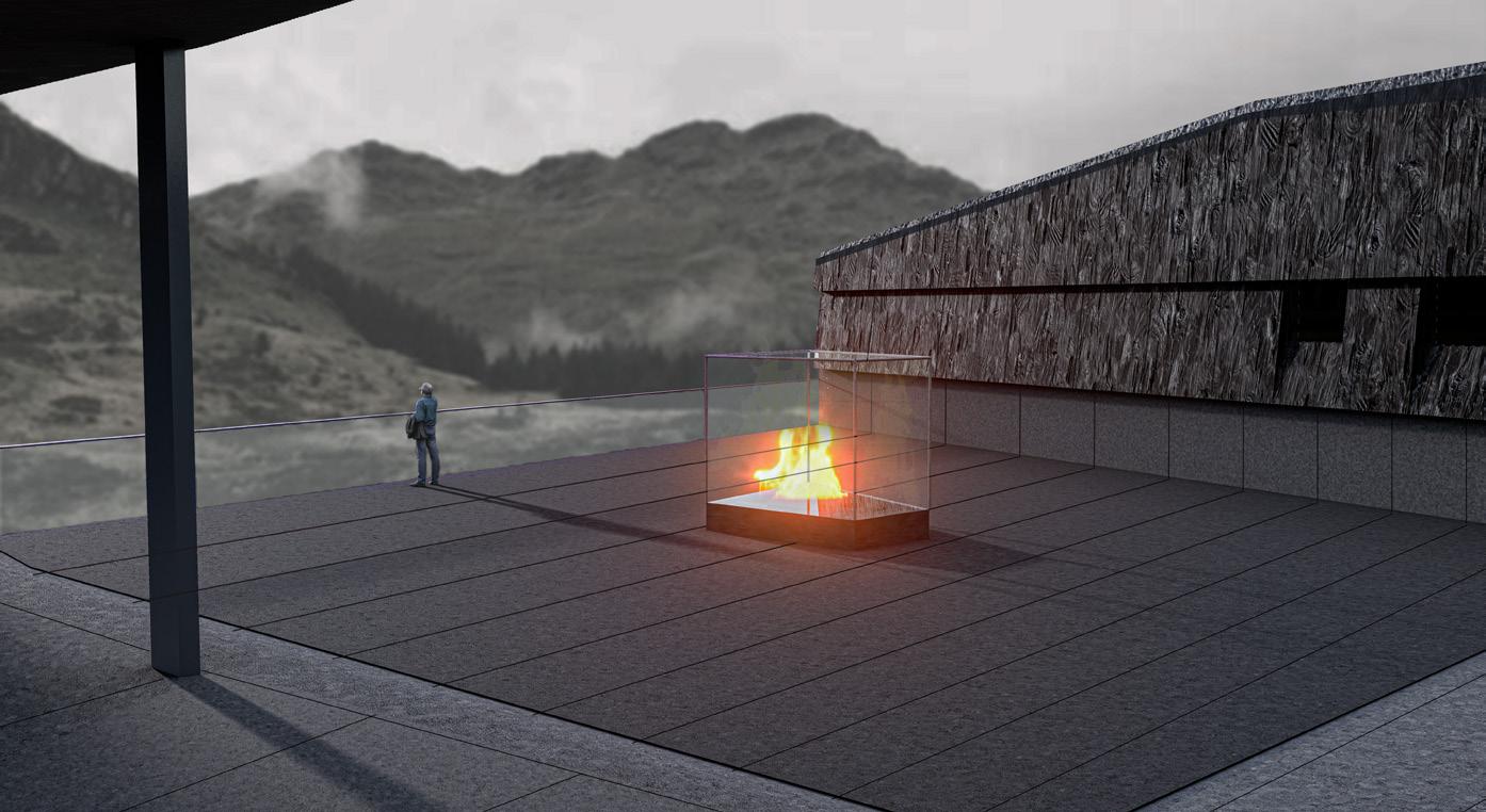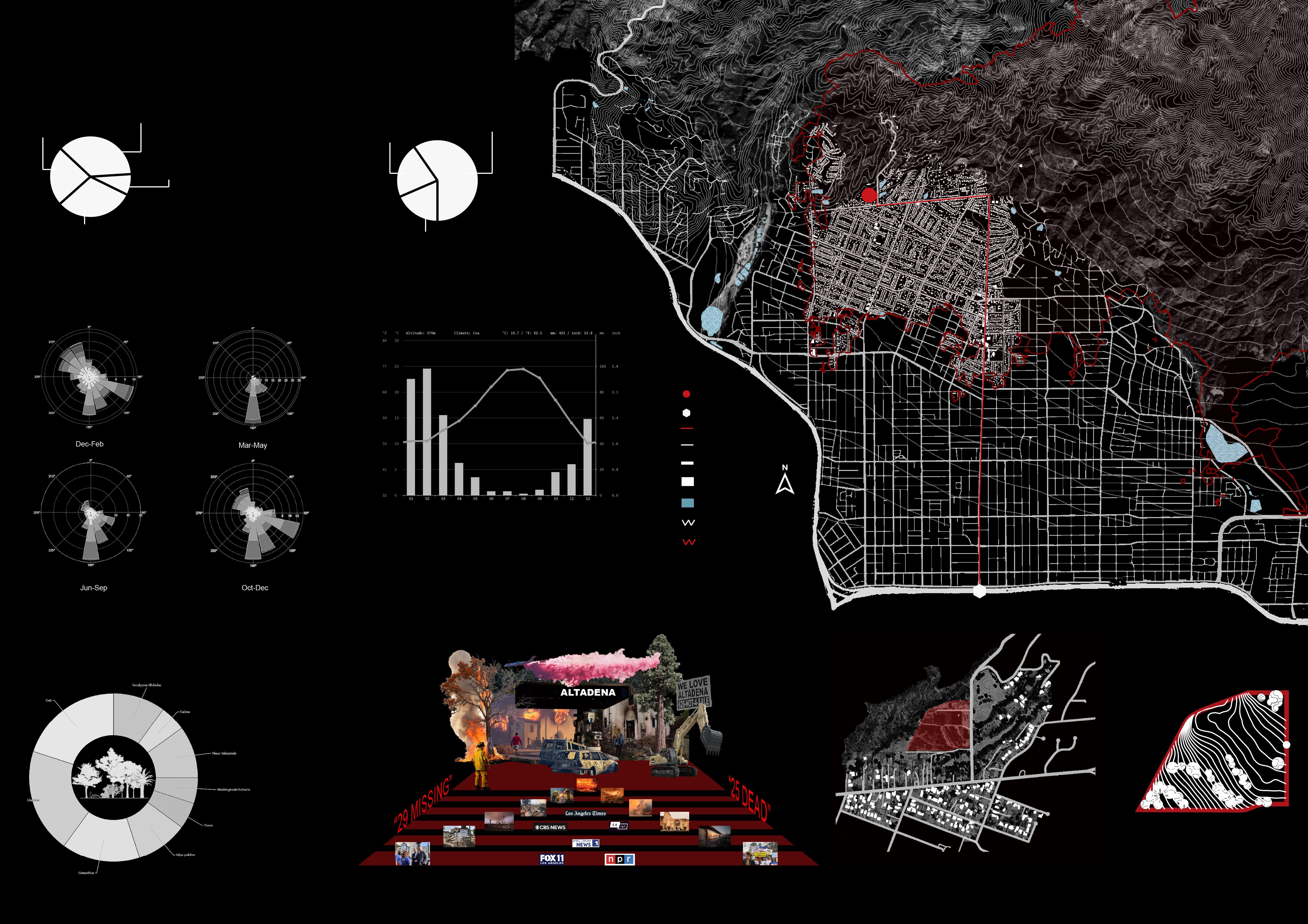 This project proposes a mental health sanctuary in Altadena, conceived as a direct architectural response to the collective trauma of California’s wildfires. The design employs the principles of exposure therapy, materializing the journey from trauma to resilience. The building itself becomes the therapeutic medium. Charred and reclaimed materials, most prominently Shou Sugi Ban, are woven into the fabric of the exterior and initial interior spaces. These elements serve as tangible, yet safe, representations of the fire’s memory. The architectural sequence deliberately guides individuals from compressed, darkened volumes— where light enters through narrow fissures—towards progressively open, lightfilled spaces that seamlessly merge with regenerative landscapes.
