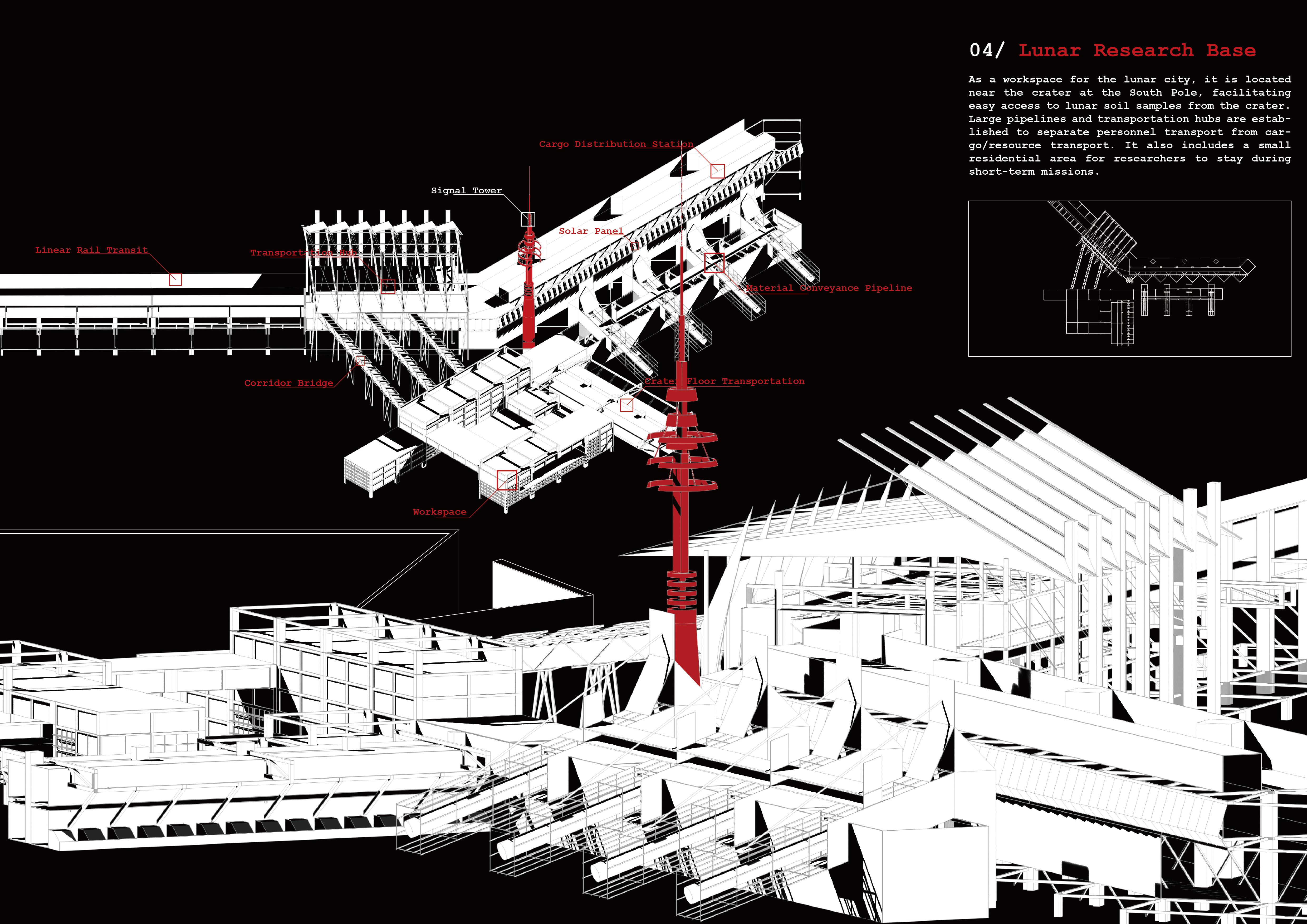 • Based on the concept of linear urban planning, the lunar space station at the lunar south pole is divided into launch and landing zones,residential zones, work zones, and energy supply zones, proposing a conceptual hypothesis for a sustainable and self-sufficient lunarcity.