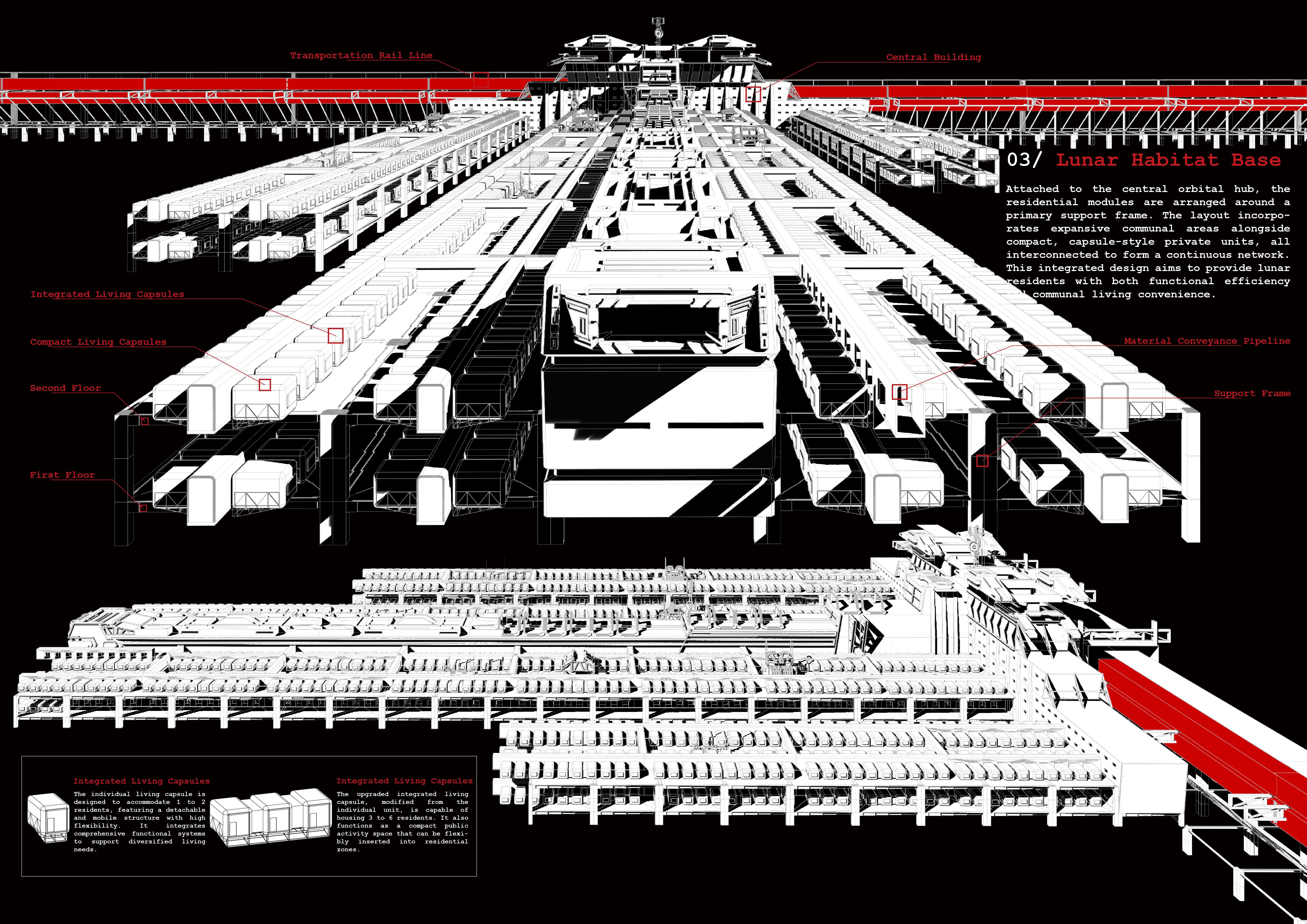 In this project, I was responsible for the design modeling of the residential zone and the creation of the cover “hero image.” From compact living units to largescale residential clusters, I crafted a grand lunar visionary architecture.