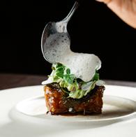 Kalfsfilet met een knapperige kruidenkorst, geserveerd met een aromatische saus van verse tijm (Modern Fine Dining & Friends)