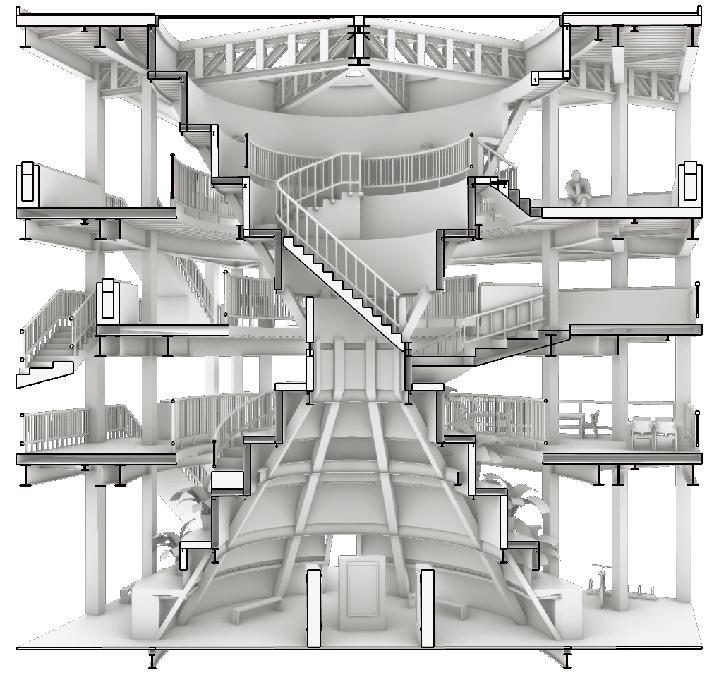 Exploiting the boundaries offset gaps of the floor slabs from the structural components to provide the sufficient space for the secondary circulation in the proposal.
