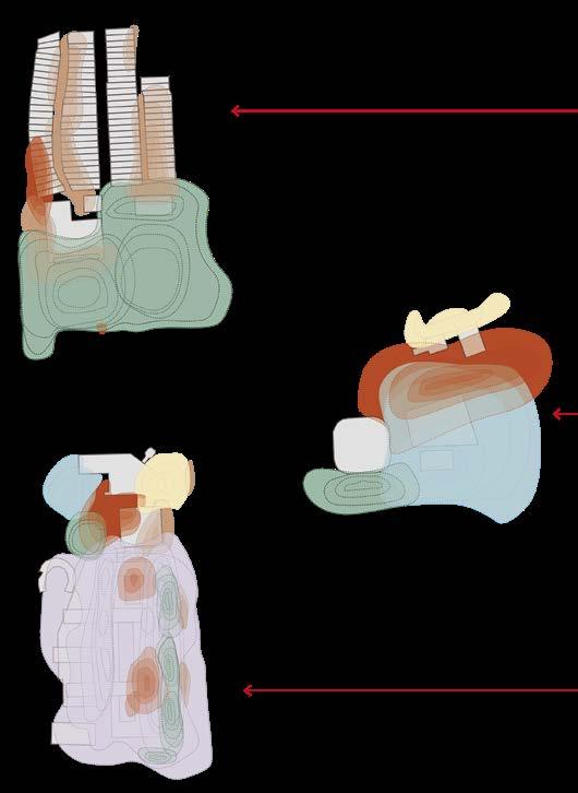 The difference in colour of the structure shows the different independent structural system which are the funnel and the outer plates. The funnel was centralised so as to allow a more structural rigid steel structure as the off-center funnel created an irregular grid which would not structurally work. The funnel structure is grounded through the outer main columns which connects the floor slabs as well.