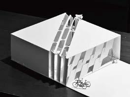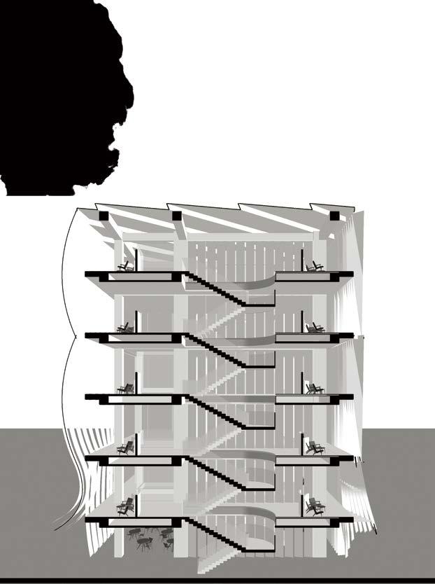 Following the design philosophy of have an extremely porous facade, glass walls were implemented at the more public top and bottom areas to allow vision to the funnel from the outside. Vertical louvres were used at the secondary external circulation to also emphasize a sort of verticality paired with the stairs in the overall design.