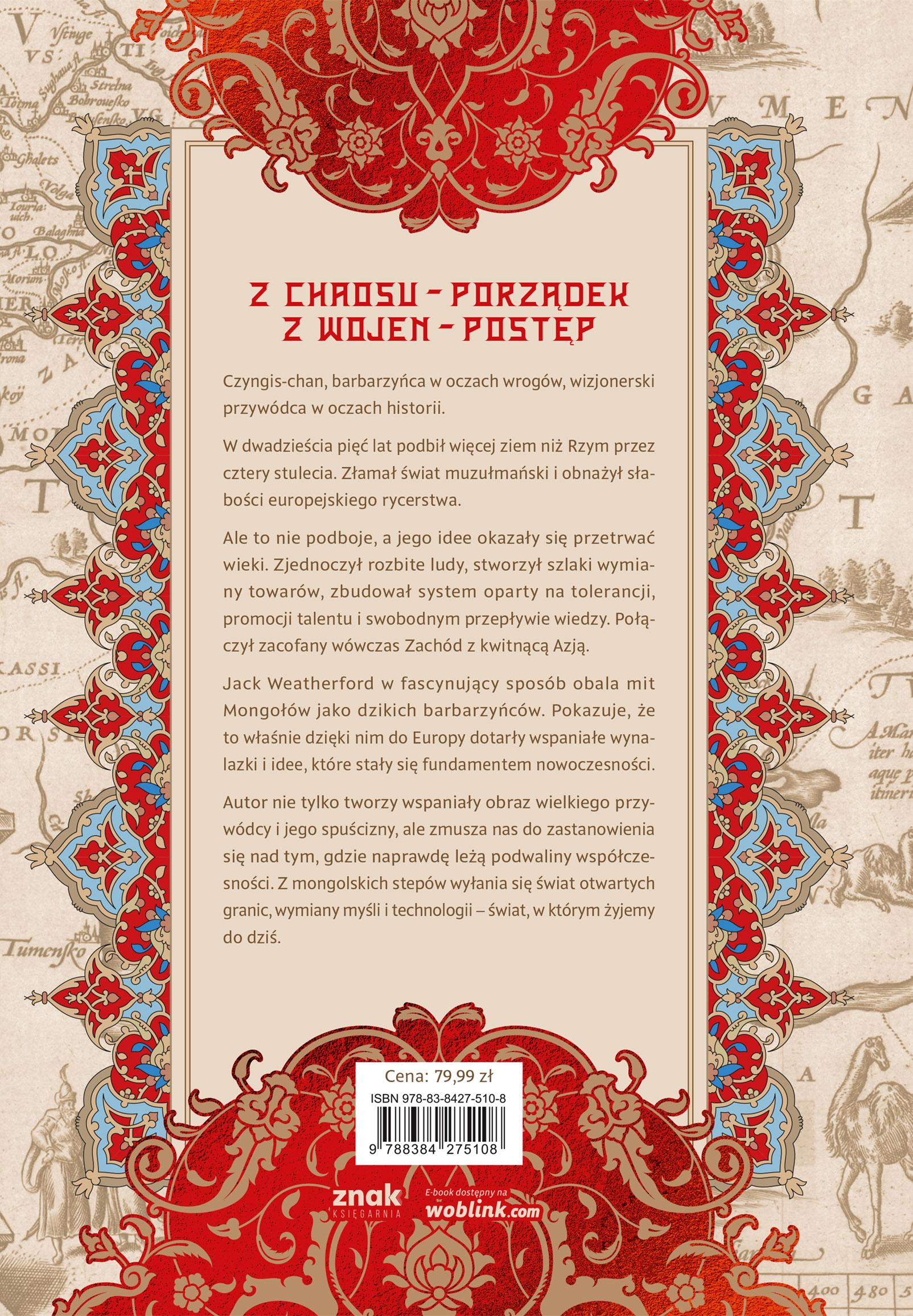 W XIII wieku, w miarę postępów konnicy Czyngis-chana, przesuwały się granice ówczesnego świata, którego tworzywem nie był kamień, lecz ludzie. Czyngis-chan, niezadowolony z mnogości maleńkich królestw, połączył je w większe organizmy państwowe. W Europie Wschodniej Mongołowie zjednoczyli dziesiątki słowiańskich grodów i księstewek w wielkie państwo ruskie. W Azji Wschodniej na przestrzeni trzech pokoleń stworzyli państwo chińskie, łącząc część południowych ziem dynastii Sung, ziemie Dżurdżenów w Mandżurii, Tybet na zachodzie, sąsiadujące z pustynią Gobi królestwo Tangutów i terytoria Ujgurów we wschodnim Turkiestanie. W miarę rozszerzania granic imperium powołali do życia Koreę oraz Indie, które przetrwały po dziś dzień niemal w takich samych granicach, jakie narzucili im mongolscy zdobywcy. Imperium Czyngis-chana złączyło rozmaite cywilizacje, tworząc nowy porządek świata. W chwili narodzin wodza w 1162 roku w skład Starego Świata wchodził szereg kręgów cywilizacyjnych o regionalnym znaczeniu, których wiedza o innych kulturach ograniczała się do znajomości tradycji najbliższych sąsiadów. Nikt w Chinach nie słyszał o Europie, nikt w Europie nie słyszał o Chinach – o ile nam wiadomo, nikt nie przedsiębrał tak dalekich podróży. Zanim umarł w 1227 roku, Czyngis-chan zdążył zbudować między Europą a Chinami sieć kontaktów dyplomatycznych i handlowych, które przetrwały do dziś.