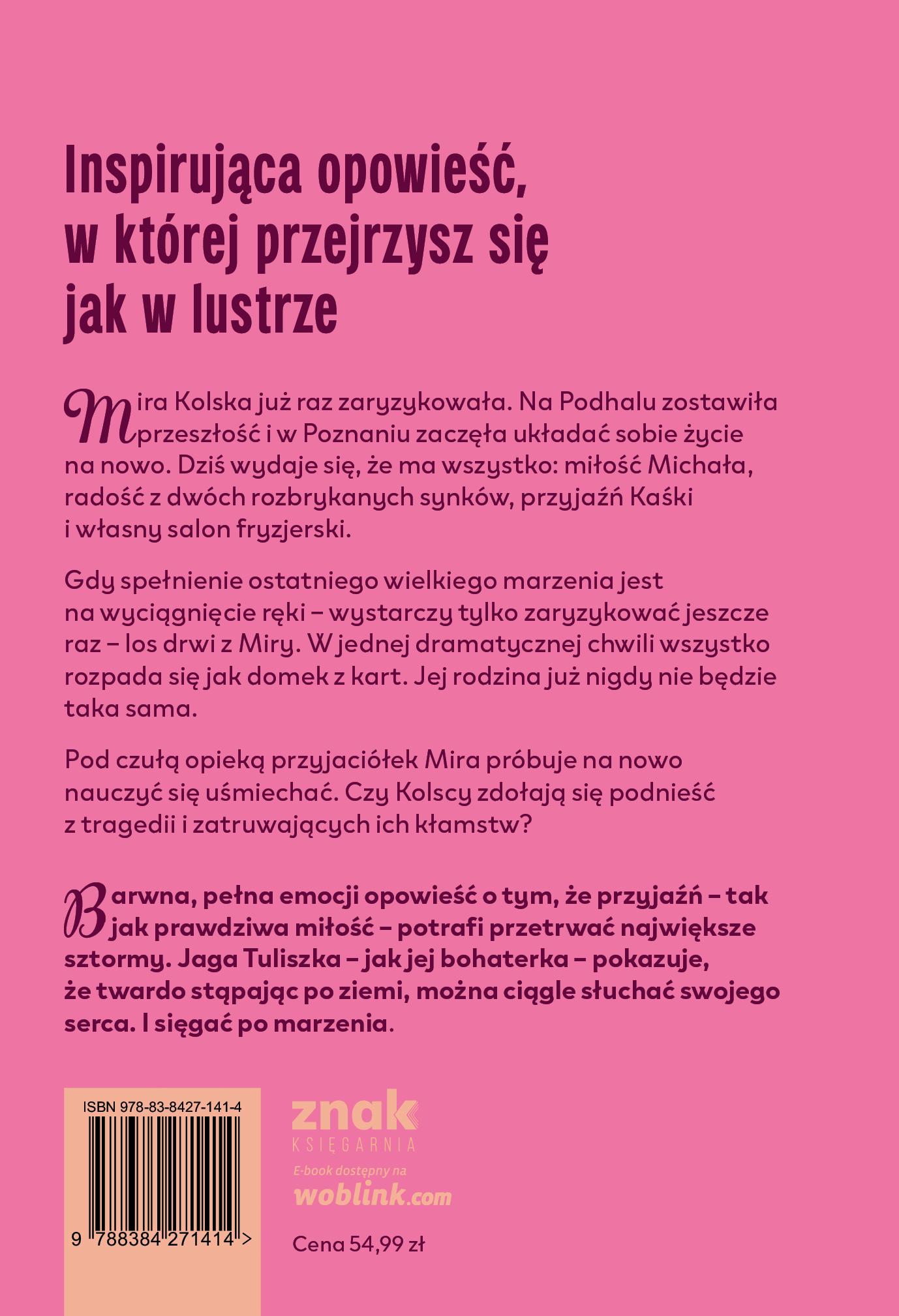 Mira stała na szeroko rozstawionych nogach, próbując tak się ustawić, aby zminimalizować narastający ból kręgosłupa. Wiedziała, że to niewiele zmieni, ale delikatne kołysanie się na boki pozwalało jej przetrwać niewygody pracy. Od kilku godzin nieprzerwanie trwała przy swoim stanowisku w maleńkim salonie fryzjerskim. Choć była jego właścicielką, wciąż czuła się jak wyrobnica, zatrudniona na kiepskich warunkach do przeróżnych zajęć. Stale wszystko było na jej głowie, począwszy od zamiatania włosów i prania ręczników, przez zamawianie towaru i parzenie kawy, aż po wszelkie opłaty i planowanie grafiku. Głowa ciągle pracowała na równi z ciałem. Nawet gdy Mira kładła się spać, nadal analizowała, czy wystarczy jej szamponów i pelerynek, czy kupiła mleczko do kawy dla klientek i czy w toalecie wisi papier toaletowy. Nawijała na szczotkę kolejne pasma krótko ostrzyżonych włosów starszej pani z sąsiedztwa. Suszarka leniwym strumieniem utrwalała każdy lok. Mira bardzo chciała przyśpieszyć,