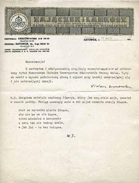 Będę go nosić z wysoko podniesioną głową i używać przy każdej nadarzającej się i nie nadarzającej okazji. Wisława Szymborska PS Załączam ostatnio napisany limeryk, który jak wszystkie moje, powstał w czasie podróży. Pociąg unoszący mnie w dal mijał właśnie stację Słupca. Jest na sprzedaż miasto Słupca, / ale nie ma na nie kupca, / toteż młodzież w karnawale / z żalu tam nie tańczy wcale, / a jak już – to bez hołubca”. List napisany był na przedwojennym papierze firmowym Fabrycznego Składu Sukna i Wyrobów Wełnianych „Zajączek i Lankosz”.