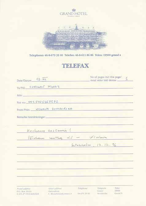 Lata 90. to epoka faksów. Pani Wisława wysyłała ze Sztokholmu faksy z pozdrowieniami do przyjaciół i znajomych