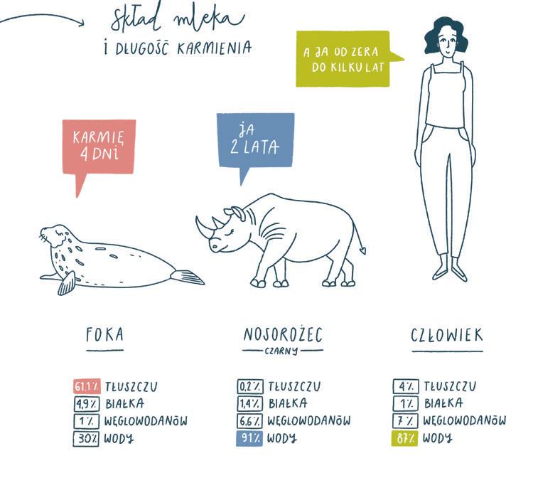 W zależności od tego, czy zwierzęta rozwijały się w wodzie, na lądzie, w klimacie ciepłym czy zimnym, ewolucja poprowadziła laktację różnymi ścieżkami. Zmieniały się zarówno skład mleka, długość i częstotliwość karmienia, jak i sposób opieki nad potomstwem. Zawsze jednak te rzeczy były ze sobą ściśle powiązane. Dziś ssaki, które wytwarzają bardziej rozwodnione mleko, z reguły karmią swoje małe dłużej (Skibiel i in. 2013). Na przykład mleko nosorożca czarnego zawiera śladowe ilości tłuszczu i białka, dzięki czemu matka może karmić młode aż dwa lata. Zgoła inaczej jest w przypadku kapturnika morskiego – foki, która od urodzenia ma dostęp do pokarmu o zawartości tłuszczu przypominającej bardziej serek mascarpone niż mleko. Tu karmienie trwa jedynie cztery dni, ale w tym czasie małe wypijają aż 30 litrów i każdego dnia przybierają na wadze aż 7 kilogramów.