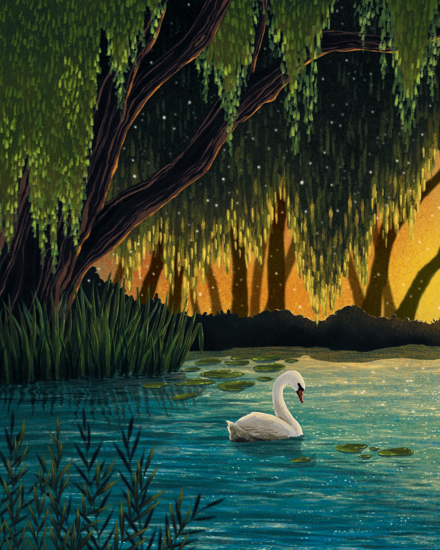 Minęliśmy mokradła, ale dalej czeka nas jeszcze więcej wody. Zbliżamy się do jeziora. Zobaczcie, jak jego tafla mieni się w zachodzącym słońcu! I błyszczą się też ważki latające nad powierzchnią. Aż kusi, żeby zejść niżej, na piaszczysty brzeg, zdjąć buty i trochę się potaplać! Ale lepiej nie podchodźcie za blisko. Okolice wody to ulubione miejsce wielu stworów!