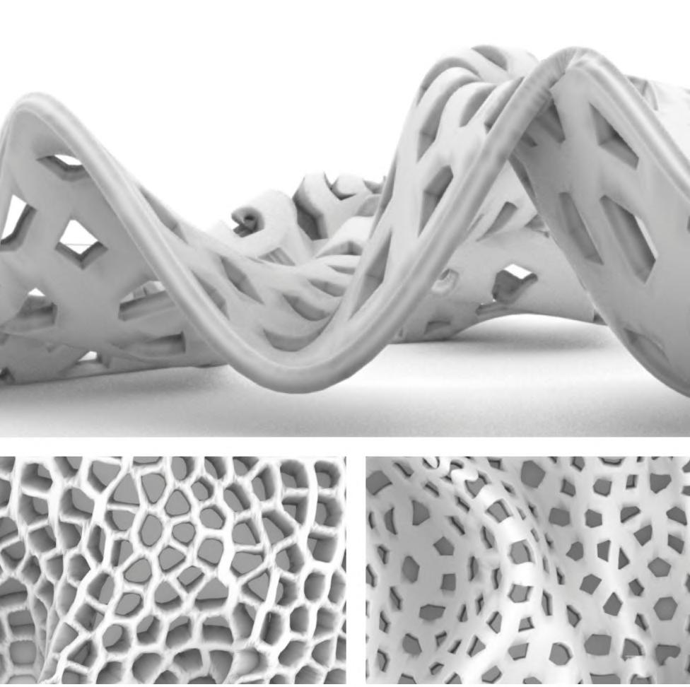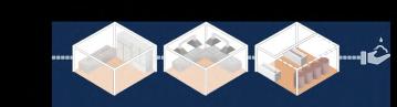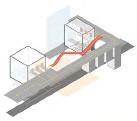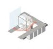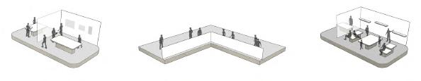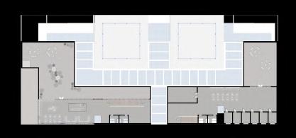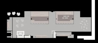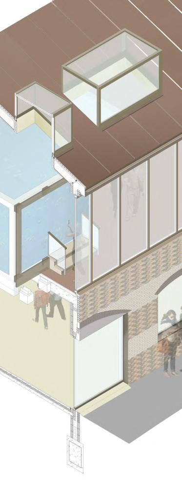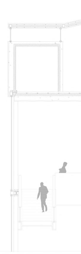 The wall design draws from Victorian “hit-andmiss” sleeper walls and the rolling technique of 18th-century Calico printing. Constructed with durable precast concrete, it connects to the firstfloor railing, enhancing spatial continuity. A rolling rack system behind the wall allows staff access and invites public interaction for textile drop-offs.