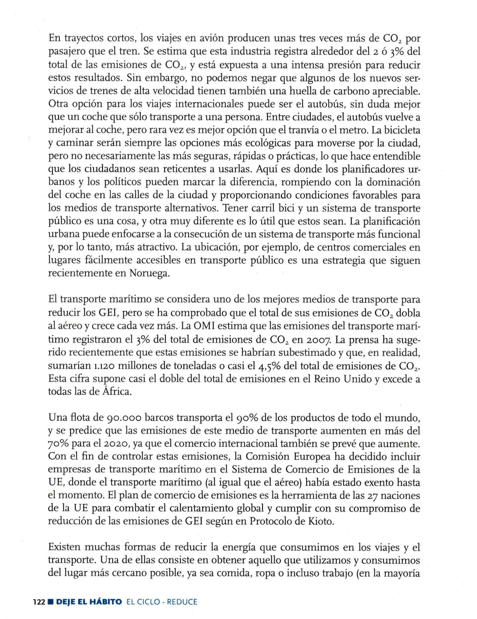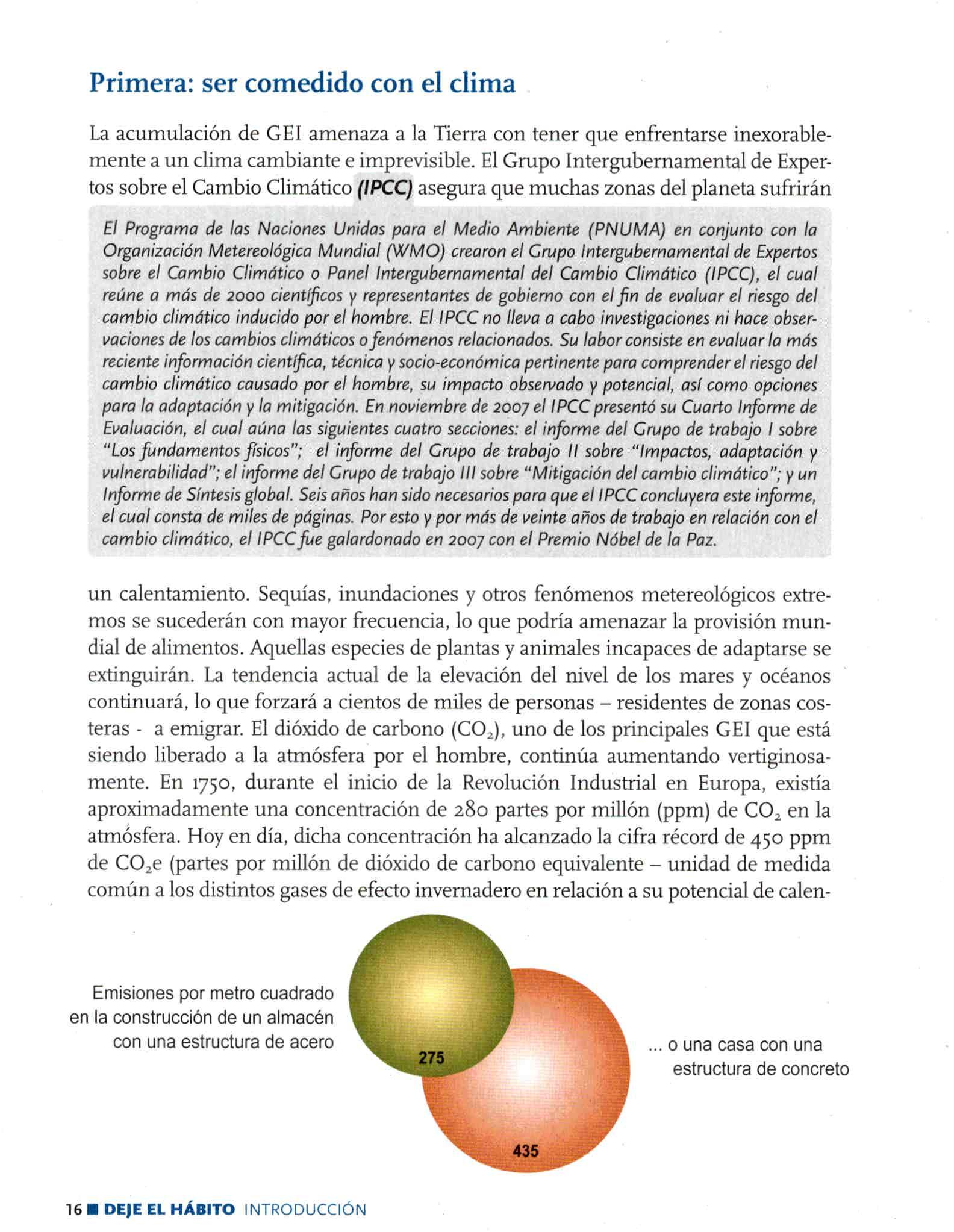 Deje el Hábito la analogía con un régimen alimenticio es apropiada: el compromiso de intentar perder peso se asemeja bastante a lo que se requiere para llegar a ser climáticamente neutro. Debemos dejar el hábito de liberar grandes cantidades de GEI. Por supuesto, nadie inicia una dieta sólo por diversión, sino que con la esperanza de conseguir algo que de verdad merezca la pena tal vez, tener una imagen más delgada y sexy, o simplemente por una cuestión de supervivencia. Además, los regímenes nos recuerdan que tienen algo más en común con la reducción de GEI: no se trata de un suceso puntual, sino que de un proceso. Nadie se somete a un régimen y pierde peso para regresar después a su antiguo estilo de vida por lo menos, sin comprobar que todos sus esfuerzos habrán sido en vano. Así que, reducir el innecesario consumo que subyace detrás de las emisiones de GEl generadas por mucha gente no es una cuestión