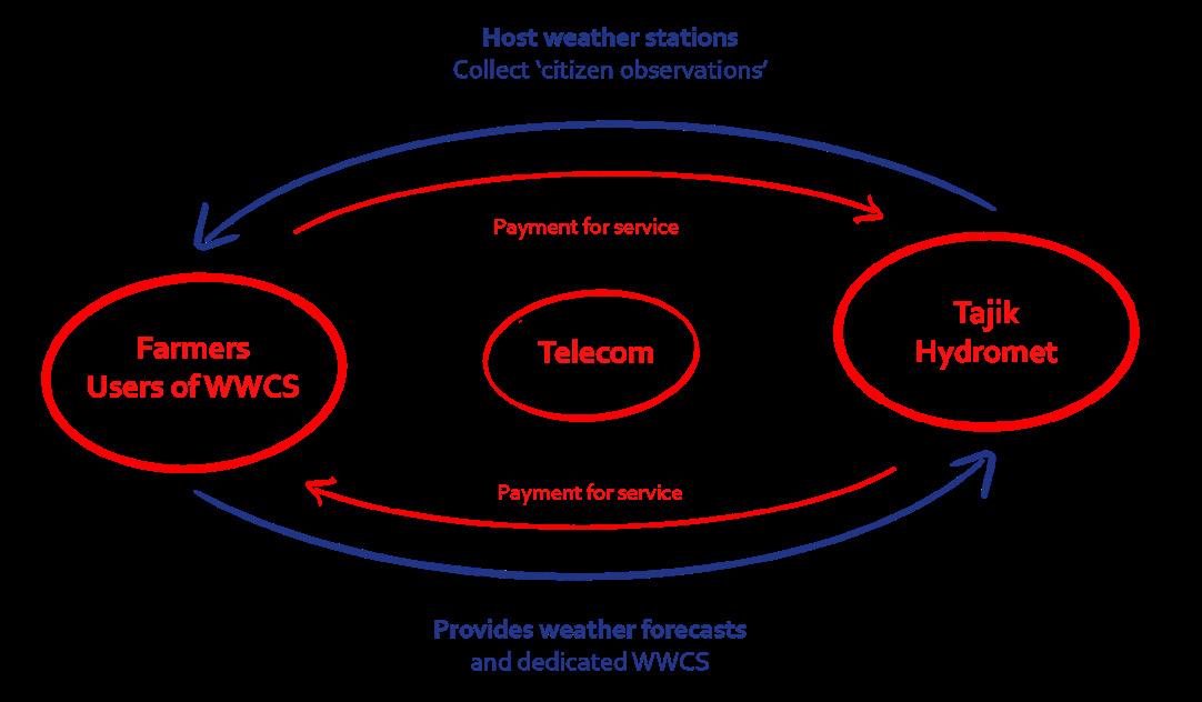 The starting point of any WWCS development is user needs and requirements. As shown in Figure 3, there is a wide range of potential users of WWCS. NGOs often work in remote and underserved areas and in very diverse sectors such as agriculture, health and education. An NGO aiming to strengthen WWCS as one of its activities must also assess the information needs of the sector where those services will be applied at an initial stage of project planning. Service users must also be aware that the services are needed to improve their livelihoods and resilience. Engaging with users is critical to foster acceptance and trust and to transform them into active stakeholders, potentially even contributing to data collection. Further, a thorough assessment of the value cycle is also crucial to identify bottlenecks in delivering the relevant services.