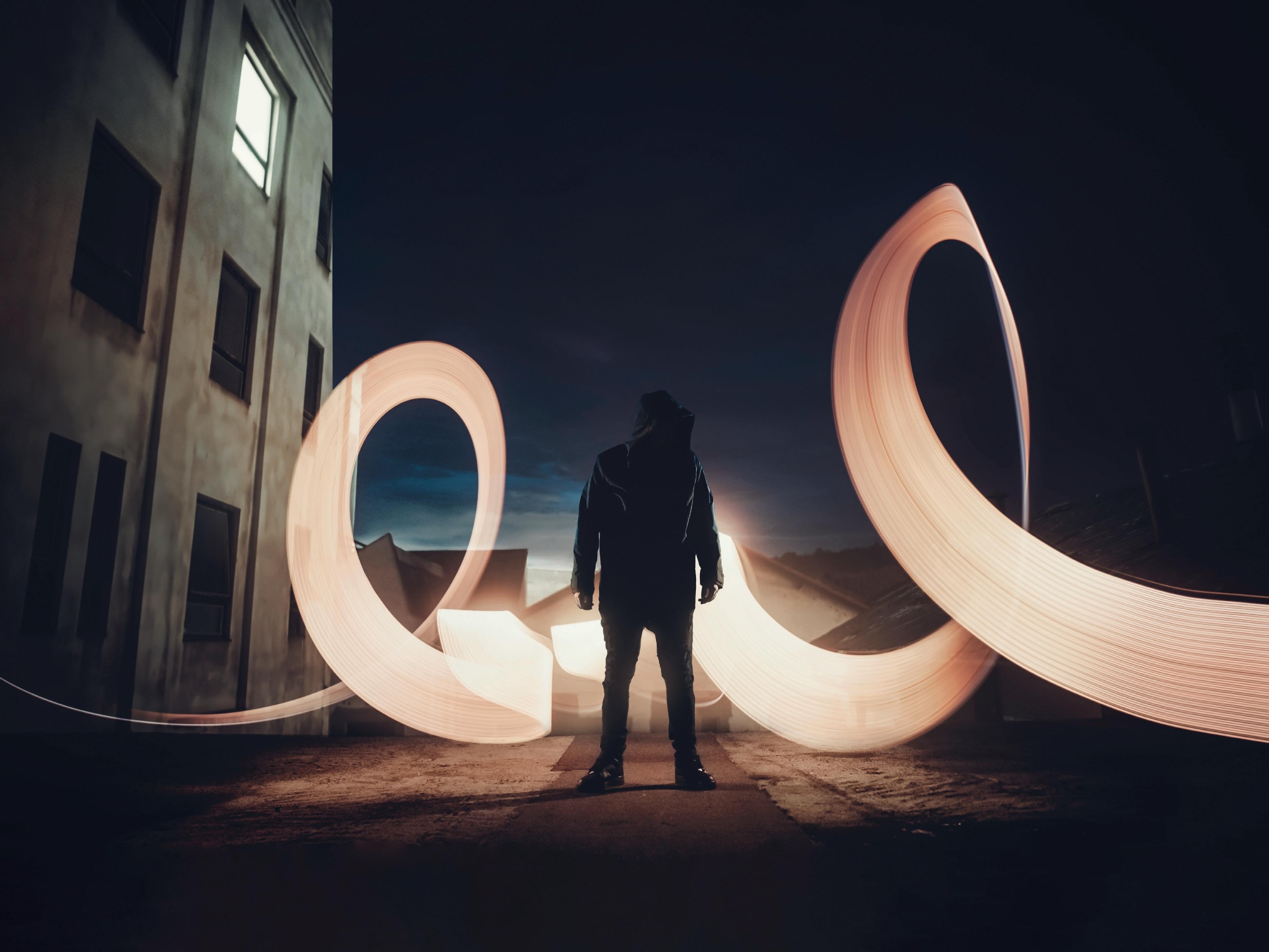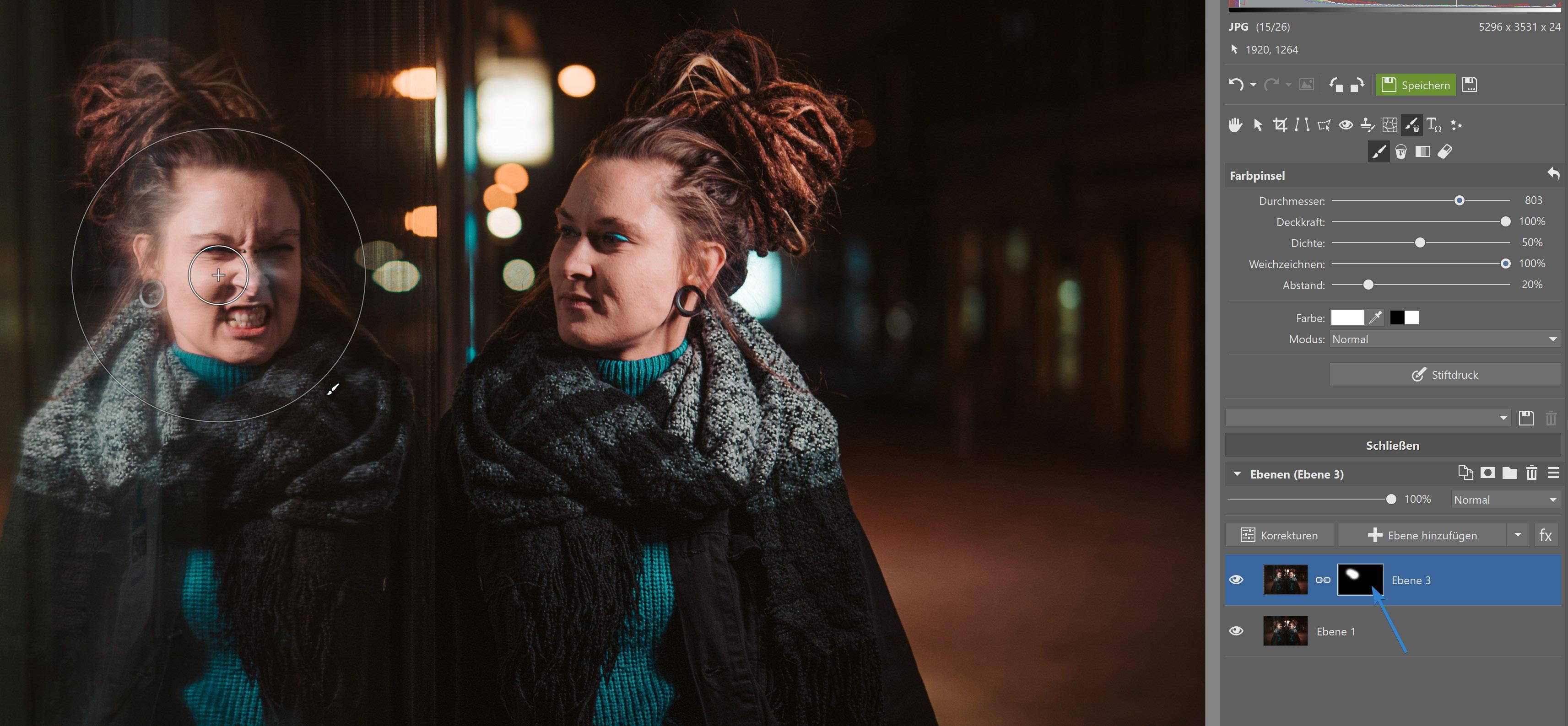 Die Meisten wären hier schon zufrieden, doch wir gehen mit der Bearbeitung noch eine Stufe weiter. Jetzt befindet sich der gesamte Effekt vor dem Porträt. Wenn Sie aber ein wenig Maskierung verwenden, können Sie einen Effekt erzeugen, der um die Person herumgeht, sodass ein Teil des Effekts hinter der Person liegt und der Rest vor ihr.